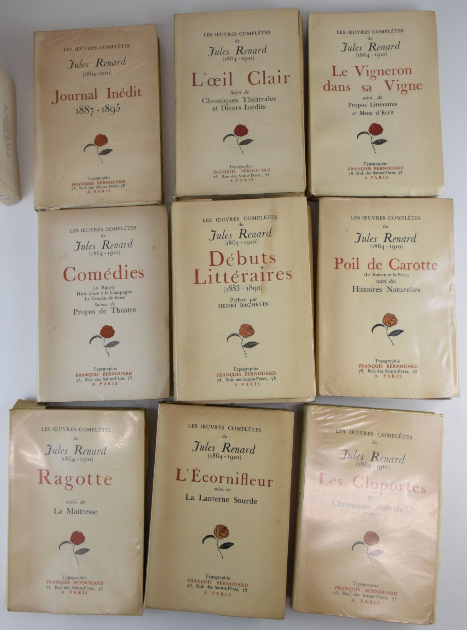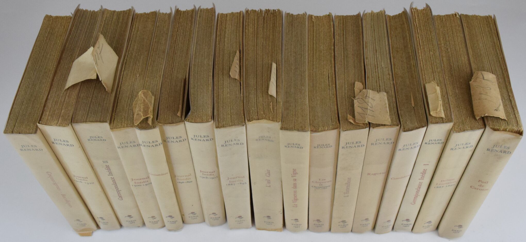 RENARD, Jules. Les oeuvres complètes de Jules Renard (1864-1910). Paris, Typographie François Bernouard, 1925 17 volumes 212 x 145 mm. Edition of 1500 (+ 50) numbered copies, 1 of 1240 copies on laid paper. Paperback, good condition.