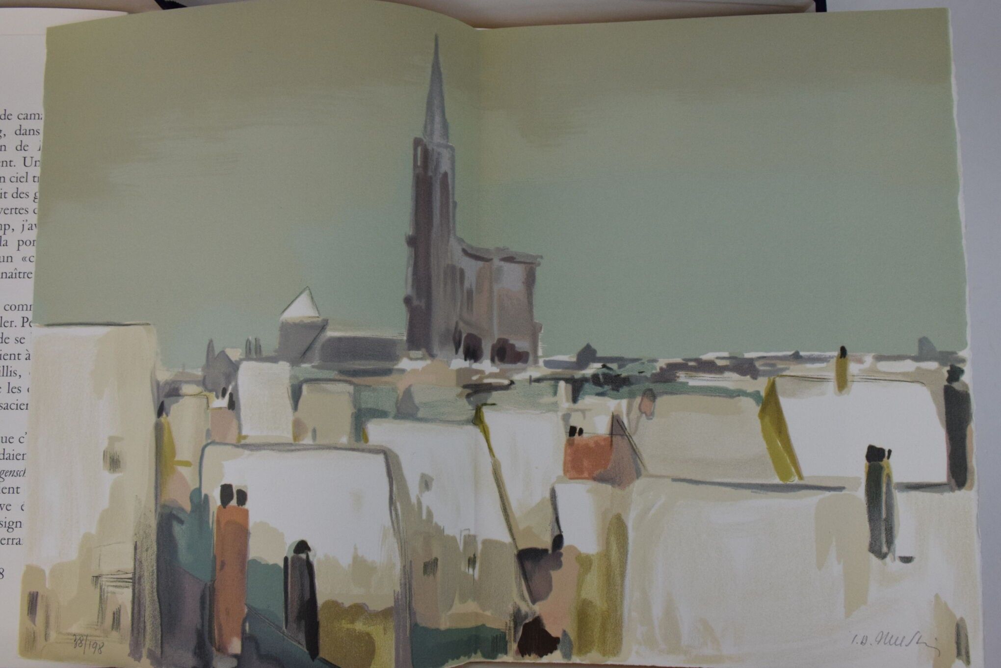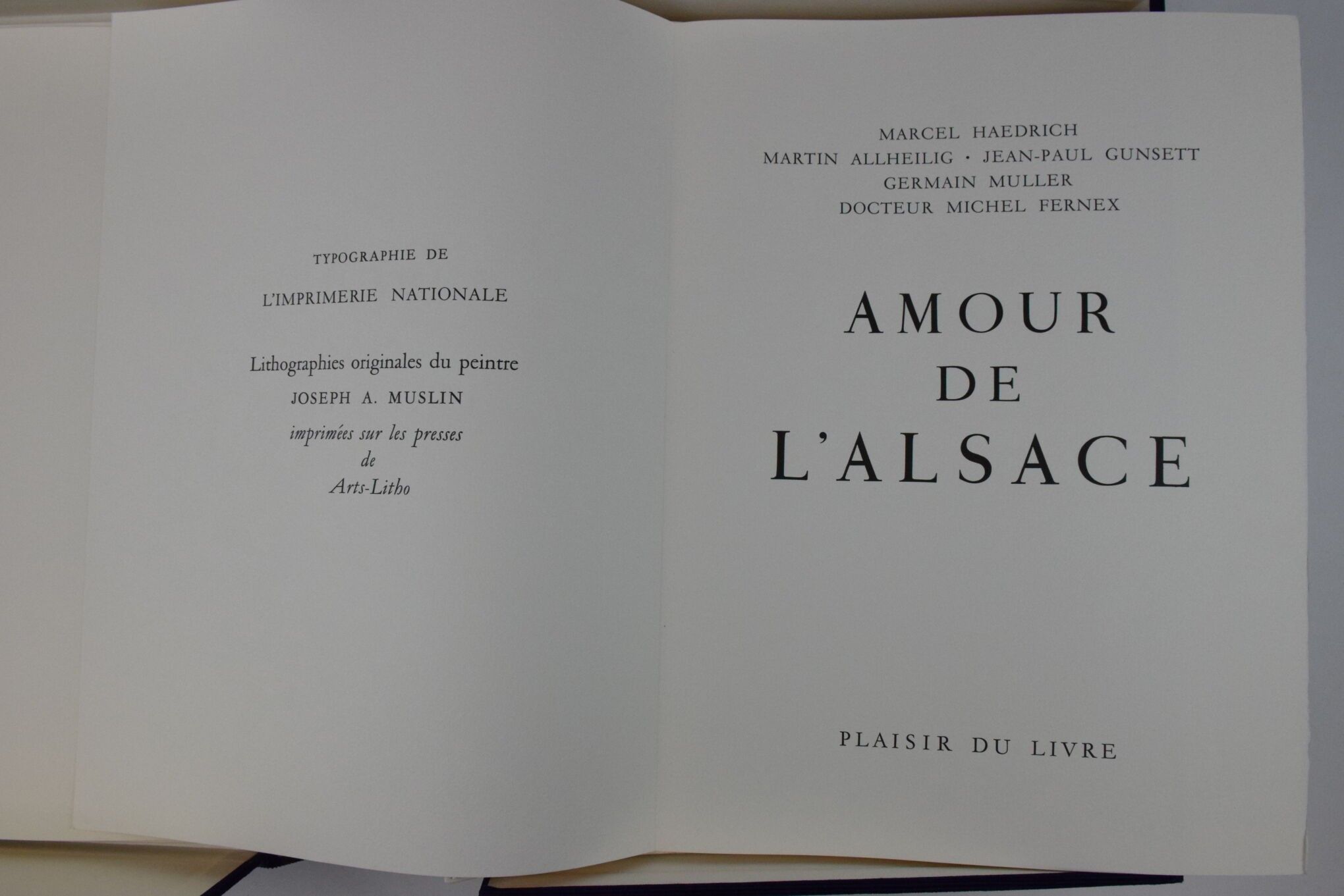 HAEDRICH, Marcel - MUSLIN, Joseph A. Amour de l'alsace. Plaisir du Livre, 1977. In-folio, (4 bl.)-200-(4 bl.) pp. illustrated with 12 original double-page lithographs in colour by Joseph A. Muslin, justified and signed by the artist, limited edition of 228 copies, 1 of 60 on Arches vellum without the suite announced in the explanatory notes. Leaves in filled cover and velvet publisher's box. Texts by Marcel Haedrich, Martin Allheilig, Jean-Paul Gunsett, Germain Muller and Dr Michel Fernex. A fine copy.