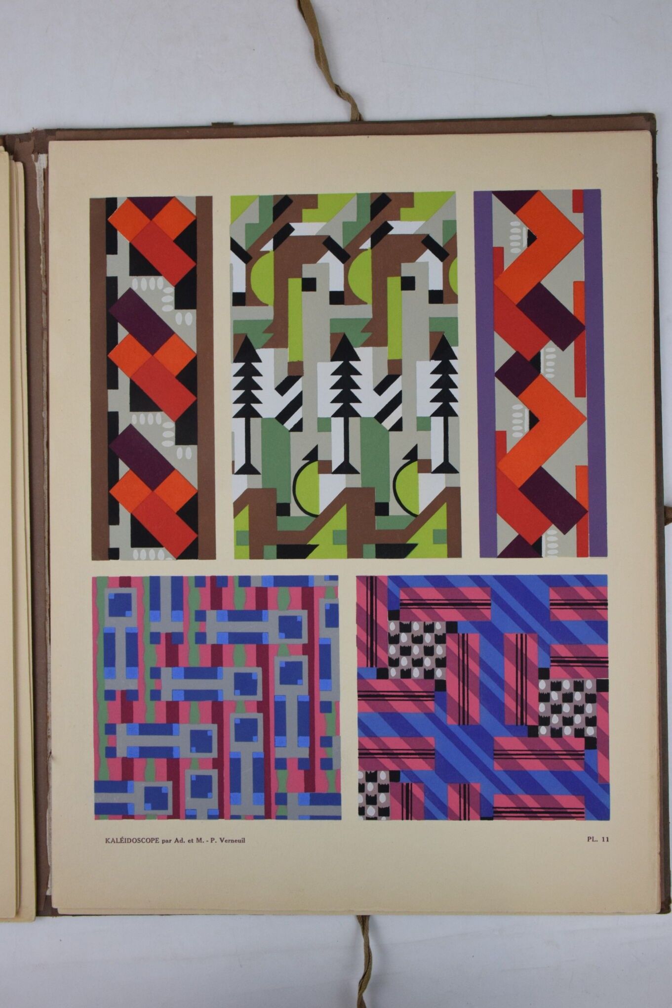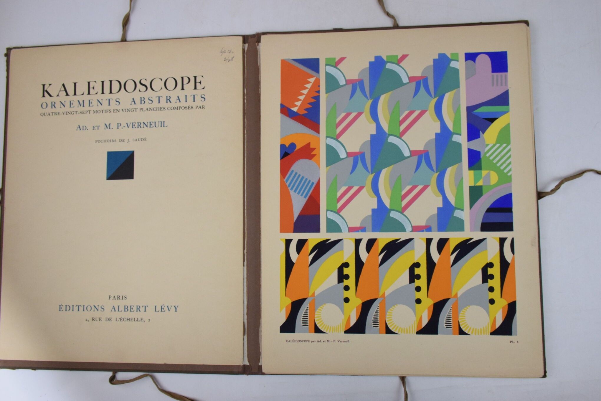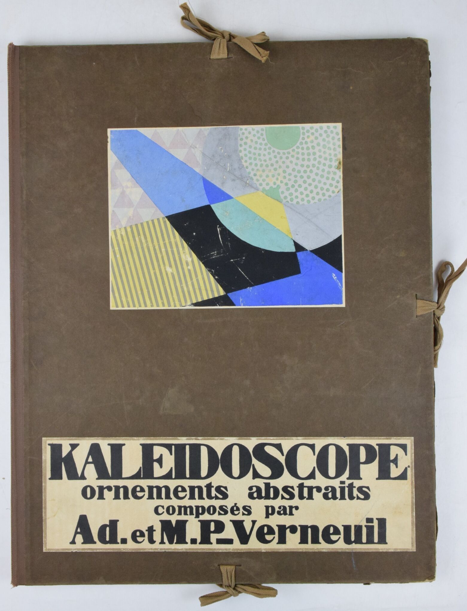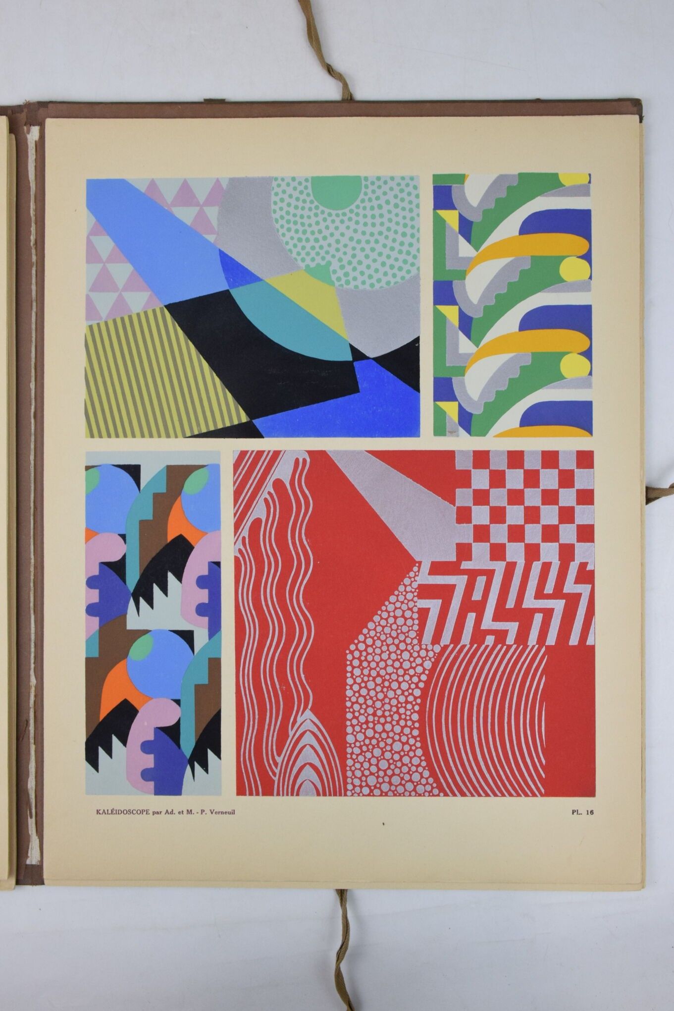 VERNEUIL, Ad. and M.P. Kaleidoscope abstract ornaments. Paris, Albert Lévy, s.d. (1925). In-folio (35 x 44.5 cm), 1 title leaf and 20 plates with 87 abstract motifs by Adélaïde Verneuil de Marval and Maurice Pillard Verneuil, in colour and stencilled by Jean Saudé. Leaves in publisher's laced dust jacket illustrated with a colour composition, rubbed edges, minor scuffing to dust jacket and plate 3.