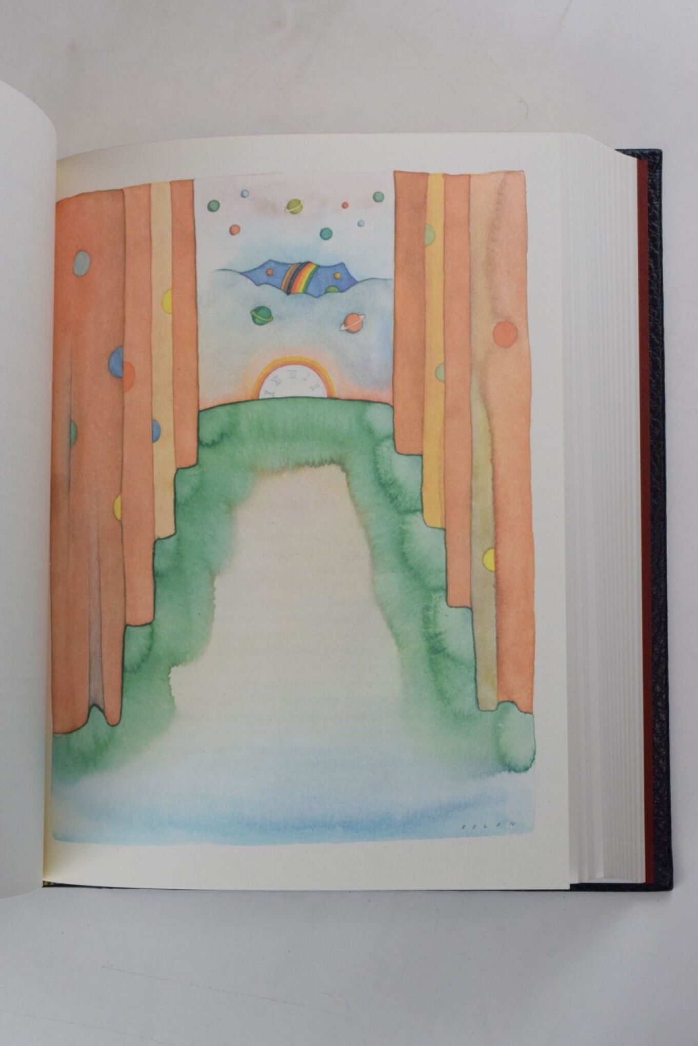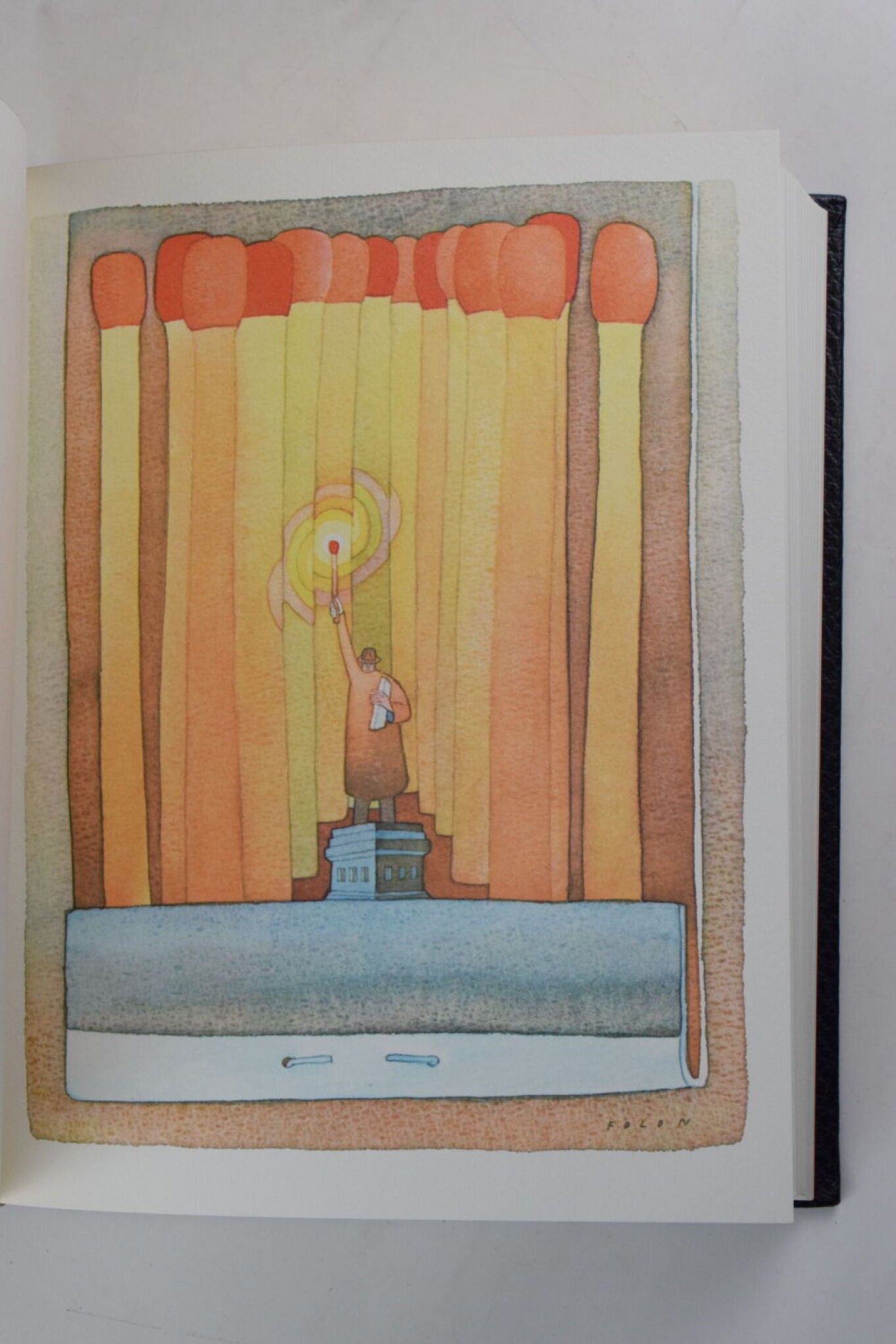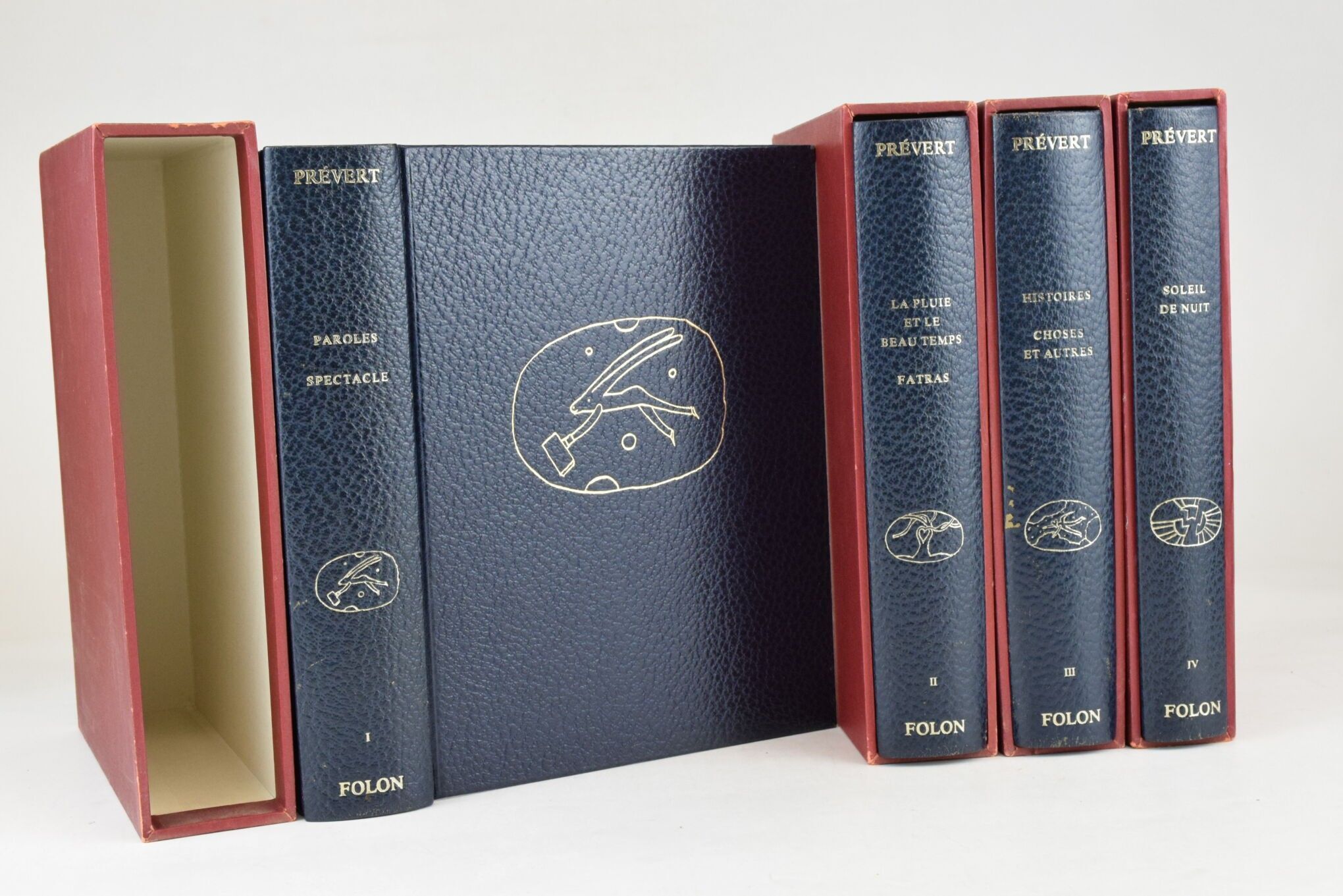 PRÉVERT (Jacques). [FOLON]. Oeuvres. André Sauret, 1982. 4 volumes in-4, -Paroles, Spectacle - La pluie et le beau temps, Fatras - Histoires, Choses et autres - Soleil de nuit. Colour illustrations by J.-M. FOLON. Publisher's binding, gilt illustration on cover, gilt upper edge, slipcase, minor rubbing to spine of volume III. Complete in 4 volumes.