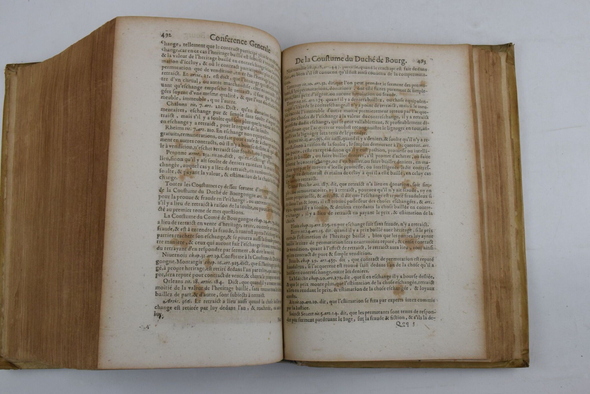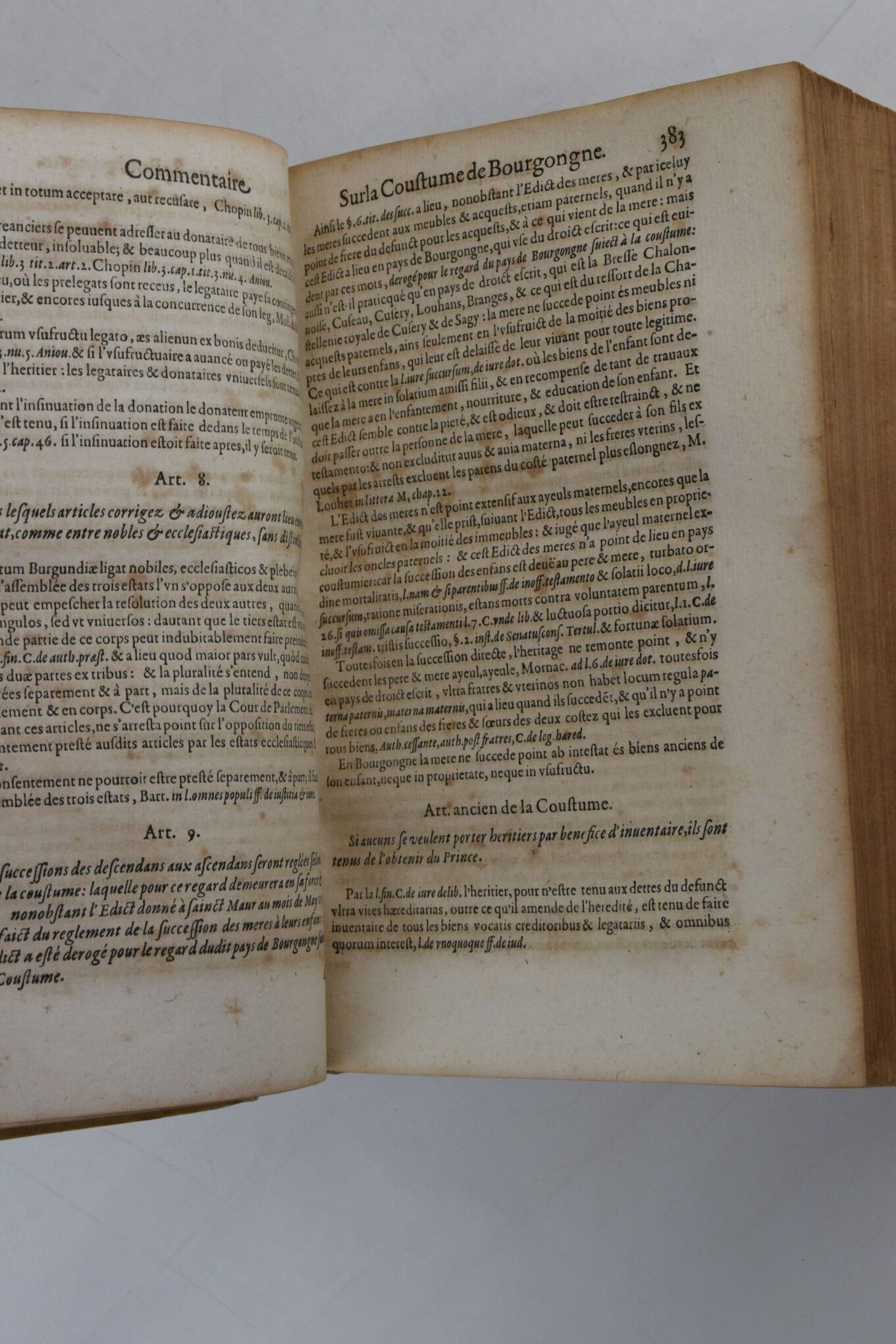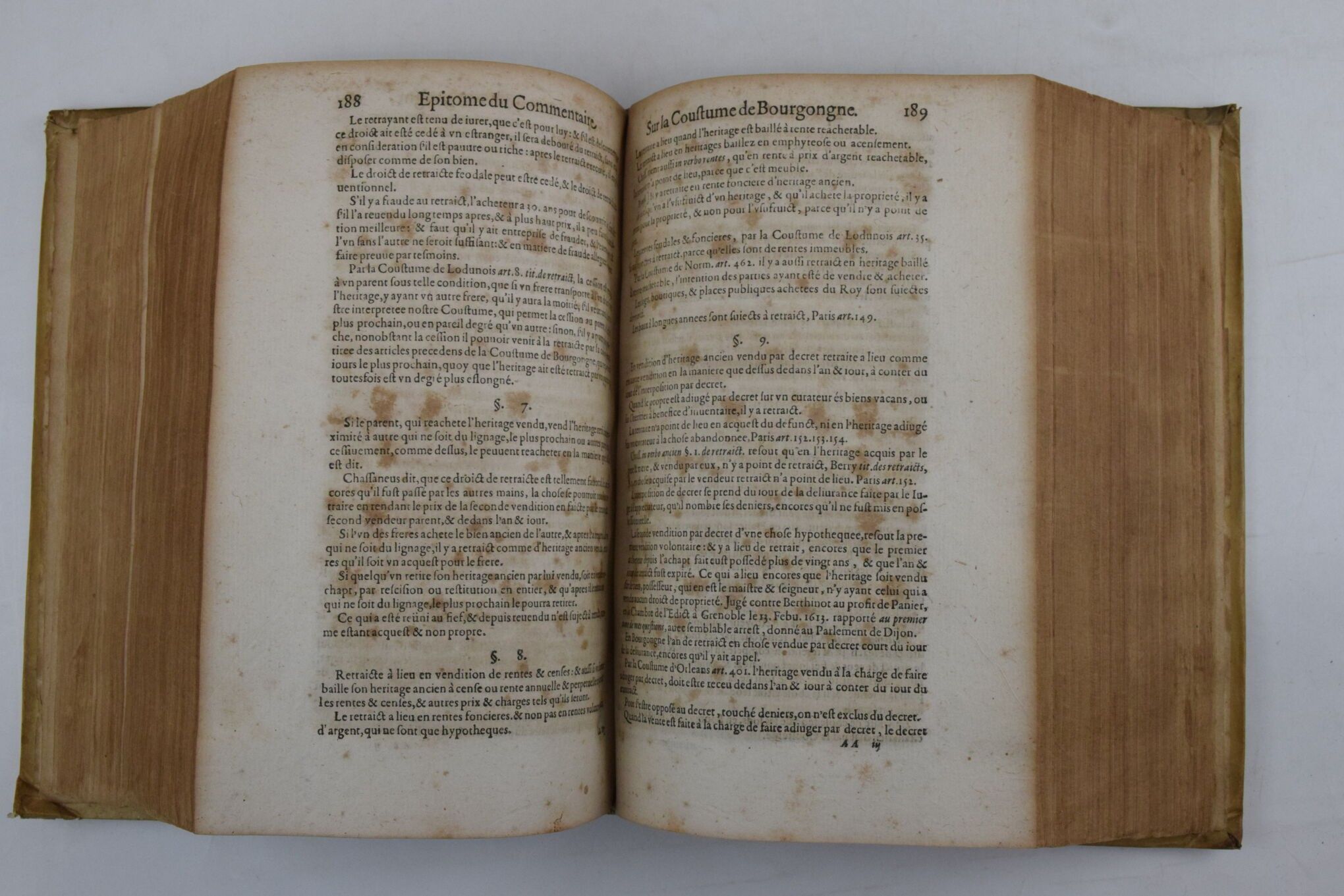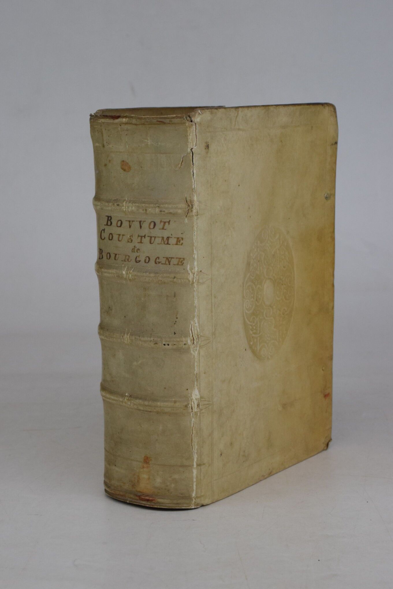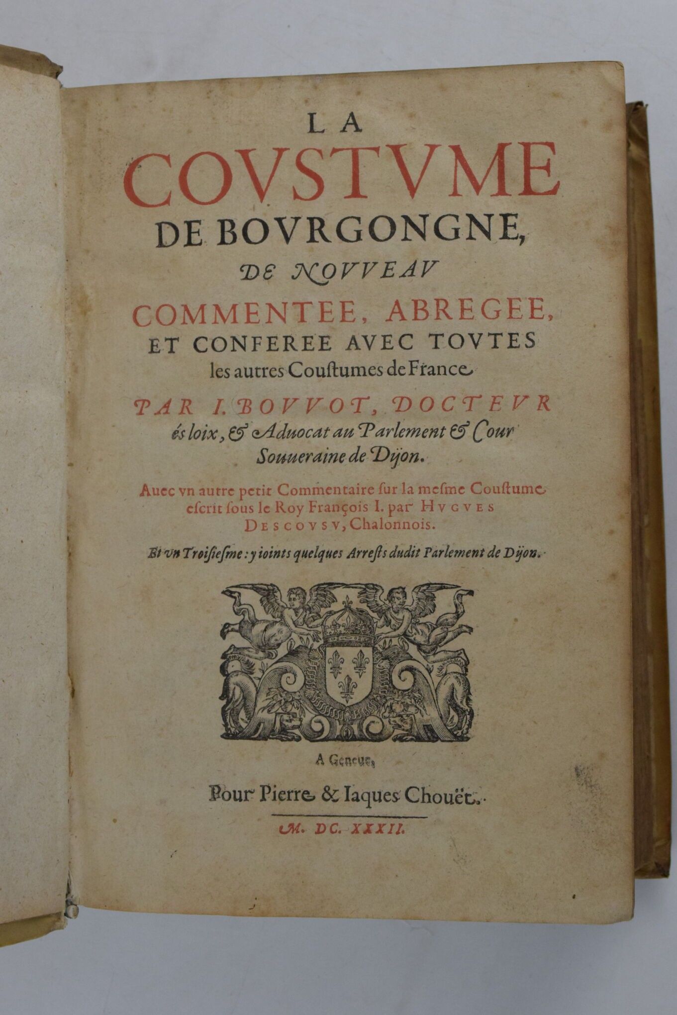 BOUVOT, J. La Coustume de Bourgongne, de nouveau commentée... par J. Bouvot,... avec un autre petit commentaire sur la mesme Coustume escrit sous le roy François I. par Hugues Descousu, Chalonnois. Geneva, Pour Pierre & Jacques Chouët, 1632. In-4, (12)-586-(112 Indice)-251-(1 bl.)-576- 96-36 pp. Contemporary binding in stiff vellum, spine titled in ink, boards decorated in cold with an oval plate with arabesque decoration, trace of binding. Cracks to the spines, 1 corner open, some foxing.
