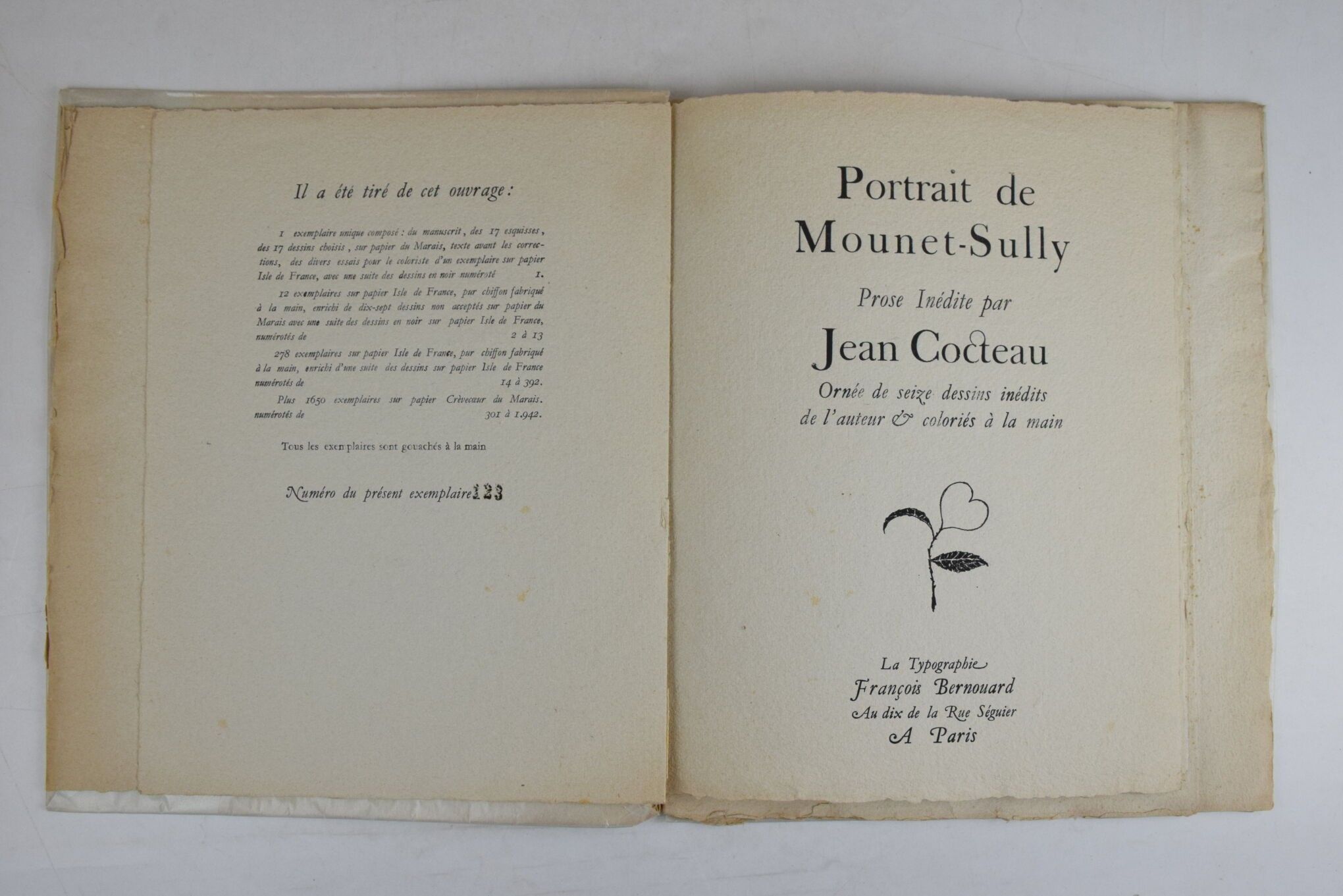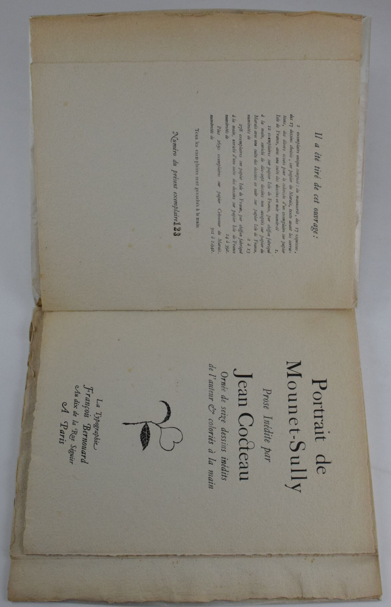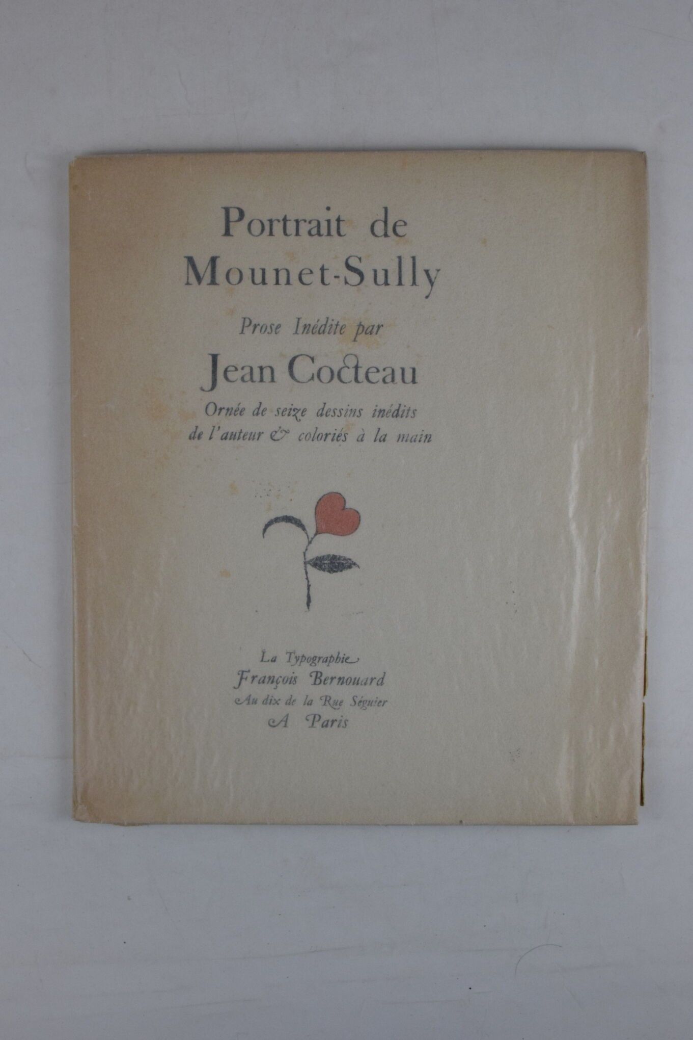 COCTEAU, Jean. Portrait de Mounet-Sully. Unpublished prose by Jean Cocteau. Decorated with sixteen unpublished drawings by the author. Paris, François Bernouard, 1945. In-4, illustrated with colour drawings by Jean Cocteau, edition of 1942 numbered copies, one of 278 on papier pur chiffon with a suite of black drawings. Paperback in filled cover, spine and margins soiled, light foxing on cover.
