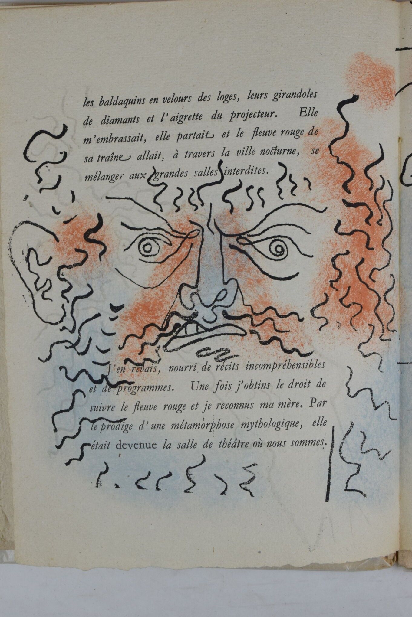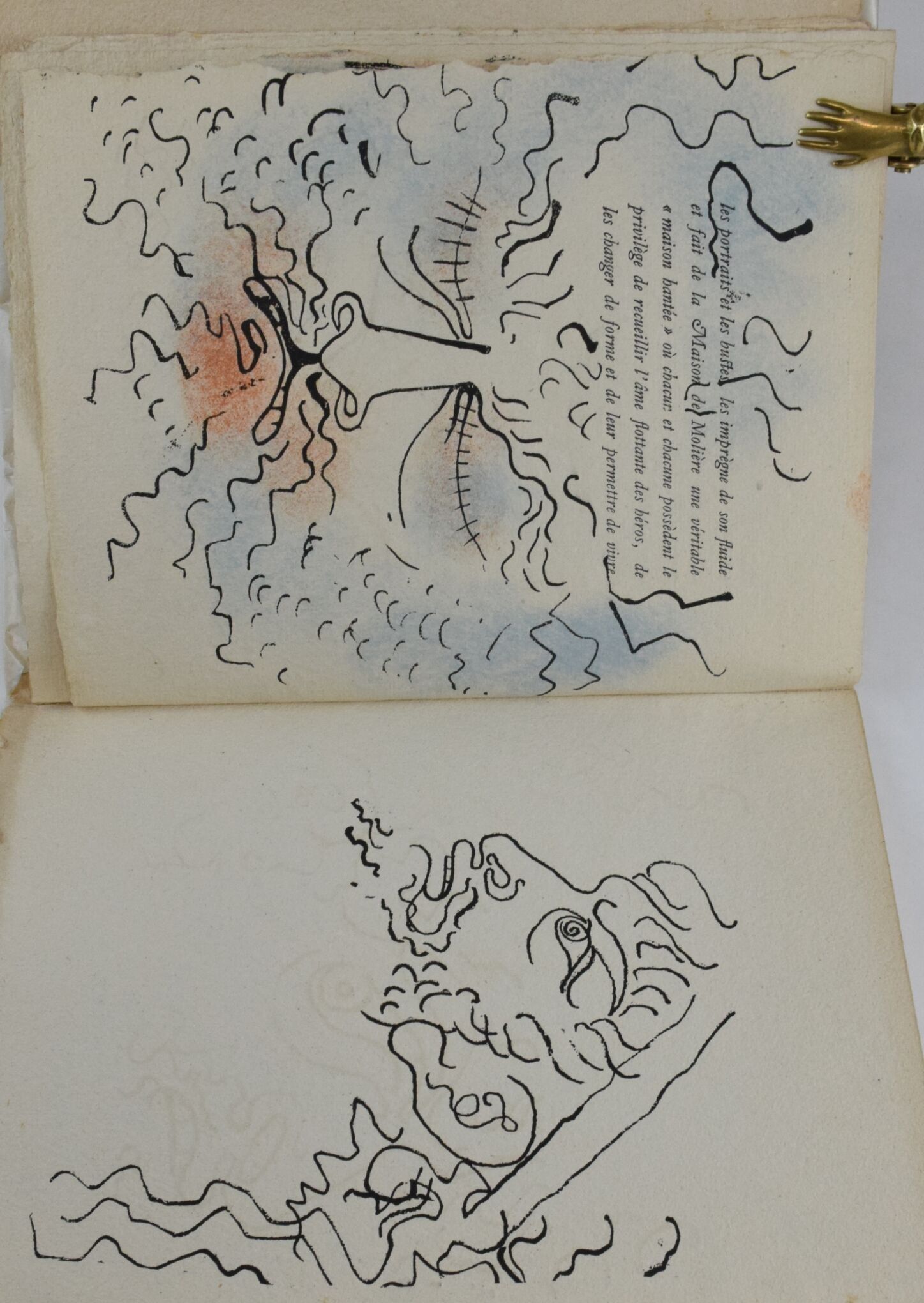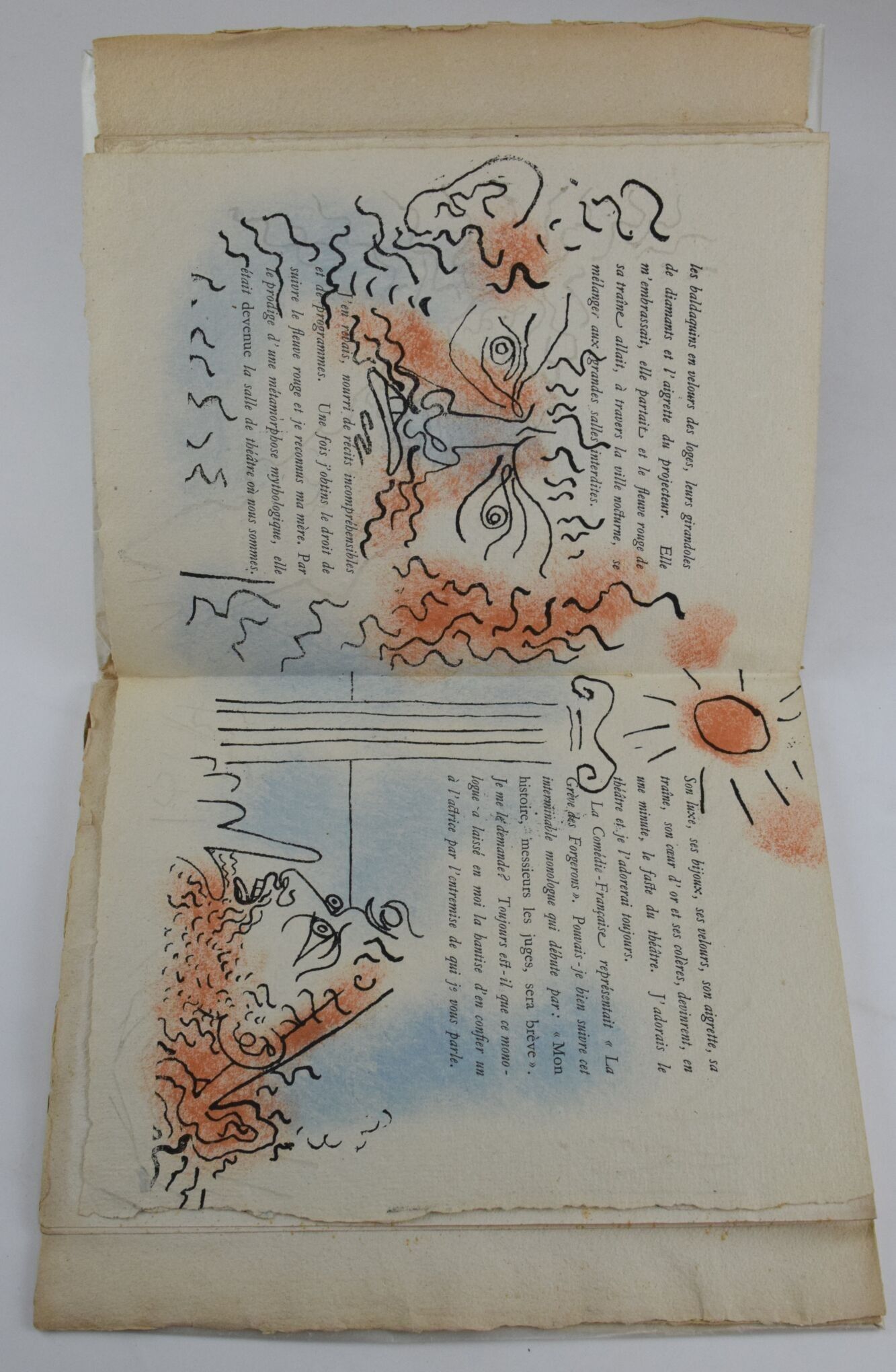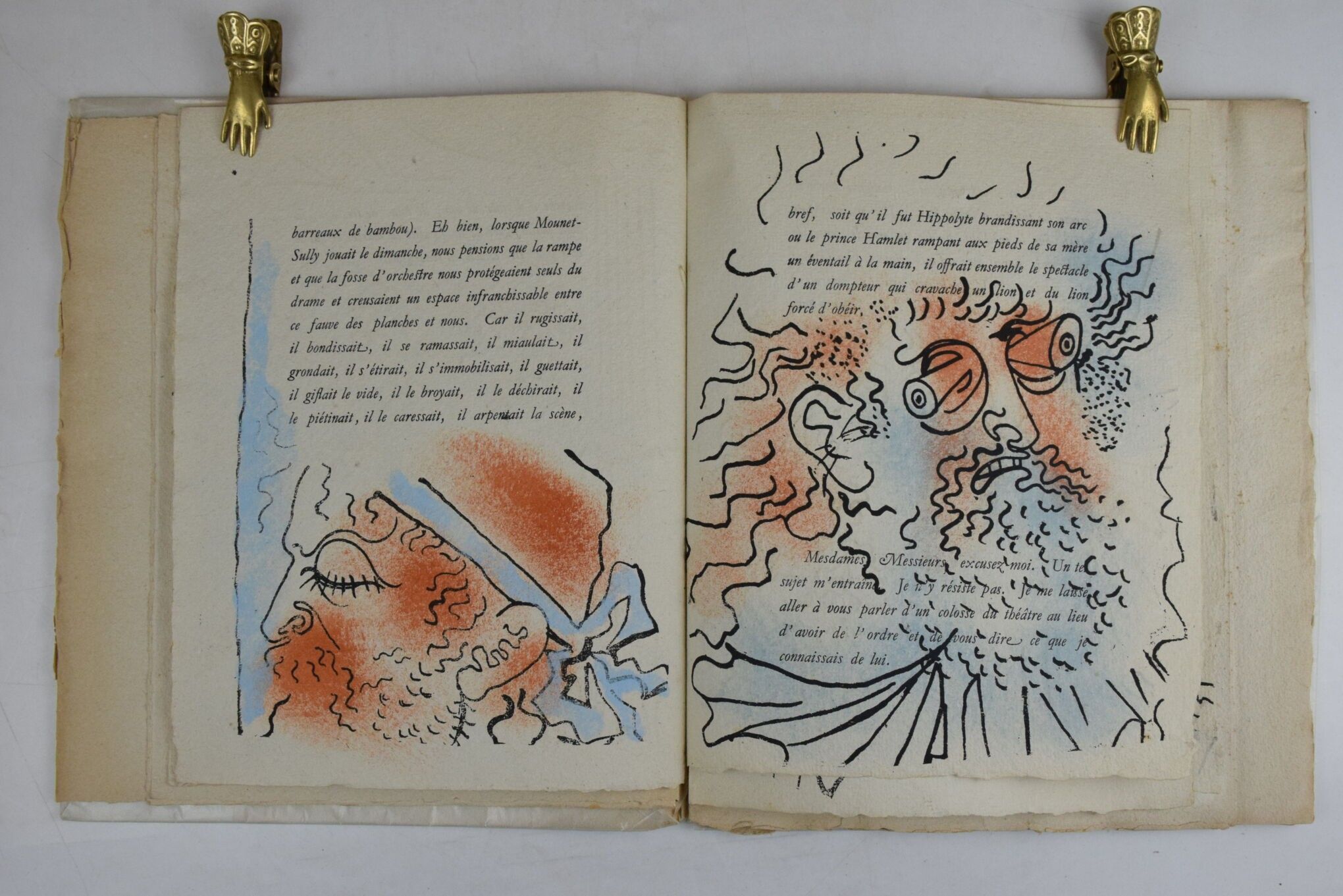 COCTEAU, Jean. Portrait de Mounet-Sully. Unpublished prose by Jean Cocteau. Decorated with sixteen unpublished drawings by the author. Paris, François Bernouard, 1945. In-4, illustrated with colour drawings by Jean Cocteau, edition of 1942 numbered copies, one of 278 on papier pur chiffon with a suite of black drawings. Paperback in filled cover, spine and margins soiled, light foxing on cover.