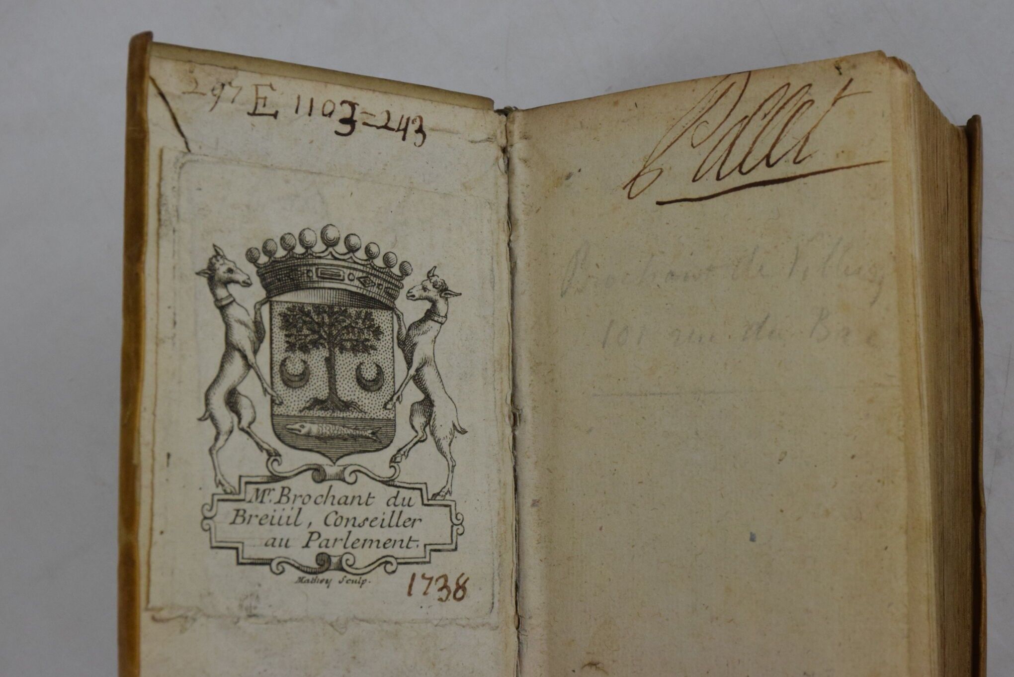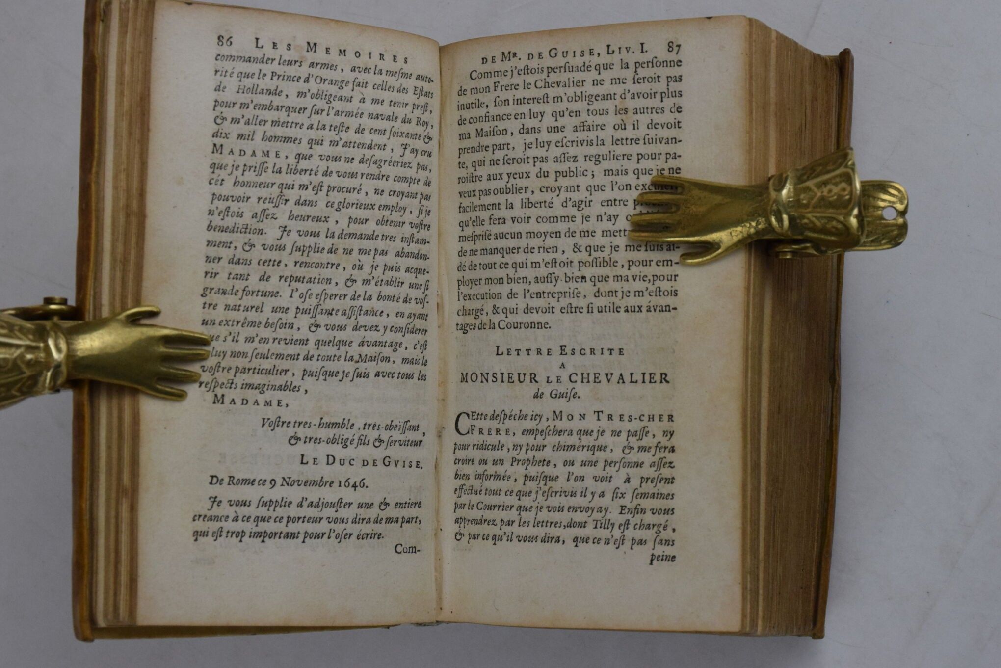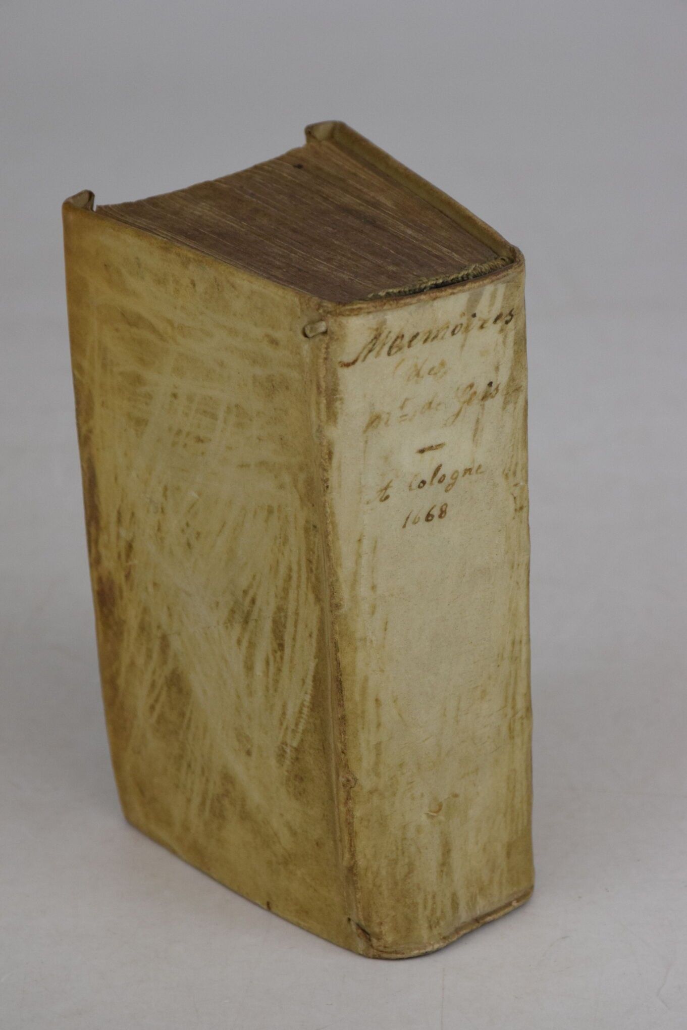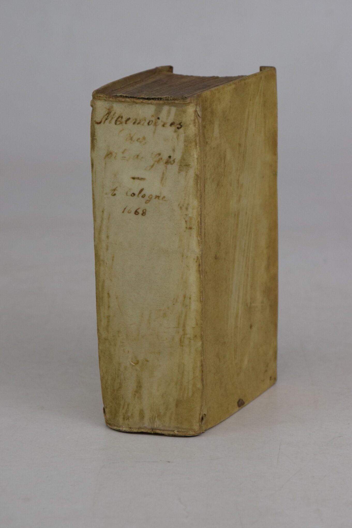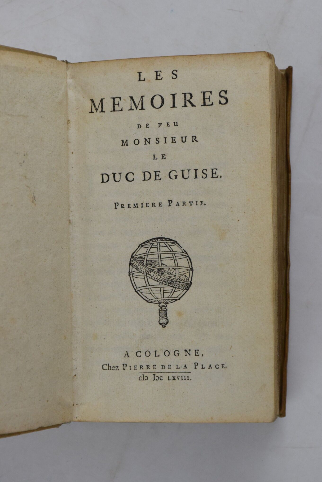 GUISE, Henri de Lorraine (1614-1664 ; duc de) Les mémoires de feu monsieur le duc de Guise. Cologne, Pierre de la Place, 1668. 2 parts in 1 volume in-12, (8)-458-(2 bl.)-283-(1 bl.) pp. with sphere mark. Bound in contemporary stiff vellum with flaps, title in ink on the spine, armorial bookplate of "Mr. Brochant du Breüil, Conseiller au Parlement" on the flyleaf with a grading mark in ink, a fine copy. Edition classified in the Elseviers, there are two distinct editions under the same date, this one, from the presses of the Steucker brothers in The Hague, is the more beautiful. (A. Willems, Les Elzevier, 1790).