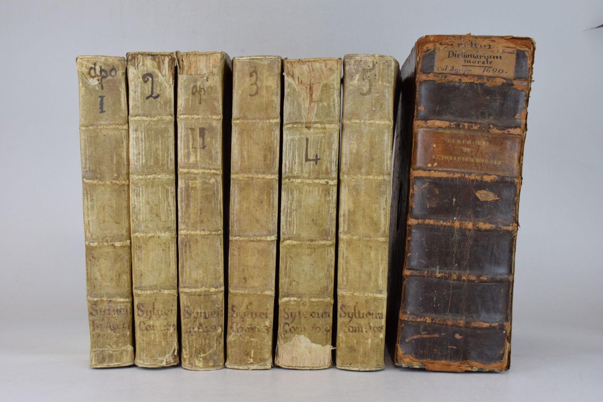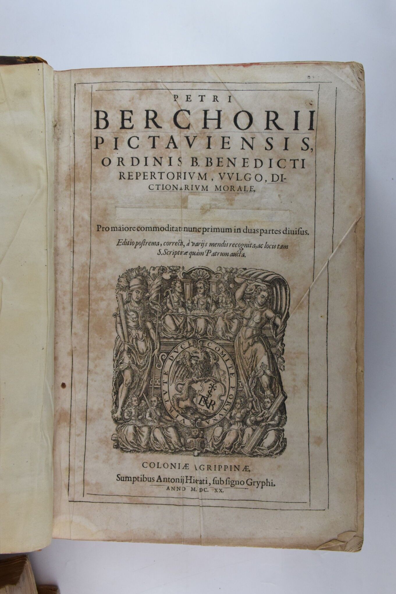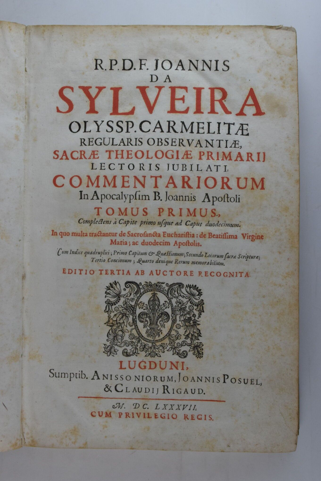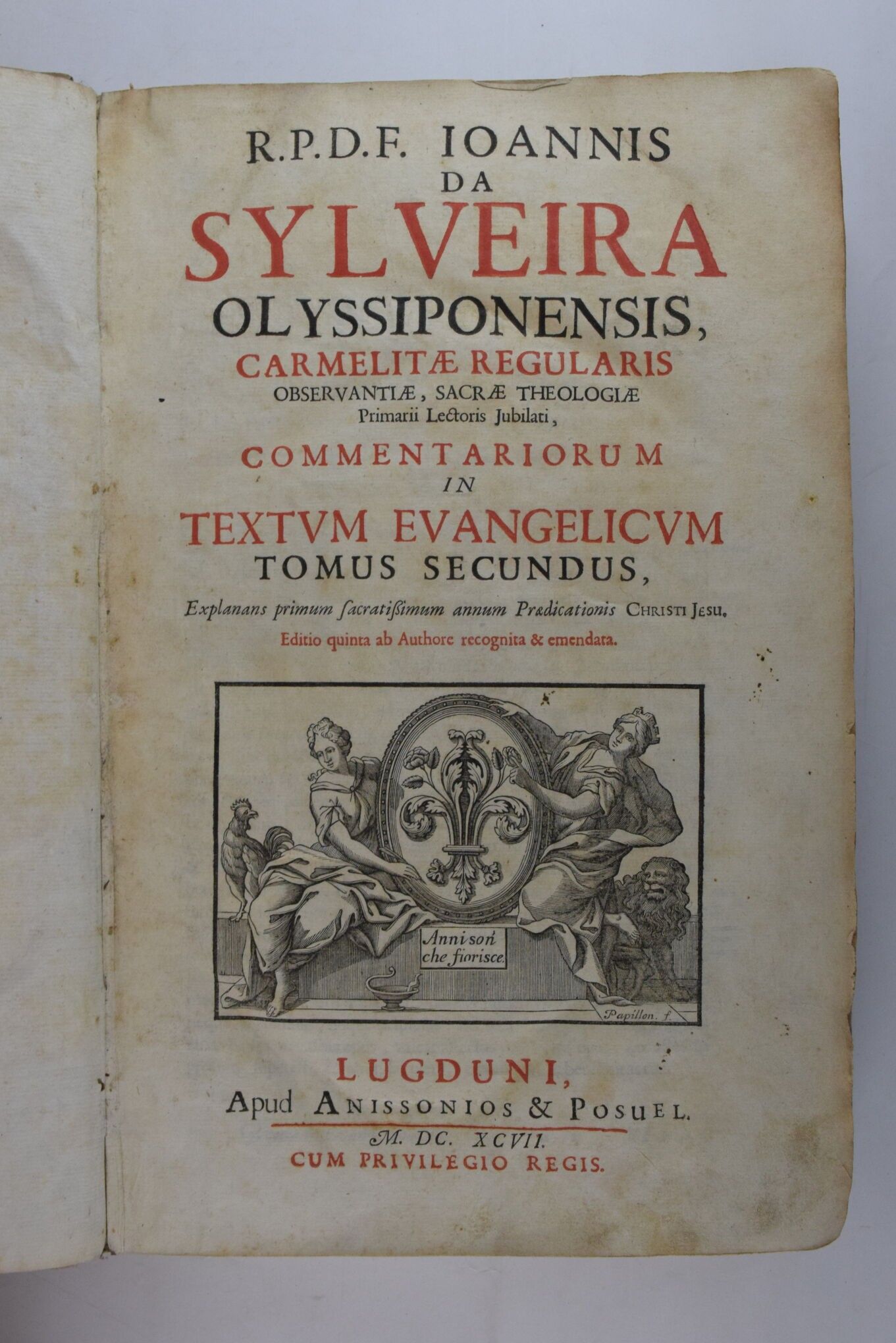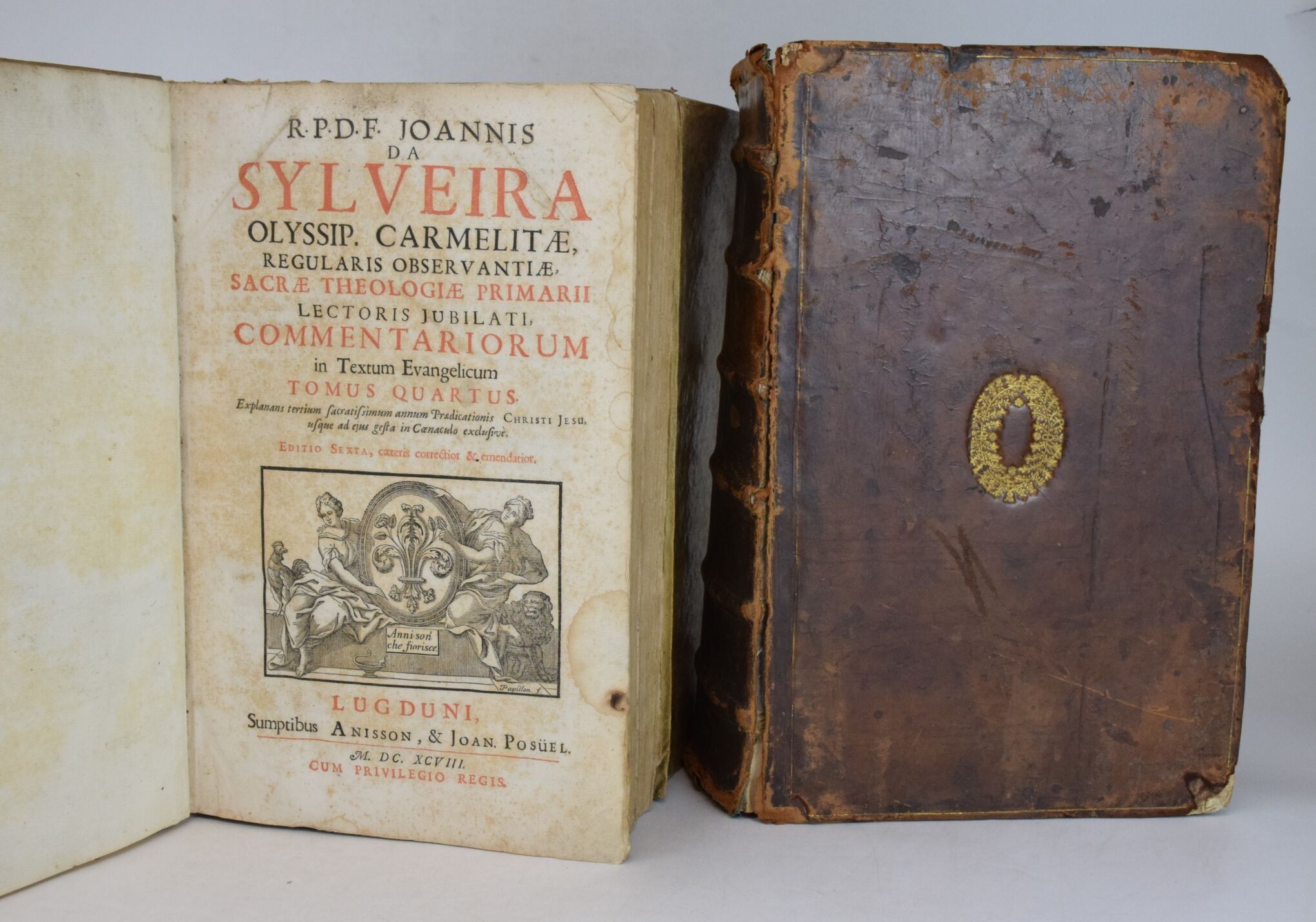 SYLVEIRA, Joannis - (joint) BERSUIRE, Pierre. Commentariorum in Apocalysim (volumes I and II); Commentariorum in textum evangelicum (volumes II, III, IV and V). (Joint: Dictionarium Morale) Lugduni (Lyon), Anisson & Posuel, 1687-1700 and 1697-1698. 6 volumes in-folio. Bound in contemporary stiff vellum, author's name and tomaison in ink on spine, several spines with vellum tears, freckling. Joint: Pierre Bresuire (129.?-1362), Repertorium, vulgo, dictionarium morale. Coloniae Agrippinae (Cologne), Antonii Hierati, 1620. in-folio, 458-1318 pp. and Index. Bound in contemporary calf, boards decorated with a wreath of foliage, title label on spine later and paper label, binding faded, sup. joint split, headpieces damaged, binding rubbed, lack of leather at corners and edges, heavy foxing, paper browned.