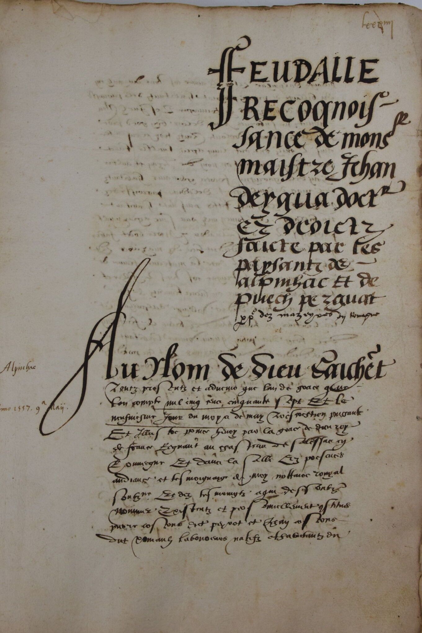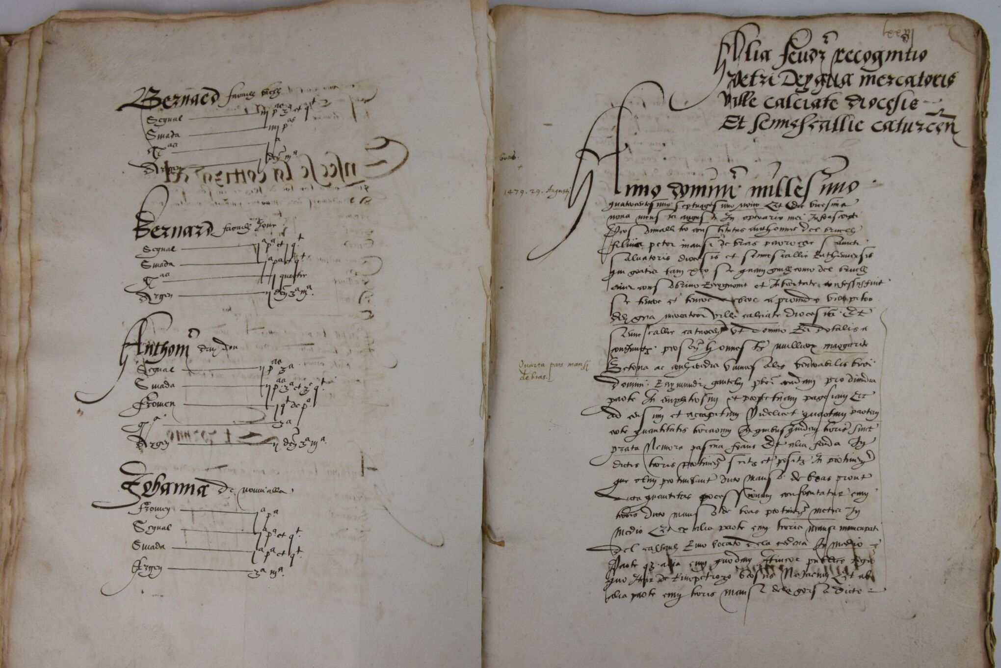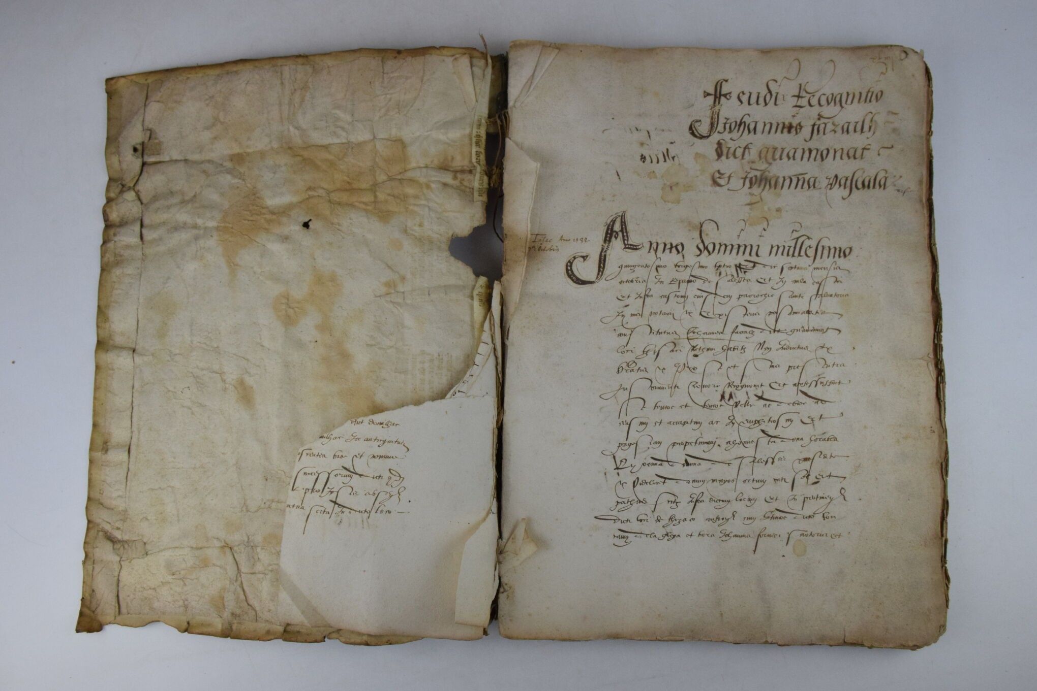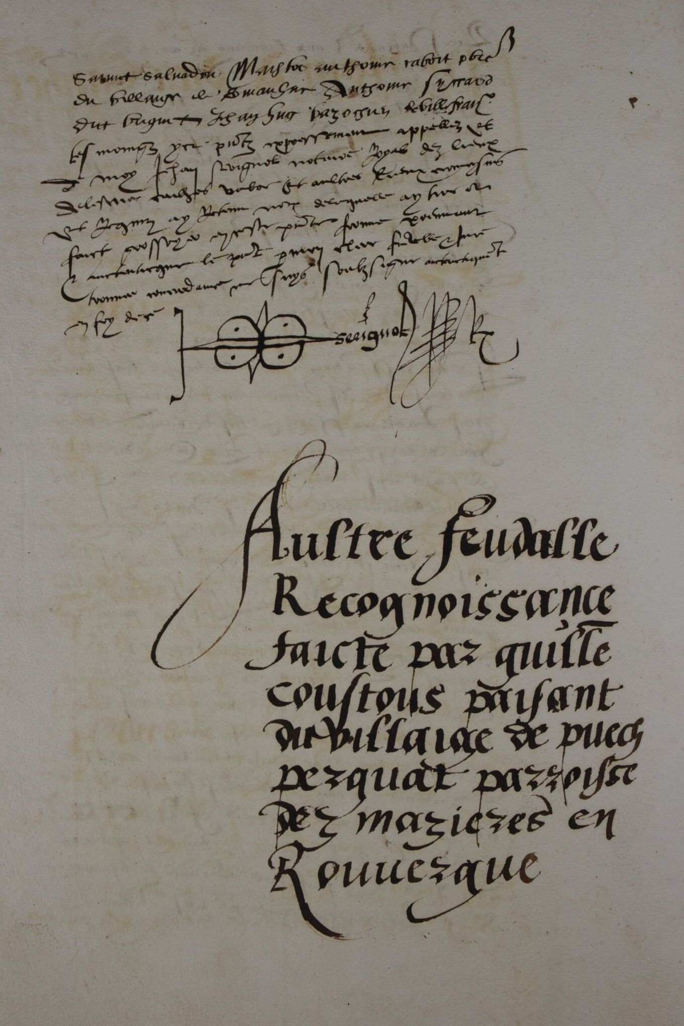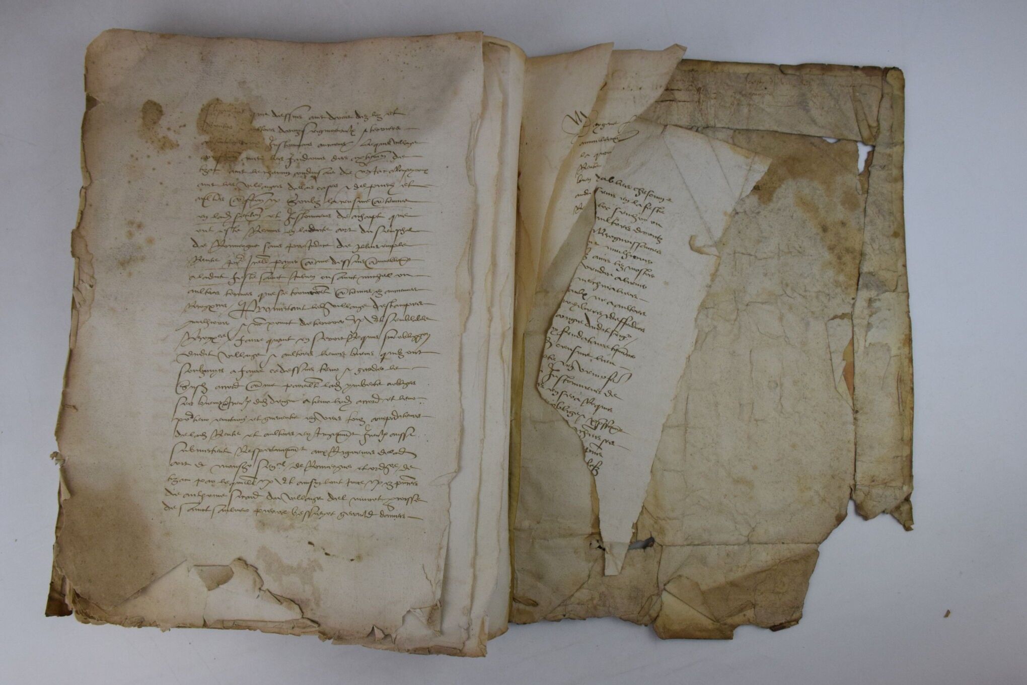 Collection of feudal acknowledgements. Rouergue region. Sixteenth-century manuscript on paper. Folio (43 x 31 cm) of 76 leaves, the transcribed documents are dated between 1482 and 1557 but the order is not chronological and the document as a whole must date from around 1550-60. A collection of feudal acknowledgments and receipts, some in Latin, most in French, relating to individuals or villages in south-west France, including Puech Perg(u)at, parish of Les Mazières in Aveyron. The leaves are numbered from 44 to 127 (foliation 47 doubled), the first leaves, ff. 64 to 72 and at least, at the end, the 5 leaves of the last quire are missing. Bound in contemporary vellum, traces of binding, major loss to spine and second covers, last three leaves detached and with margins damaged, wetness in the inner margin at the end of the collection.