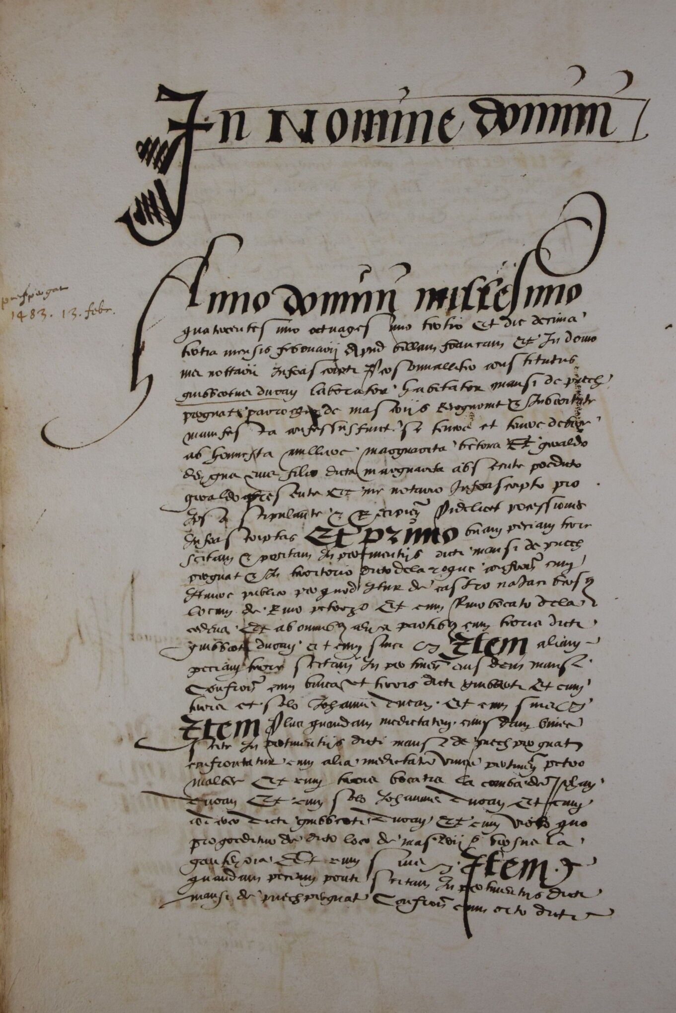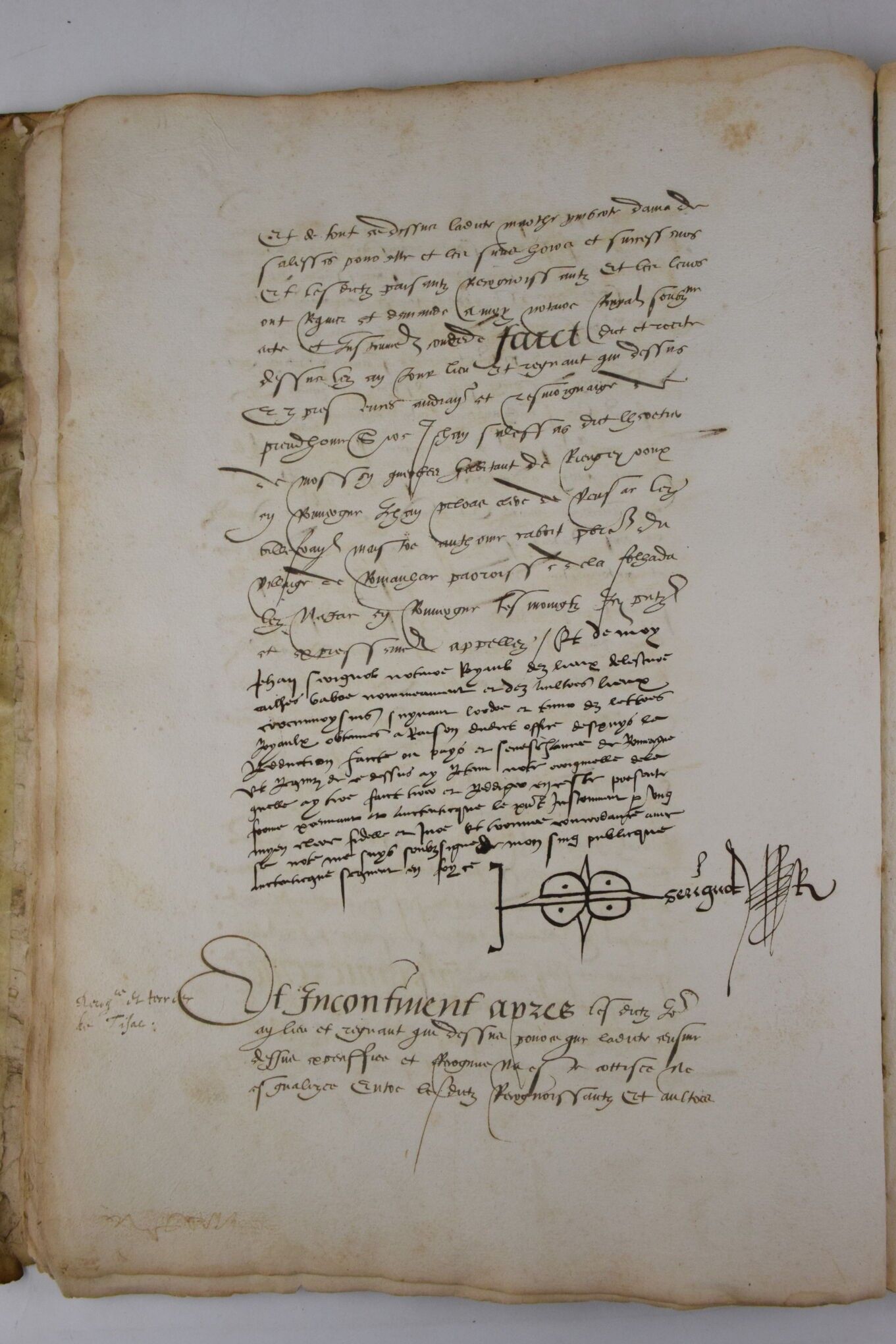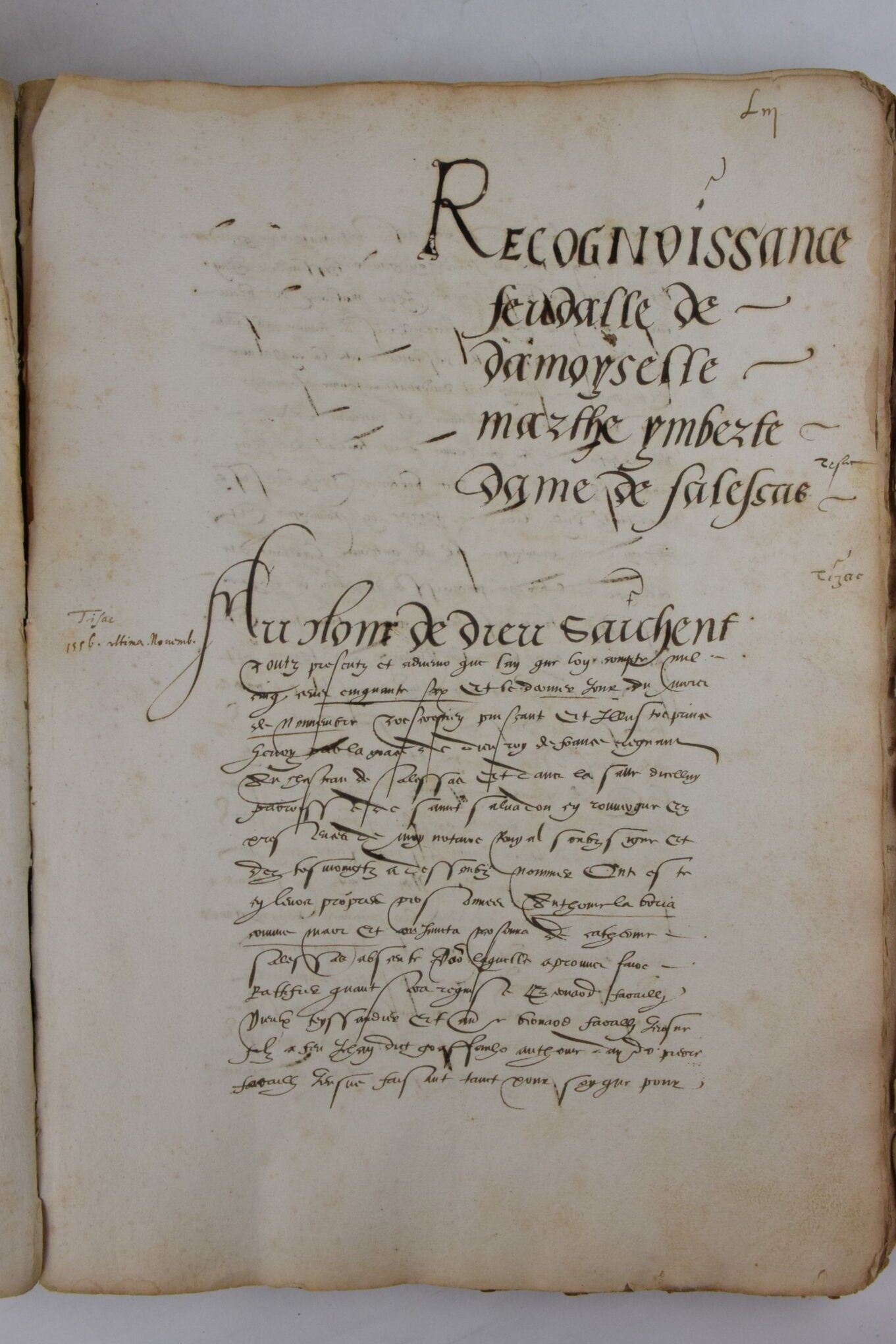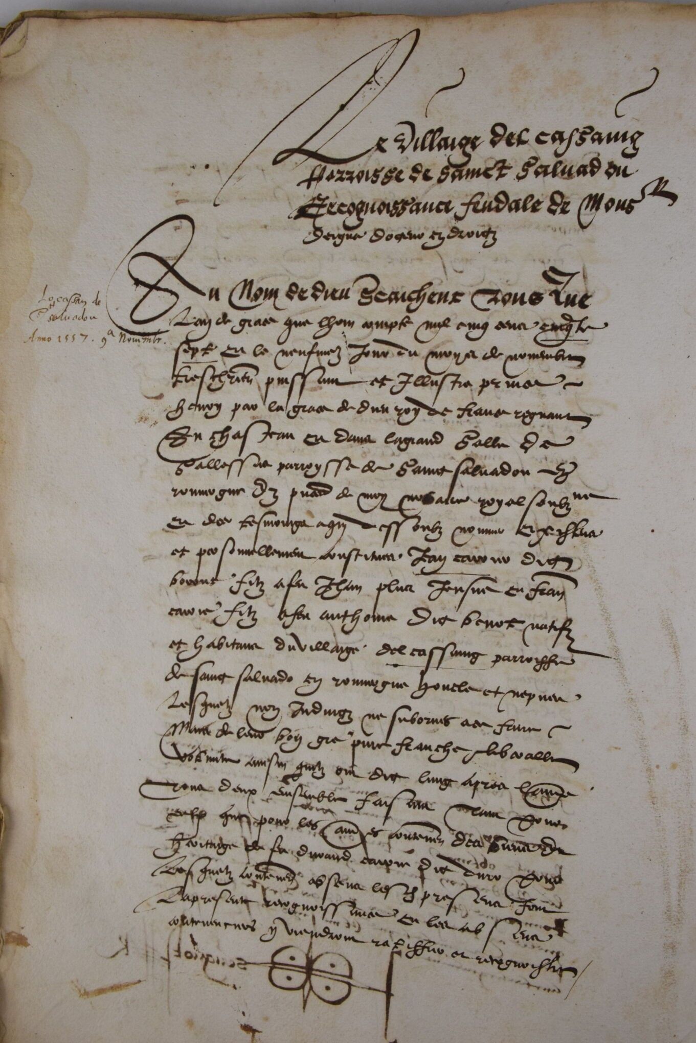Collection of feudal acknowledgements. Rouergue region. Sixteenth-century manuscript on paper. Folio (43 x 31 cm) of 76 leaves, the transcribed documents are dated between 1482 and 1557 but the order is not chronological and the document as a whole must date from around 1550-60. A collection of feudal acknowledgments and receipts, some in Latin, most in French, relating to individuals or villages in south-west France, including Puech Perg(u)at, parish of Les Mazières in Aveyron. The leaves are numbered from 44 to 127 (foliation 47 doubled), the first leaves, ff. 64 to 72 and at least, at the end, the 5 leaves of the last quire are missing. Bound in contemporary vellum, traces of binding, major loss to spine and second covers, last three leaves detached and with margins damaged, wetness in the inner margin at the end of the collection.