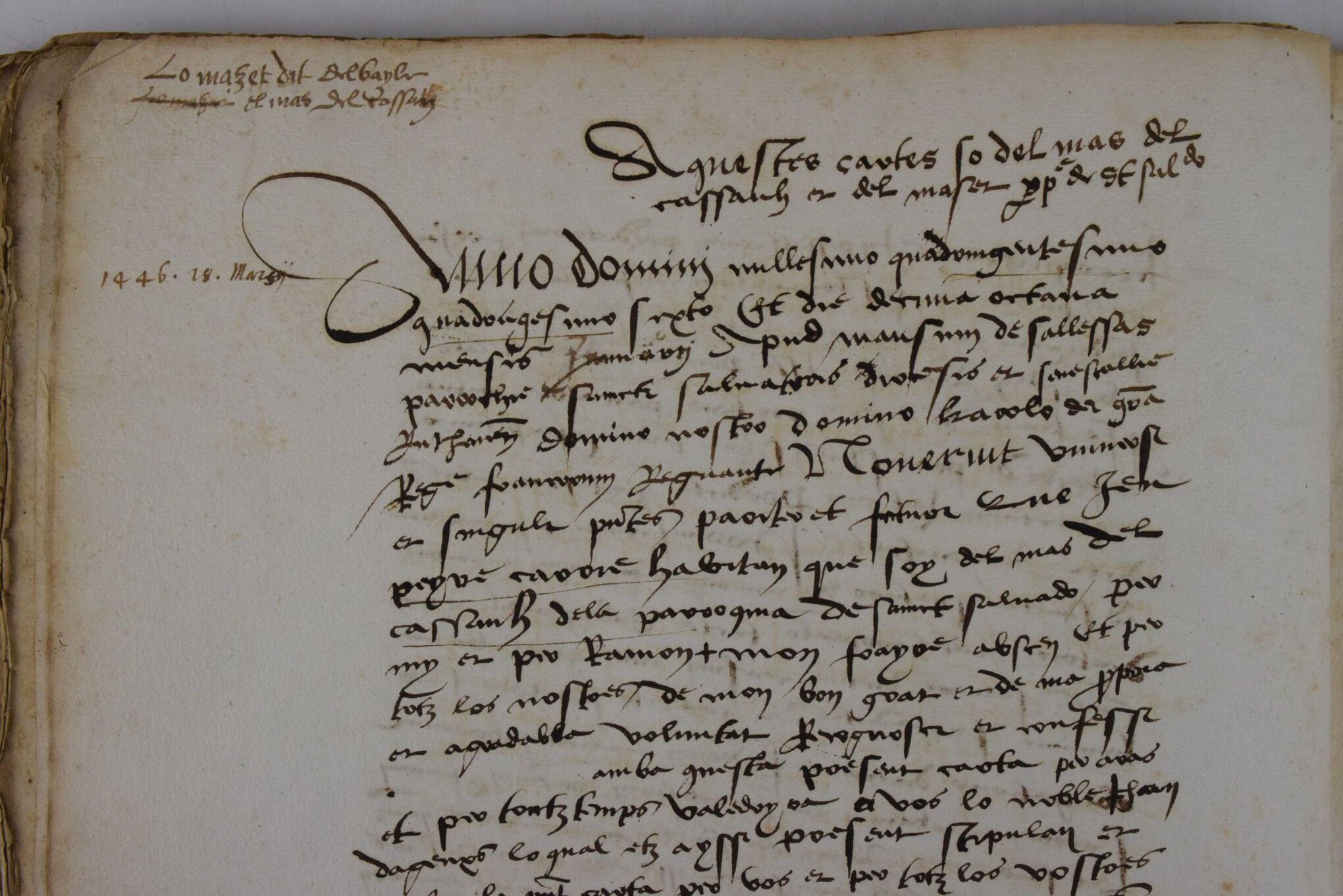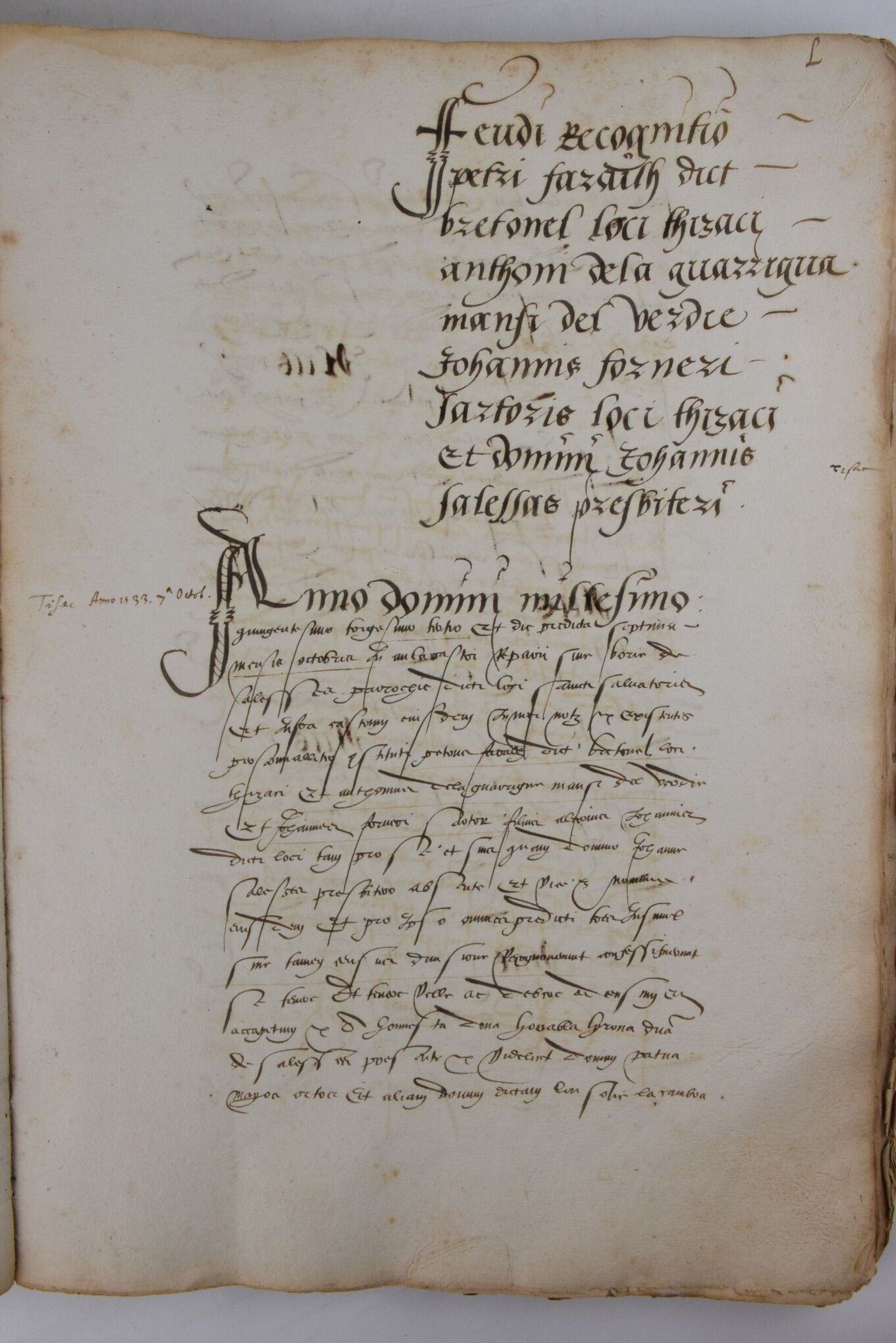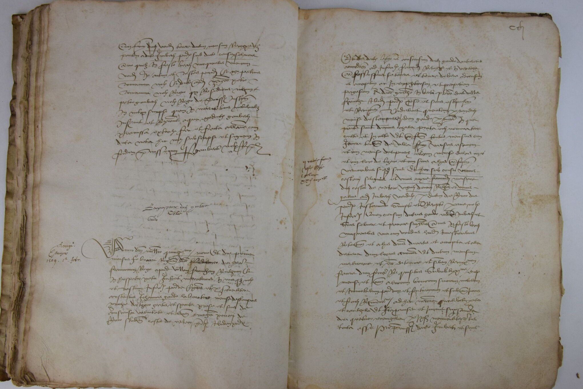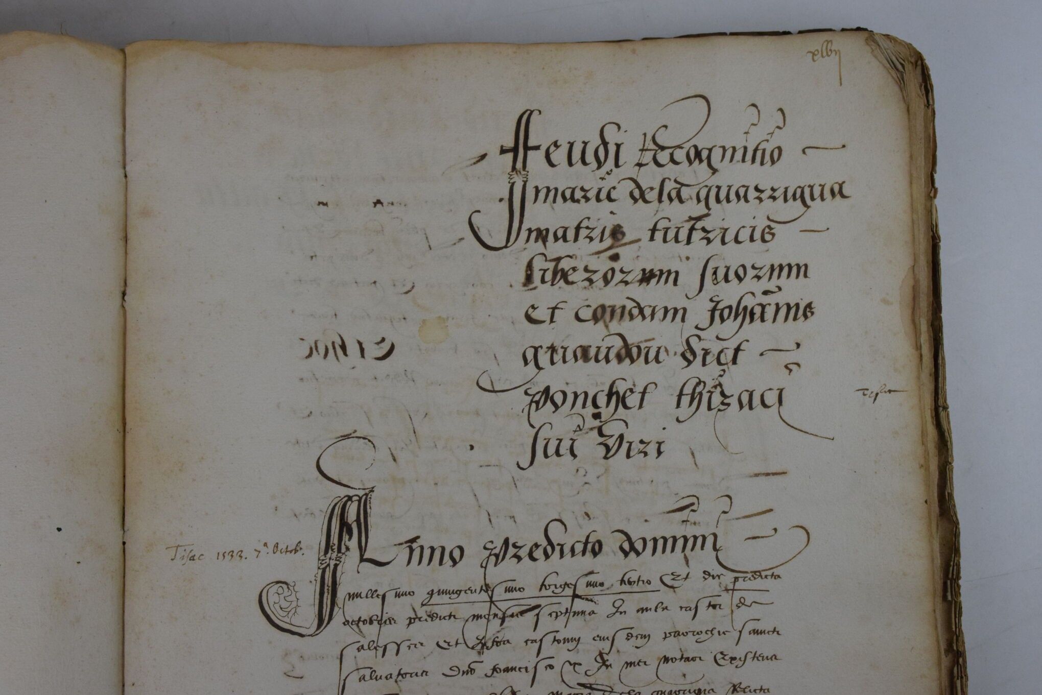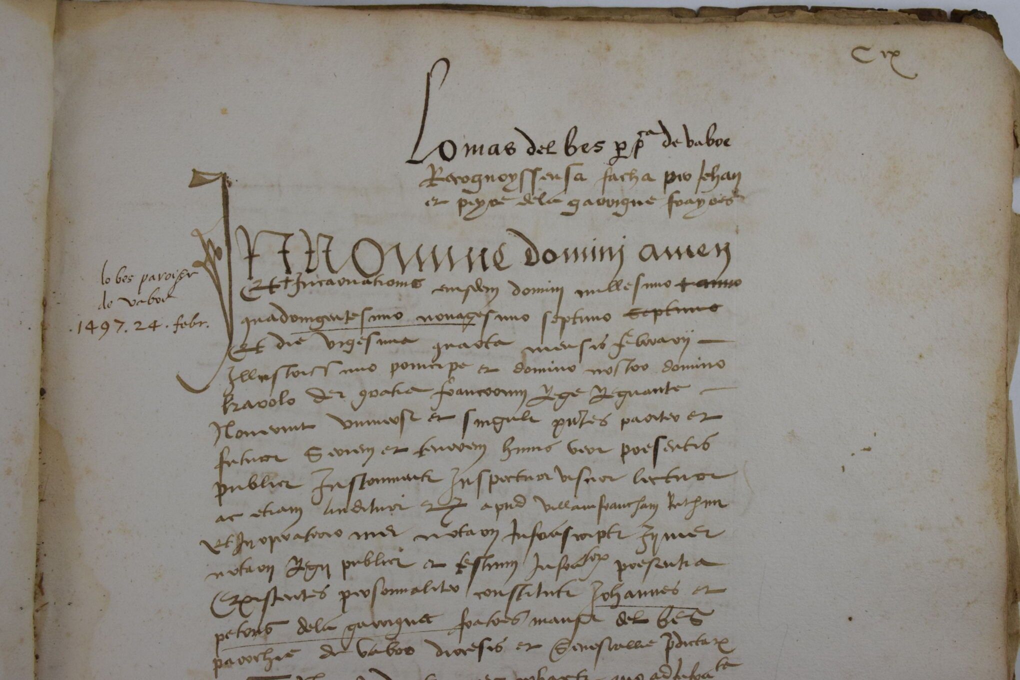 Collection of feudal acknowledgements. Rouergue region. Sixteenth-century manuscript on paper. Folio (43 x 31 cm) of 76 leaves, the transcribed documents are dated between 1482 and 1557 but the order is not chronological and the document as a whole must date from around 1550-60. A collection of feudal acknowledgments and receipts, some in Latin, most in French, relating to individuals or villages in south-west France, including Puech Perg(u)at, parish of Les Mazières in Aveyron. The leaves are numbered from 44 to 127 (foliation 47 doubled), the first leaves, ff. 64 to 72 and at least, at the end, the 5 leaves of the last quire are missing. Bound in contemporary vellum, traces of binding, major loss to spine and second covers, last three leaves detached and with margins damaged, wetness in the inner margin at the end of the collection.