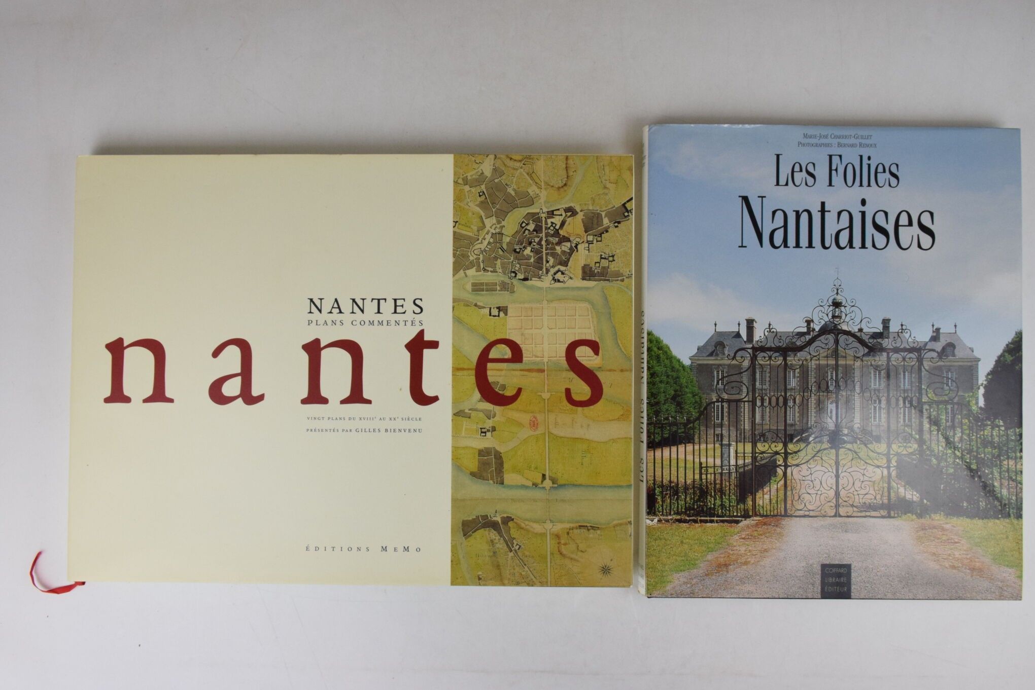 Nantes, set of 2 volumes. Gilles BIENVENU. Nantes, plans with commentary. Twenty maps of Nantes from the 18th to the 20th century. Éditions MeMo, 1994. Small oblong folio, 105 pp, 20 coloured plans in captioned serpents. Bound in publisher's cloth with illustrated dust jacket, handwritten bookplate on title page. ATTACHED: Marie-José Charriot-Guillet and Bernard Renoux. Les folies nantaises. Coiffard, 1995. 133 pp. with colour photos. Bound in publisher's cloth with illustrated dust jacket, ink ex-dono on flyleaf, foxing to edges.