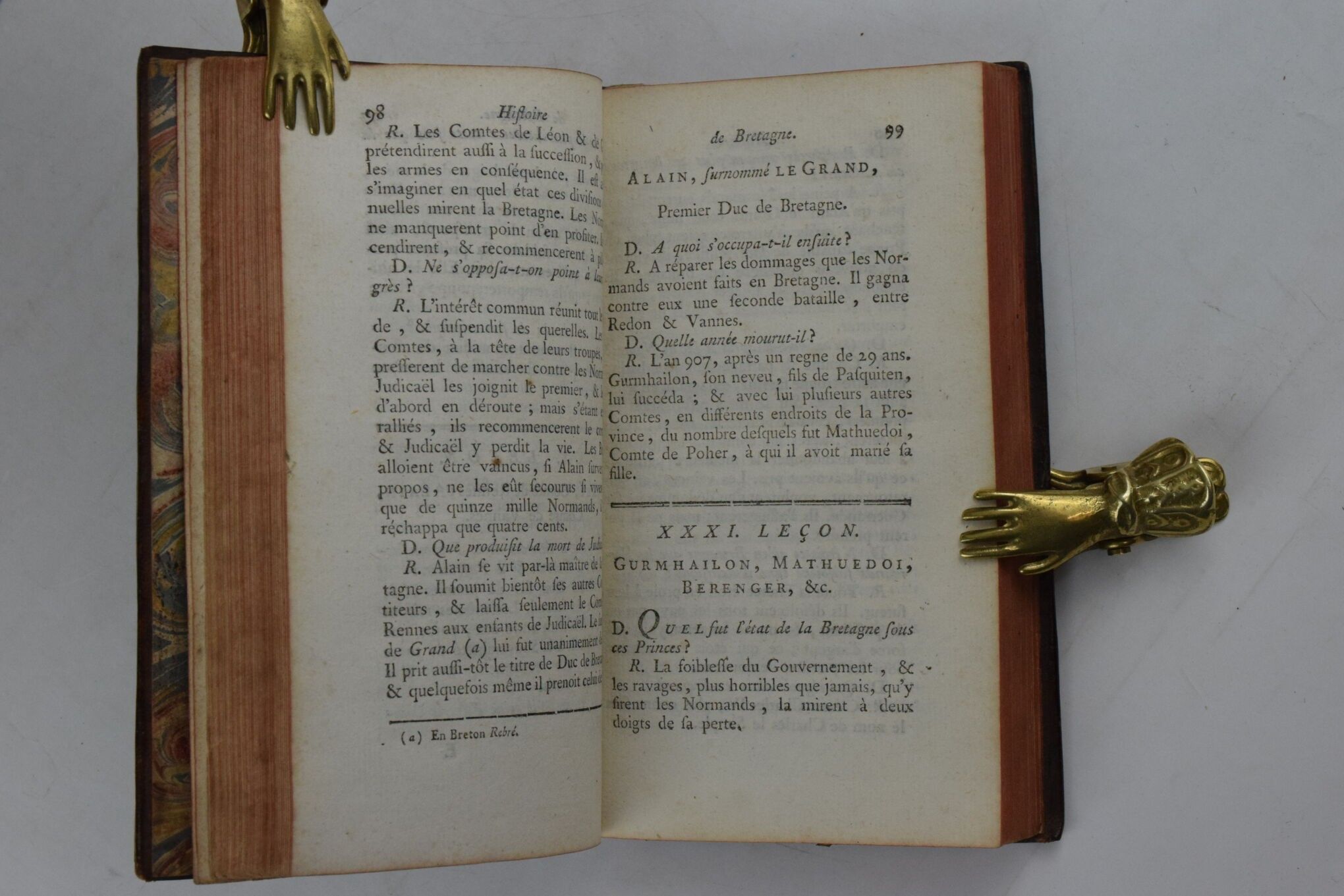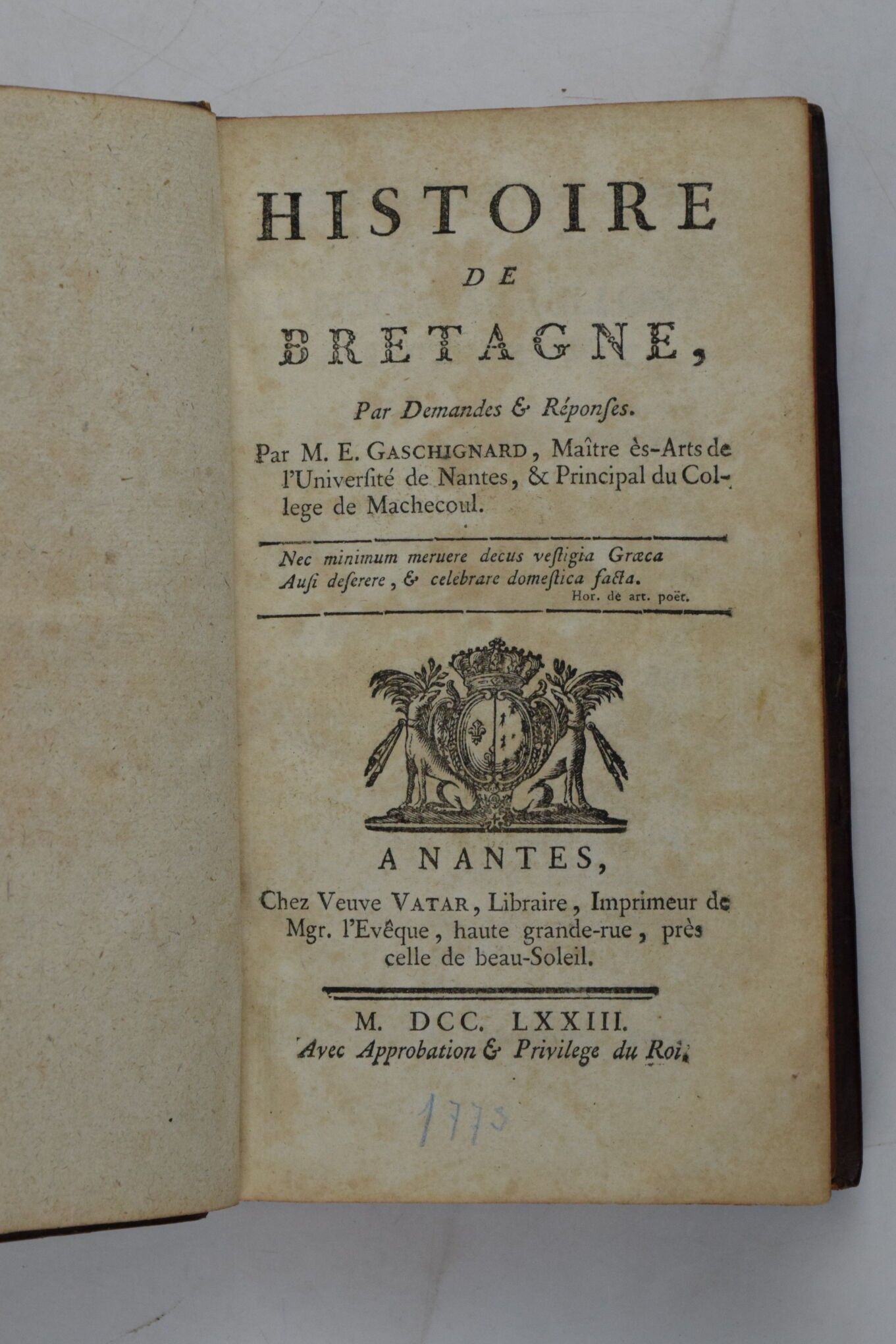 GASCHINARD, E. Histoire de Bretagne, par demandes et réponses. Nantes, Veuve Vatar, 1773. In-12, 312-(3) pp, contemporary binding in basane, smooth spine decorated with gilt fleurons, red edges, foxing mainly on the first few leaves, lower headband worn.
