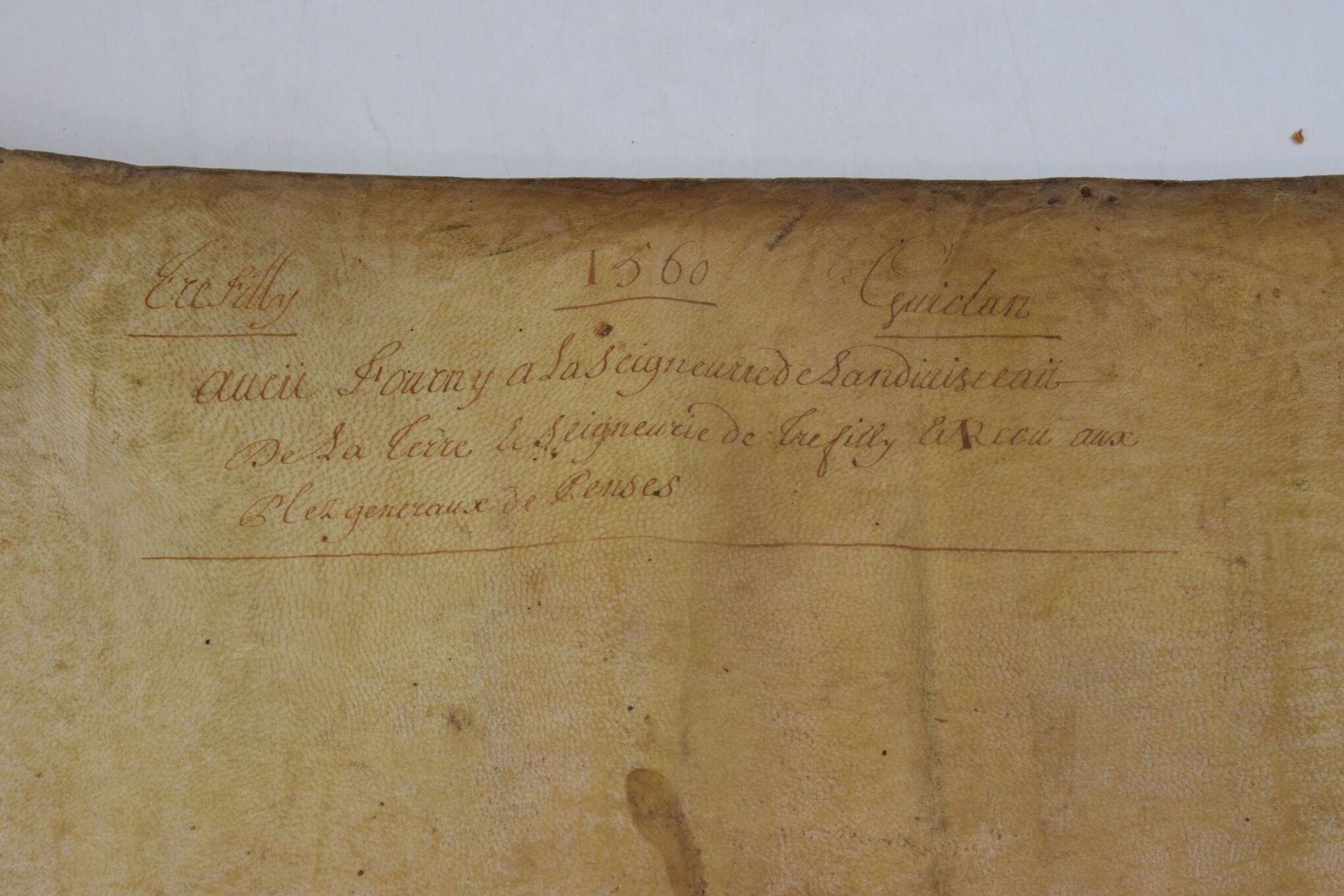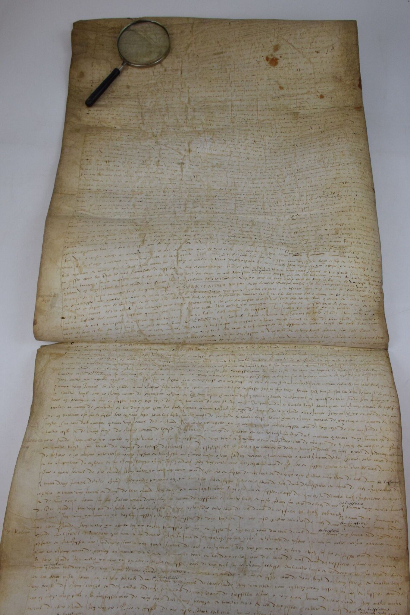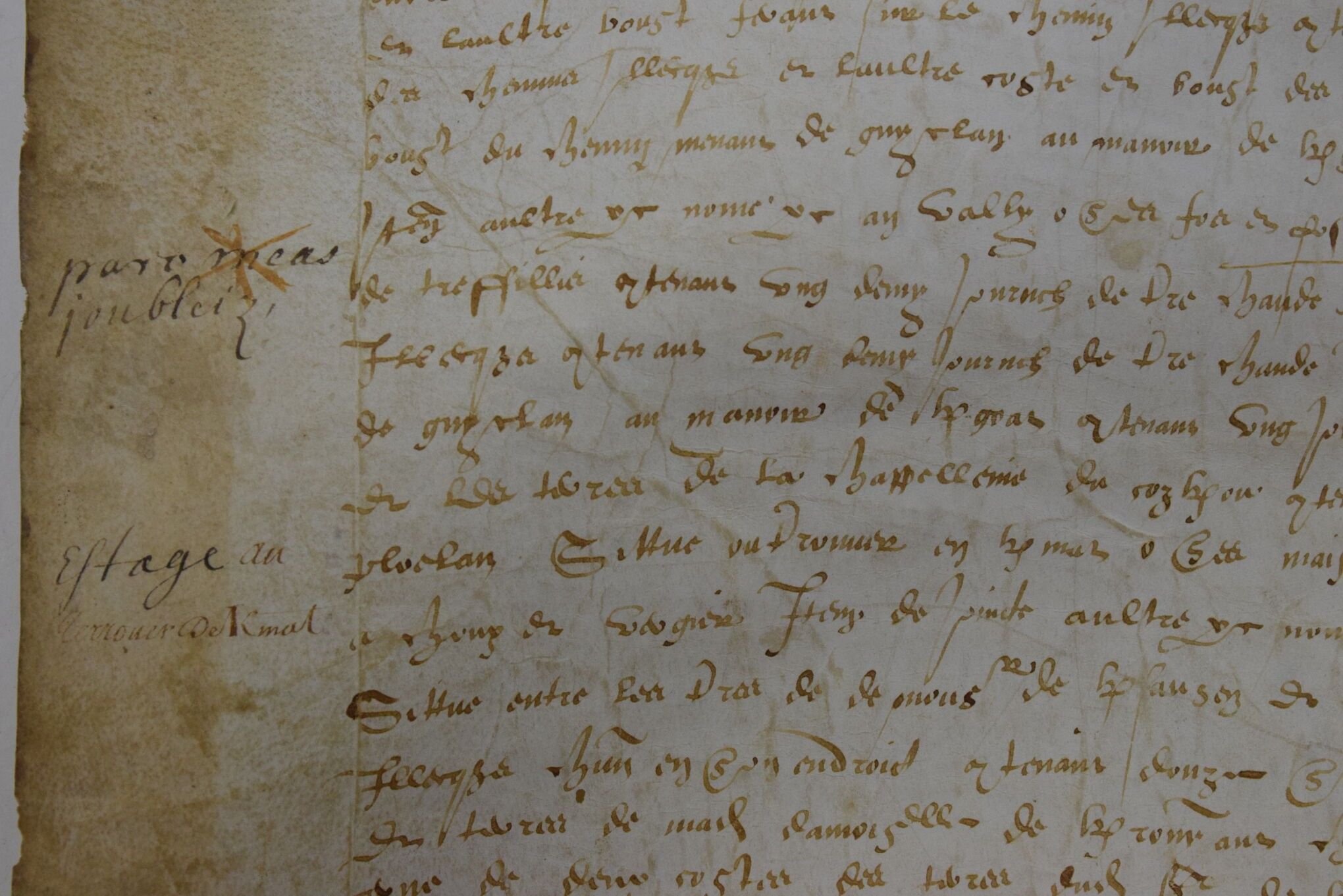 [MANUSCRIT - BRITTANY] Aveu provided to His Lordship of Landivisiau on 22 October 1560. Large manuscript document (52.5 x 186 cm) consisting of 3 assembled parchments. Aveu for the land and seigneury of Trefilly and Guiclan received at the Plaids généraux de Penses (Penzé). Creases and rubbing at the top of the parchment make it partly impossible to read the first lines, two small holes with the loss of a few letters, the end of the text and the signatures are missing.