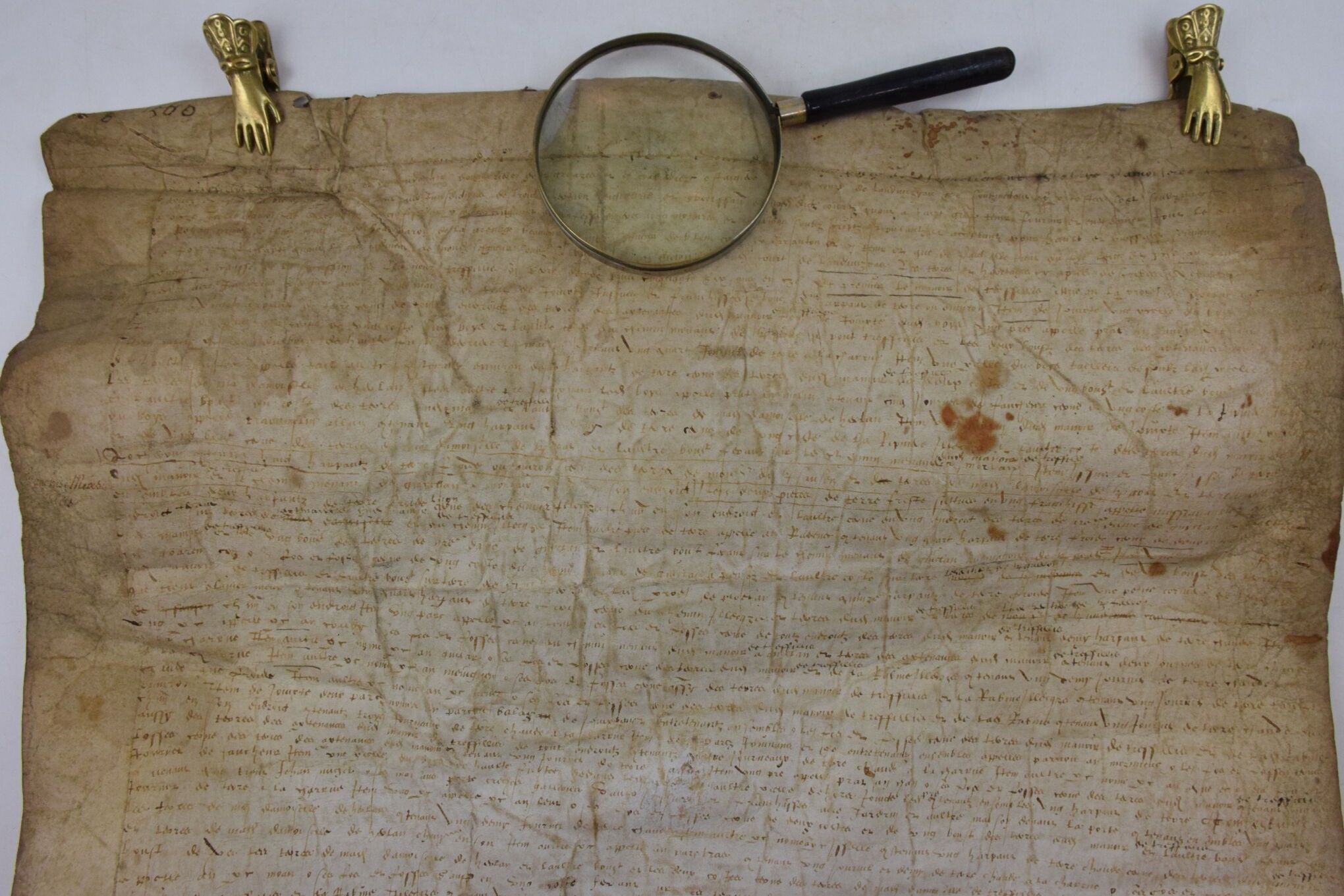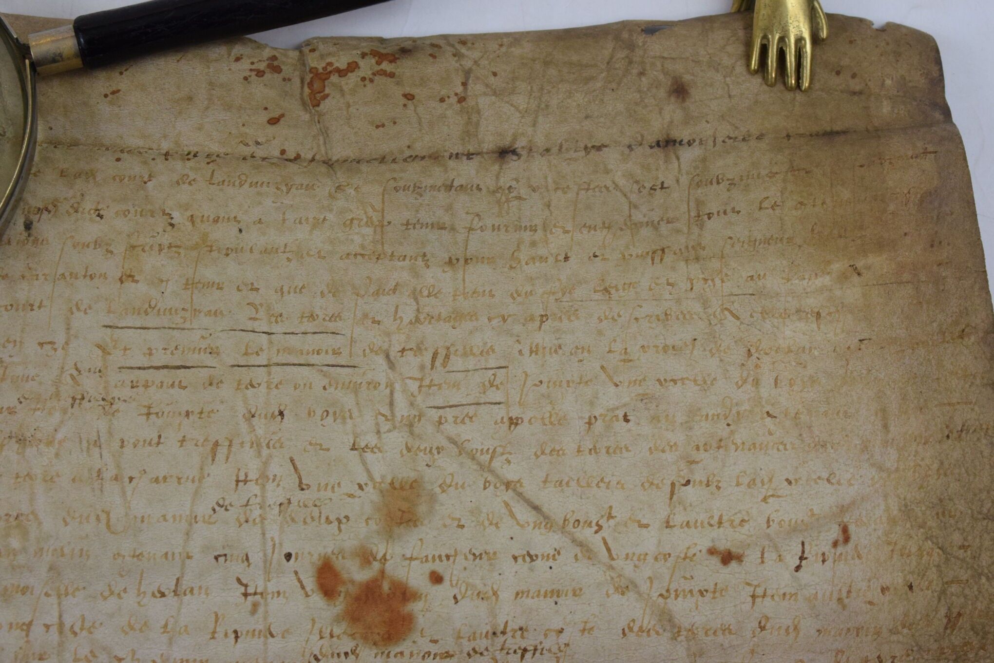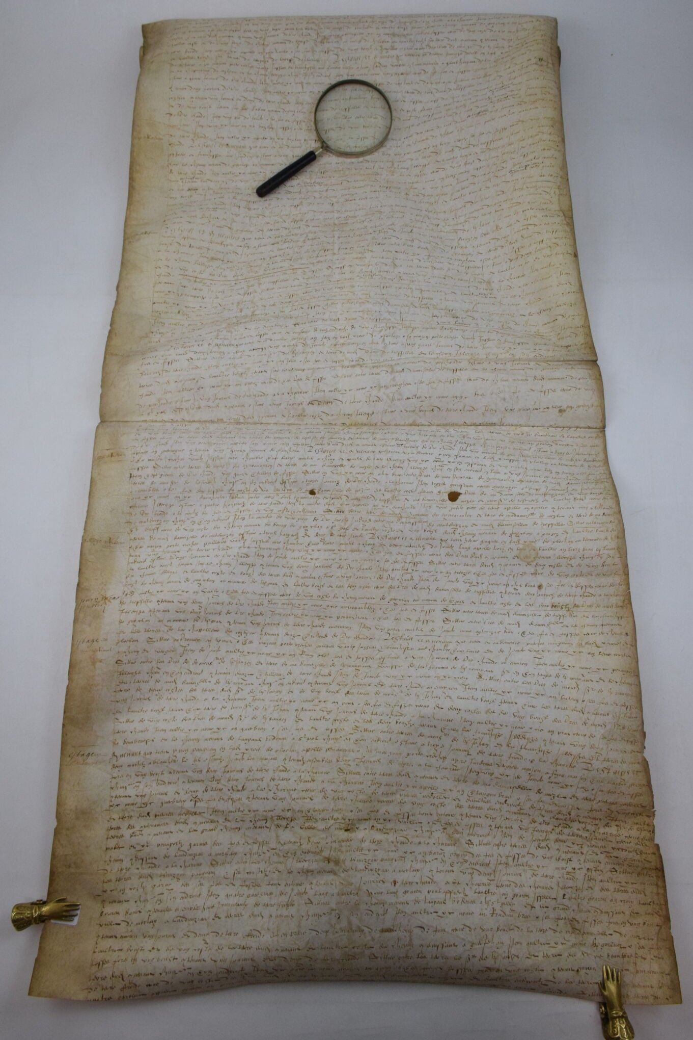 [MANUSCRIT - BRITTANY] Aveu provided to His Lordship of Landivisiau on 22 October 1560. Large manuscript document (52.5 x 186 cm) consisting of 3 assembled parchments. Aveu for the land and seigneury of Trefilly and Guiclan received at the Plaids généraux de Penses (Penzé). Creases and rubbing at the top of the parchment make it partly impossible to read the first lines, two small holes with the loss of a few letters, the end of the text and the signatures are missing.