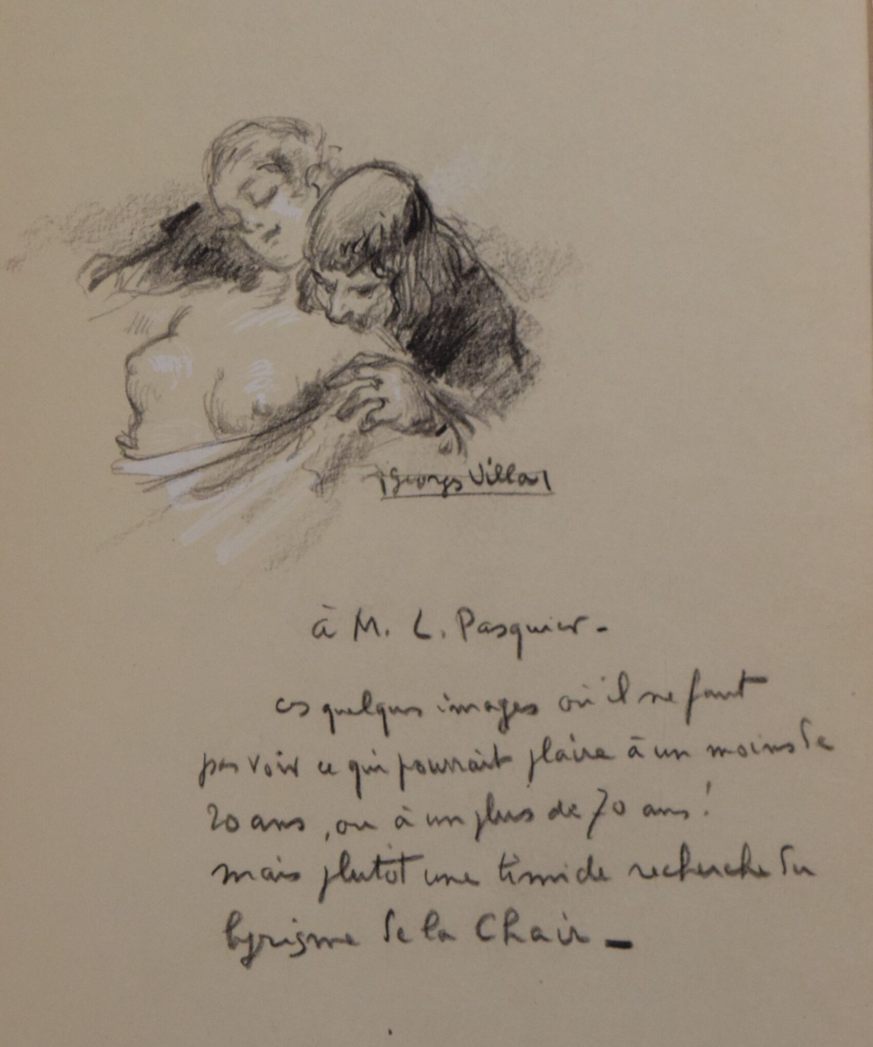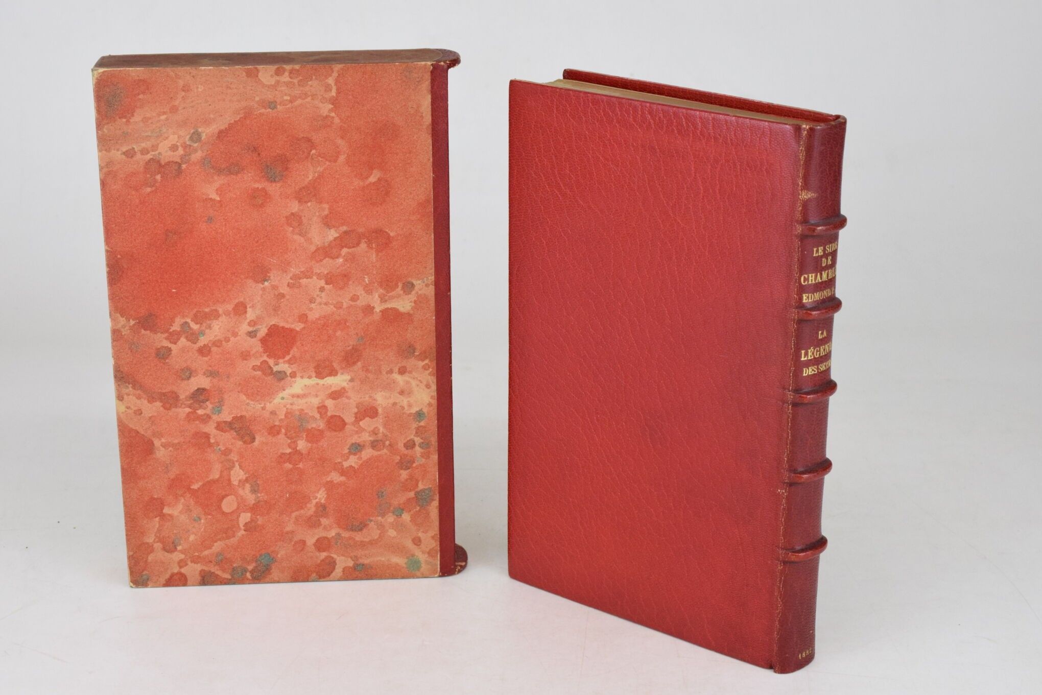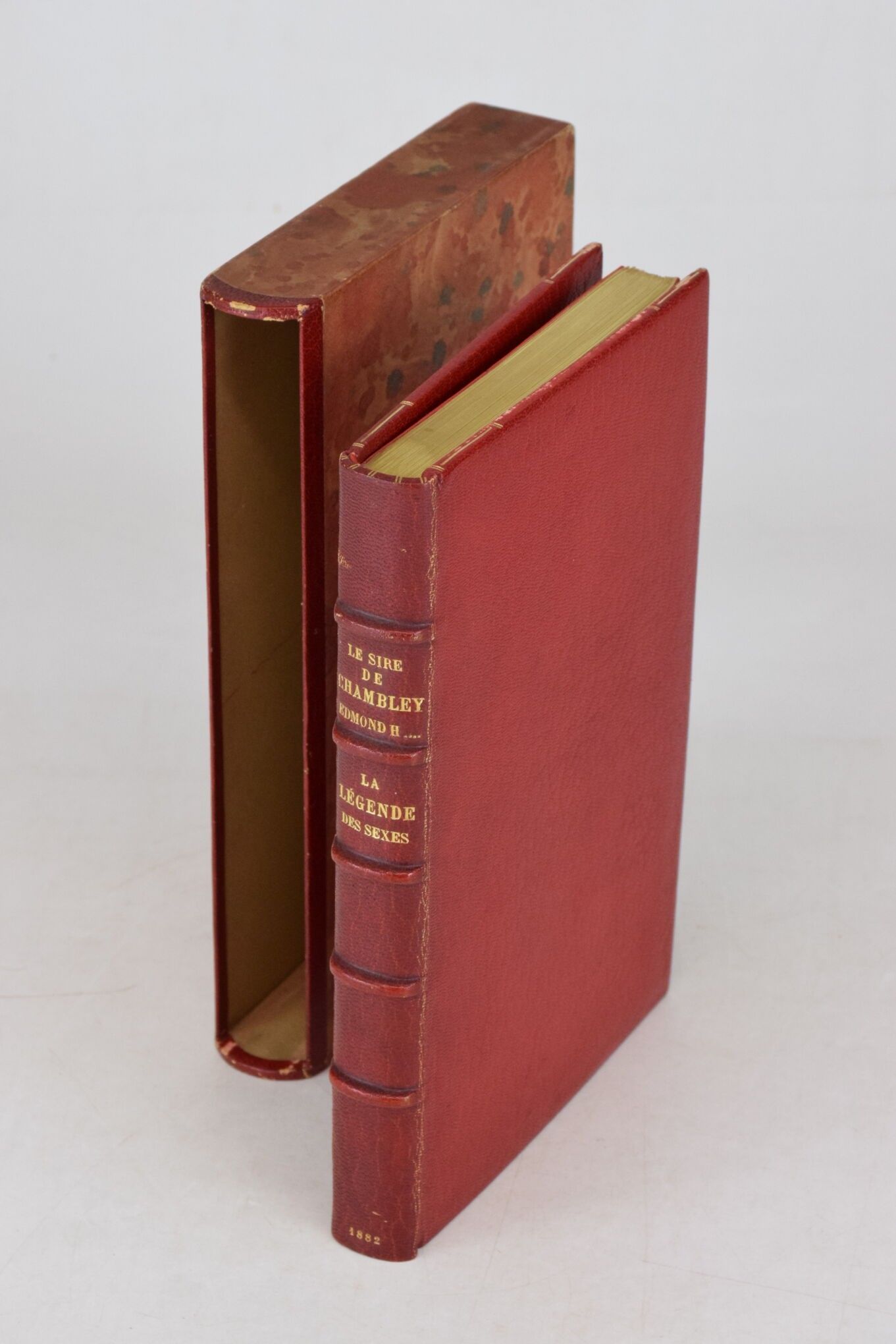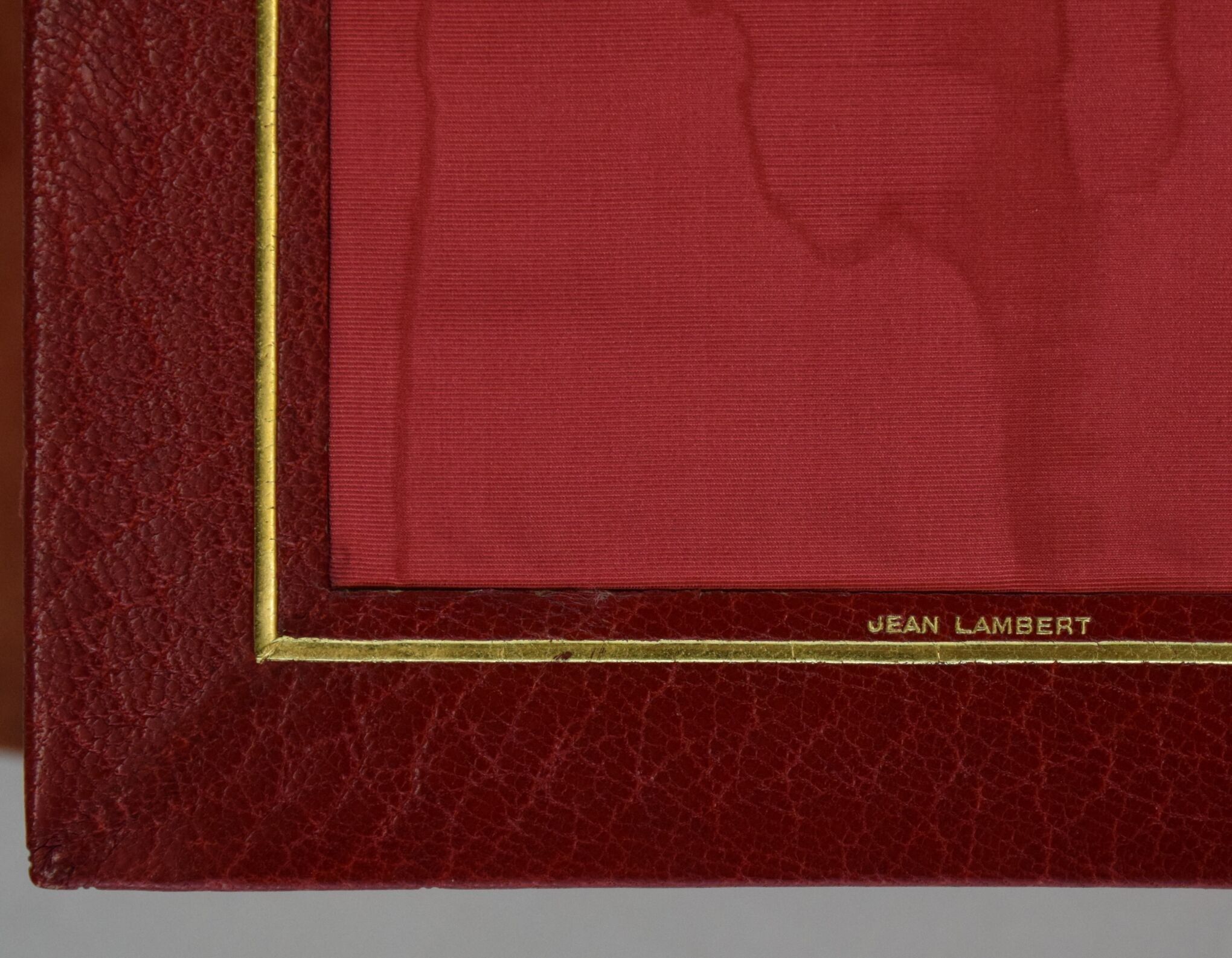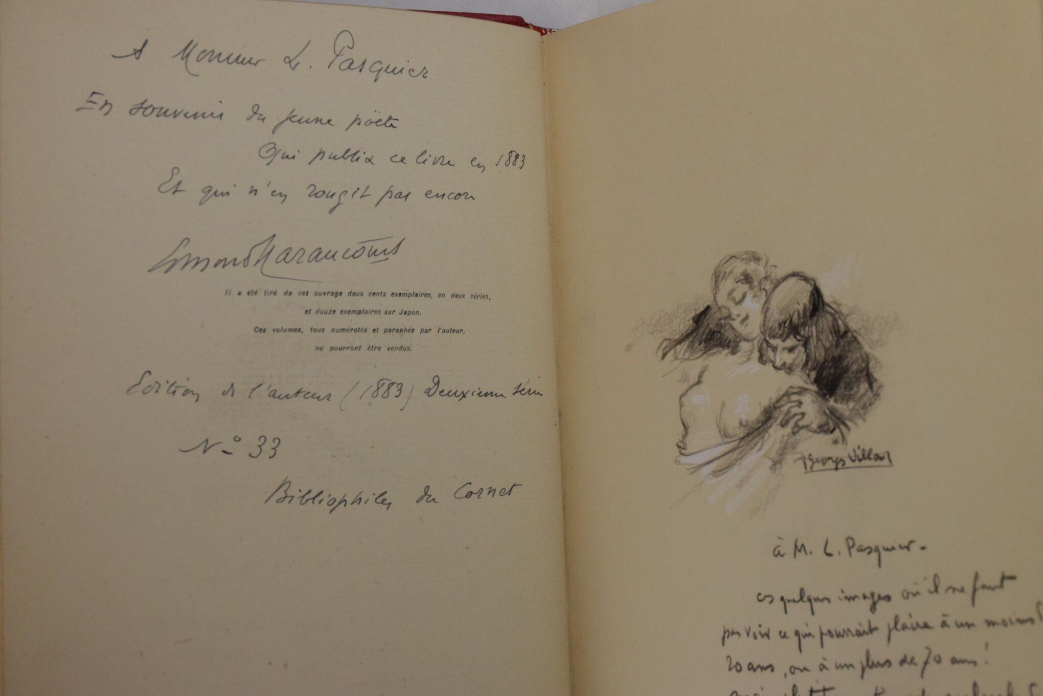 Printed in Brussels for the author, [Nevers], 1882 (1883). In-8, 147-(1 bl.) pp, 2 ff, bound in red morocco, gilt fillets on the edges, binding lined with a broad morocco band, silk spine and endpaper, upper edge gilt, covers and spine preserved, bordered slipcase. Binding by Jean Lambert, active in Paris between 1935 and 1955. First edition with a suite of drawings by Georges Villa, an illustrated menu and a fine autograph letter. This collection of poems was published in 1883 in Nevers while the author was staying there as editor-manager of the newspaper "La République". On verso of false title: "Il a été tiré de cet ouvrage 200 ex. en 2 séries et 12 ex. sur Japon. These volumes, all numbered and initialled by the author, cannot be sold. This is copy no. 33 of the second series on laid paper. The "achevé d'imprimer" indicates 15 April 1883, the cover is dated 1882. Dutel, 444, gives the second series on wove paper (!), Pia 765. This copy contains the suite of 12 original lithographs by Georges Villa, coloured, printed at 60 copies on Japon for the Société des Bibliophiles du Cornet in 1930, as well as the illustrated menu of the dinner given on the occasion of the publication of this suite on 4 November 1930. Carteret II-245 "In addition to the published works, the society publishes each year either a yearbook or a suite of engravings as was the case for Edmond Haraucourt's famous work: La Légende des siècles [...] intended to be attached to the rare Brussels first edition." Slipcase rubbed at edges, slight rubbing at spine and joins, a very good copy.