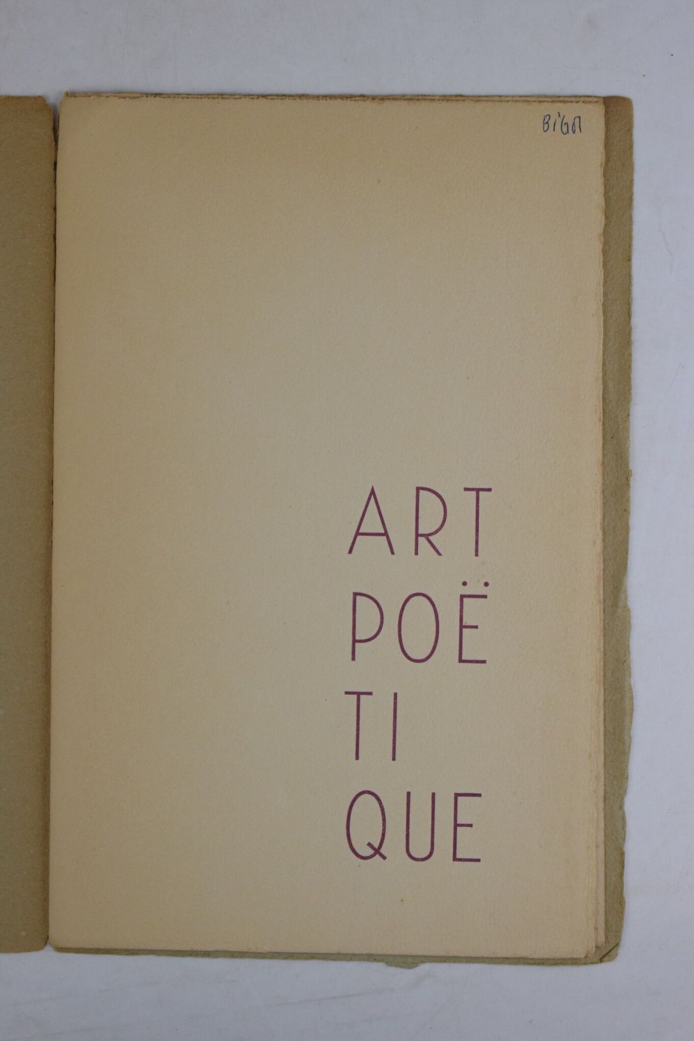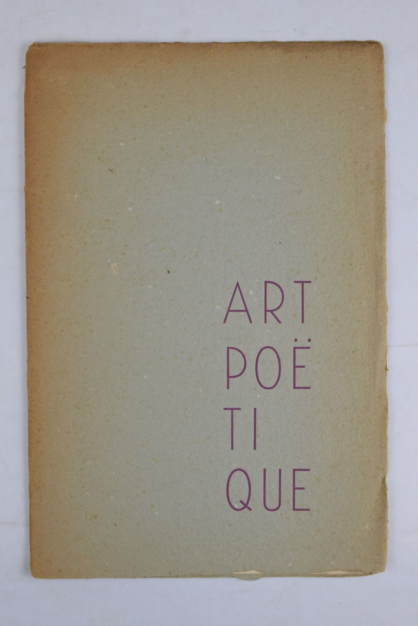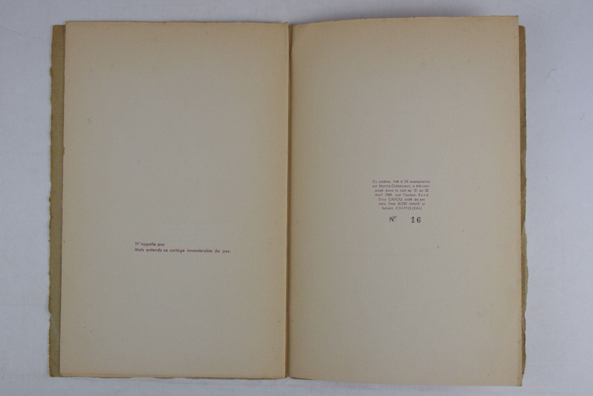 CADOU (René Guy). Art poétique. S.l., s.n., night of 21-22 April 1949. Booklet in-8, 4 pages, printed cover. First edition. "This poem, printed in an edition of 25 copies on Marais Crèvecœur, was composed during the night of 21 to 22 April 1949, by the author, René Guy Cadou, assisted by his friends Yves Boré-Mahé and Sylvain Chiffoleau". Name of (Guy) Bigot inscribed in pen in the upper corner of the title leaf, spine unstained and split at head over 3 cm.