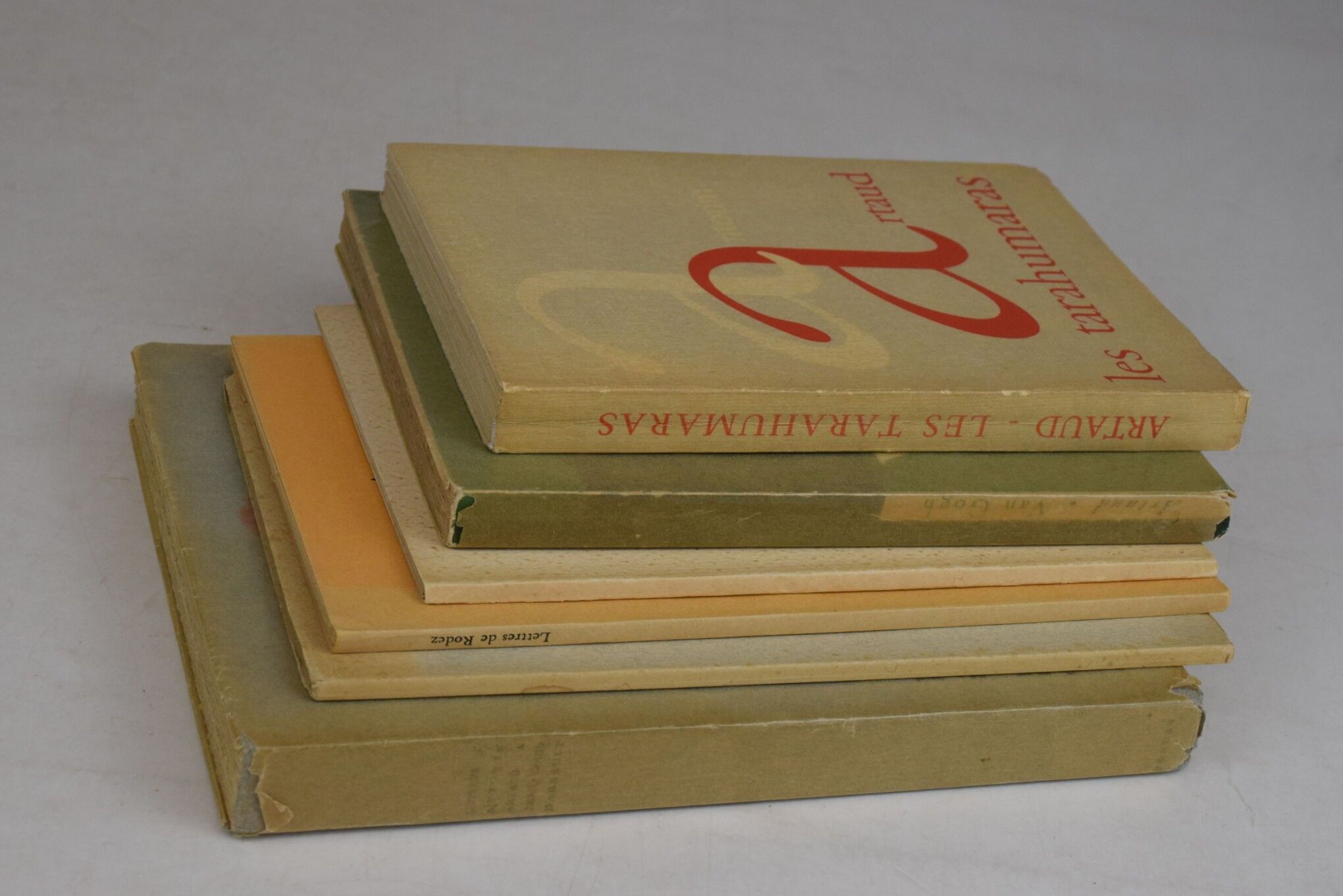 ARTAUD, Antonin. Set of 6 titles. - Les Tarahumaras. Décines, l'Arbalète, Marc Barbezat, 1963. In-12, paperback, partly uncut, a fine copy. - Lettres contre la cabbale addressed to Jacques Prevel. Paris, Jacques Haumont, 1949. Booklet in-18, numbered edition at 1370 copies. Paperback, spotting on the cover. - Van Gogh. Le suicidé de la société. Paris, K publisher, 1947. Edition of 630 numbered copies, unnumbered copy printed on a strong Marais vellum paper. - Letters from Antonin Artaud to Jean-Louis Barrault. Paris, Bordas, 1952. In-12 paperback, spine unstained. - Letters from Rodez. GLM, May 1948. In-12, second edition of 1200 numbered copies, spine unstained. - Supplement to Lettres de Rodez followed by Coleridge le traitre. Portrait by Krol. GLM, March 1949. First edition of 1025 copies. Paperback, cover soiled.