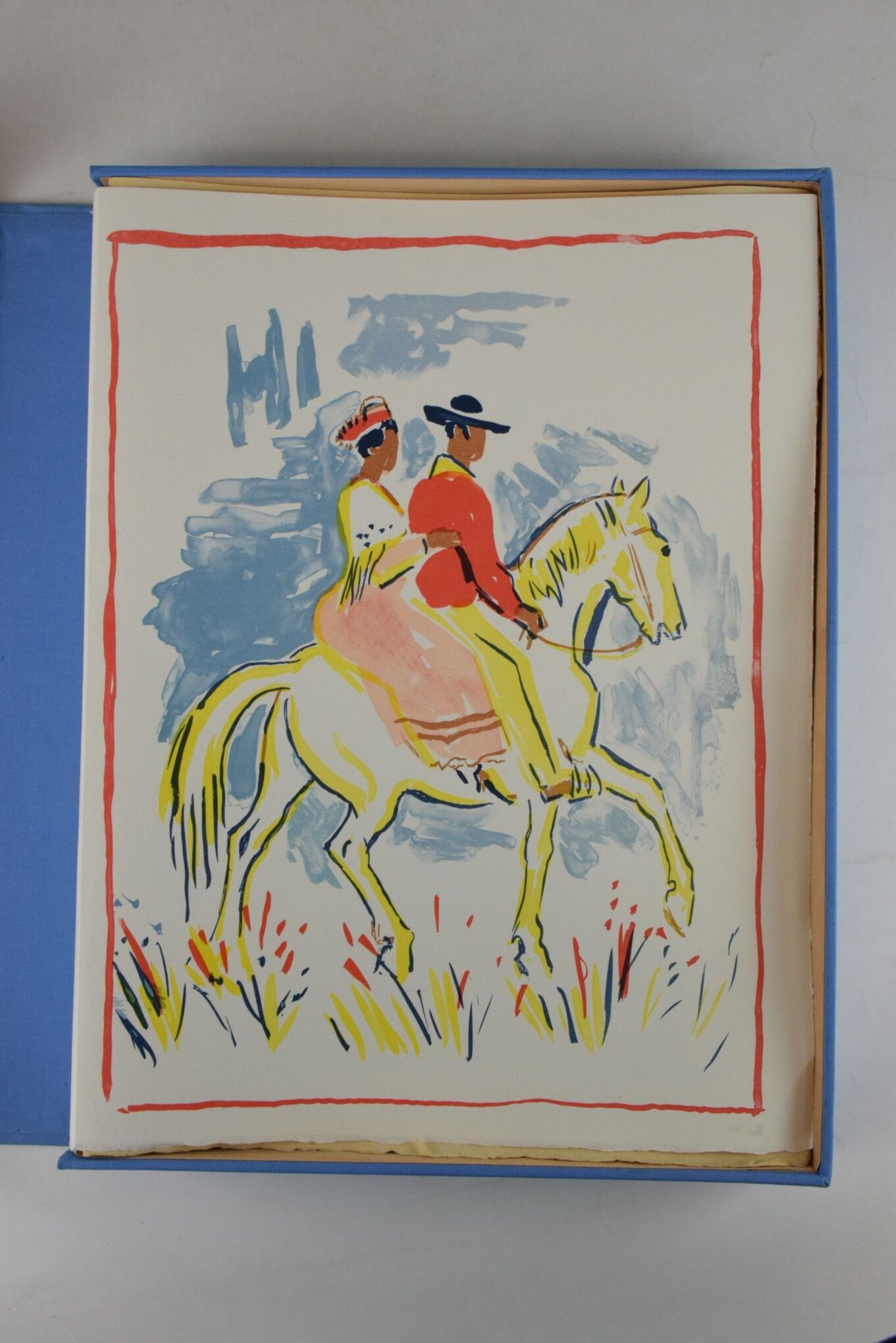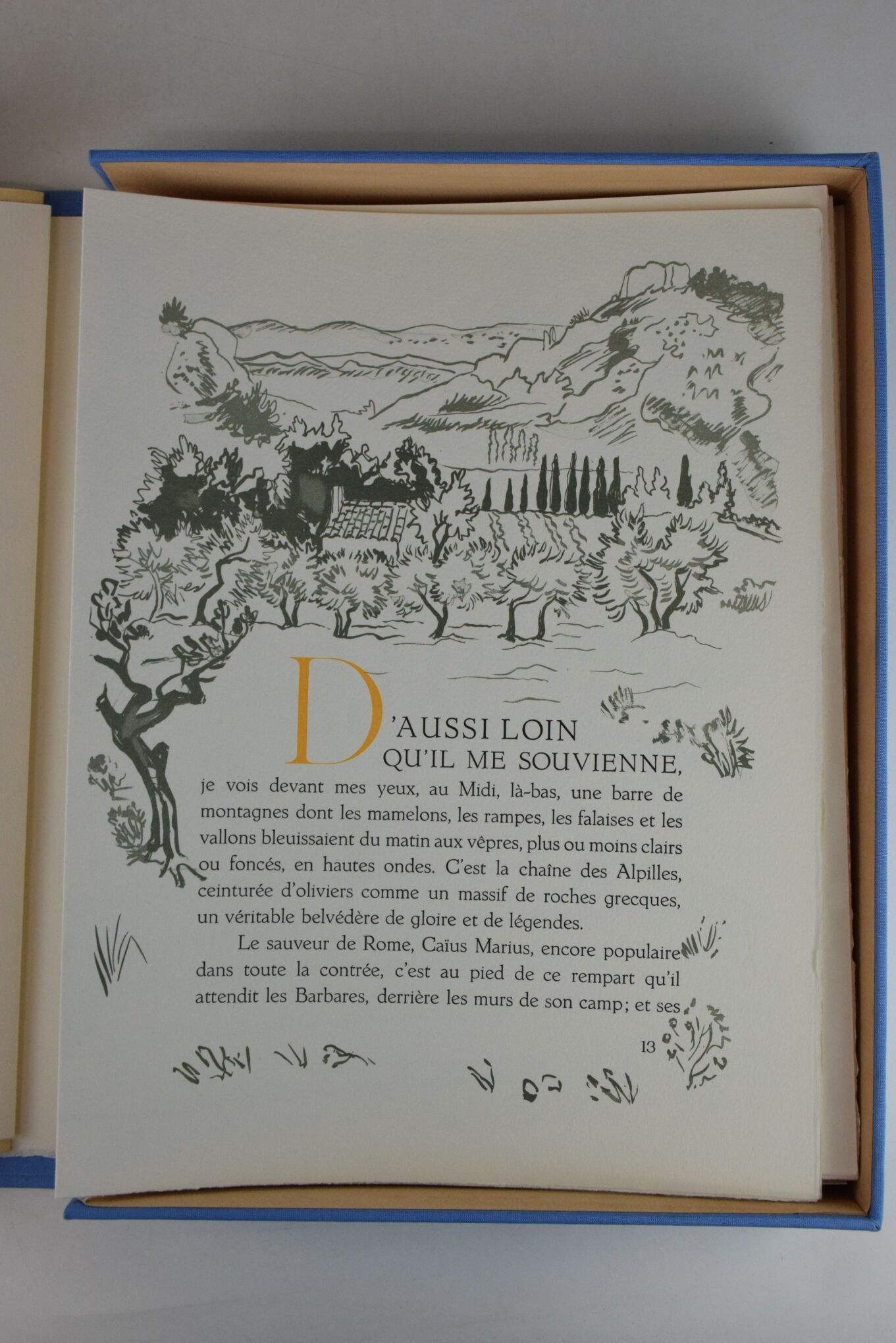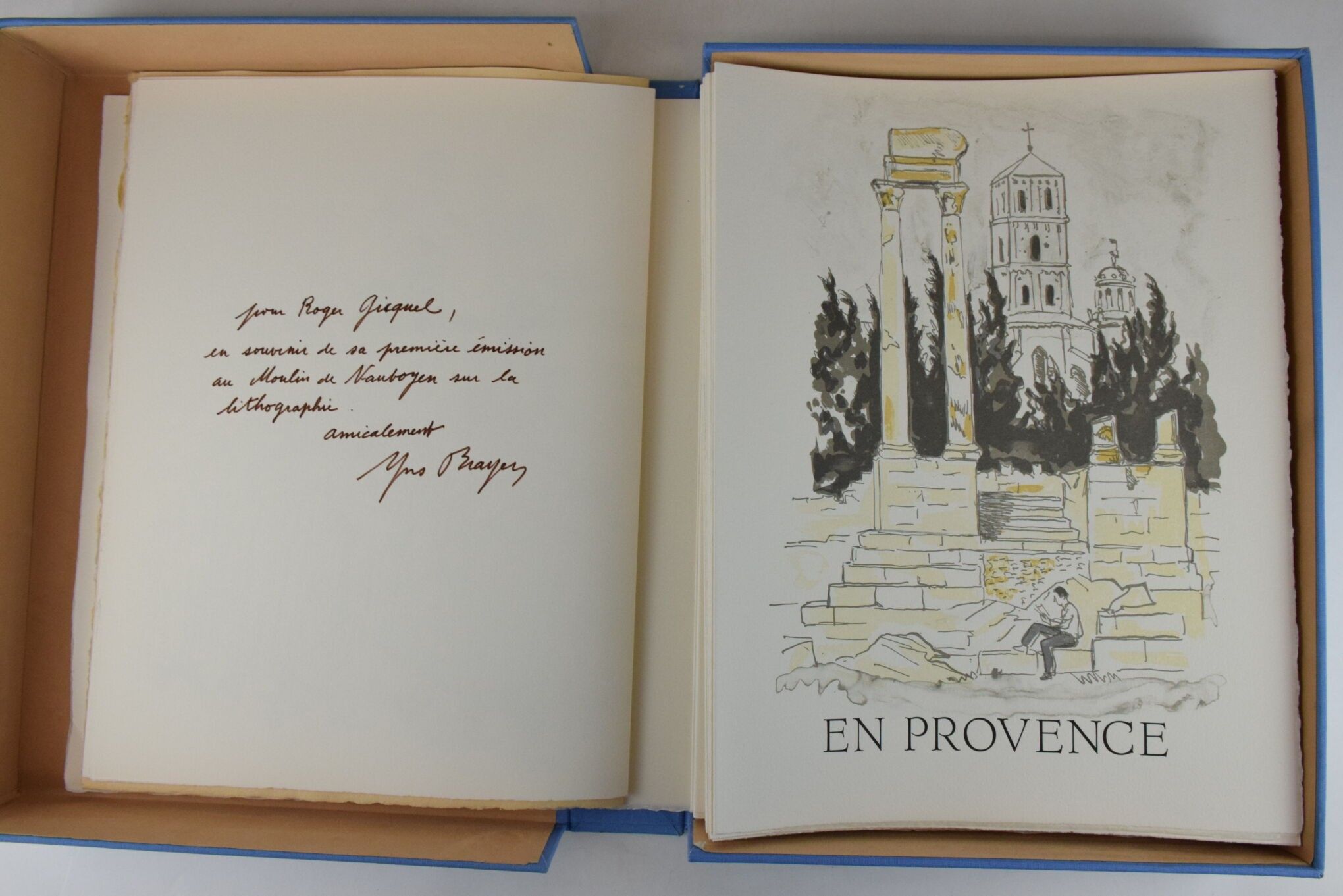 MISTRAL, Frédéric (illustrations by Yves BRAYER) En Provence. Frédéric Mistral sings about his childhood in Provence, accompanied by original lithographs by Yves Brayer, who introduces us to the region. Moulin de Vauboyen, Bièvres, Pierre de Tartas, 1983. In-folio, 72-4 pp. illustrated with 8 original off-text colour lithographs on double plates, 40 illustrations in-text and 2 colour illustrations on the covers, the table of plates is under an embossed illustrated cover. Limited edition of 560 copies, one of the unnumbered copies on large Arches vellum, dedicated by Yves Brayer to, and printed specially for, Mr Roger Gicquel, famous television presenter. Sheet in publisher's cloth slipcase, minor stains to box, very good condition.