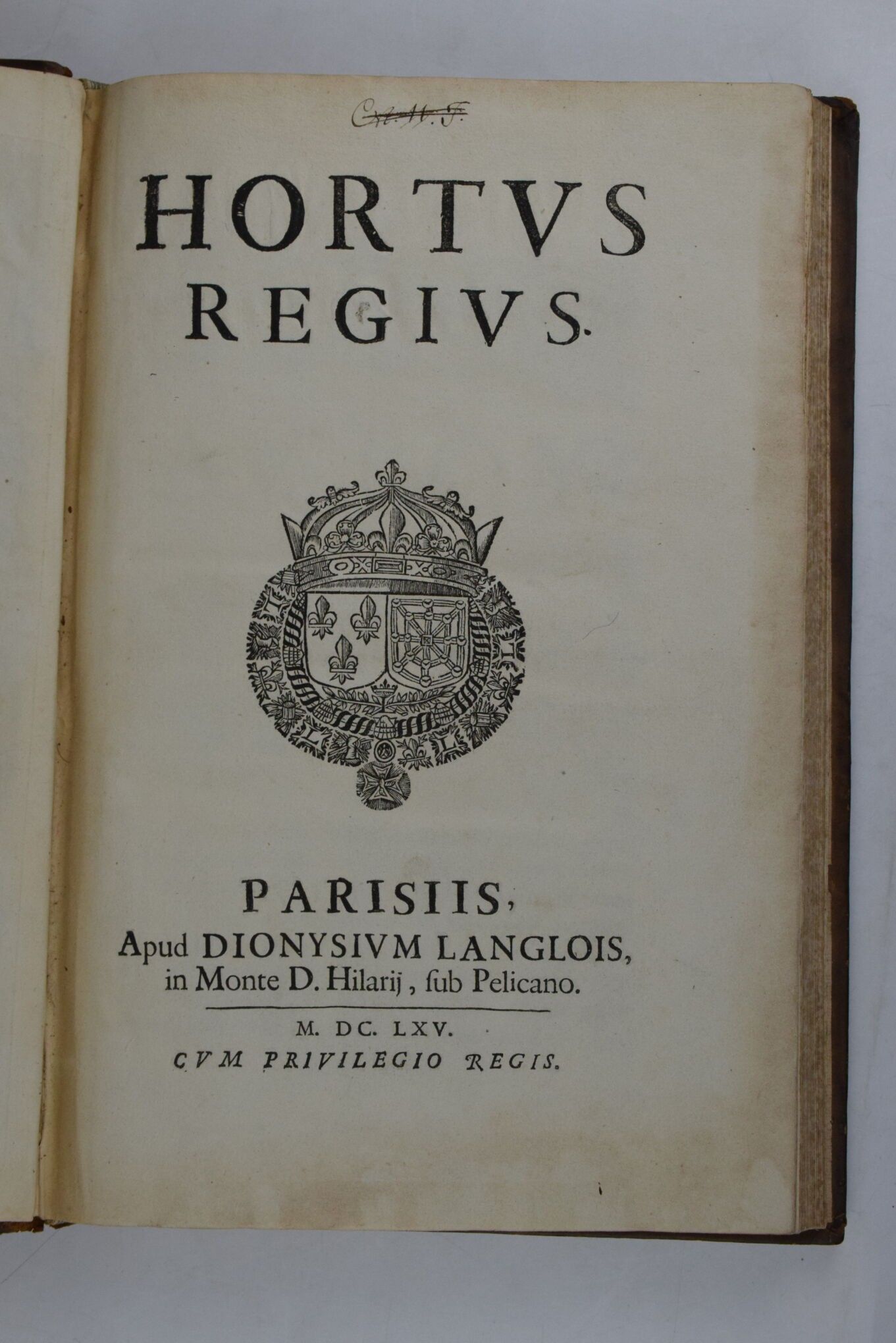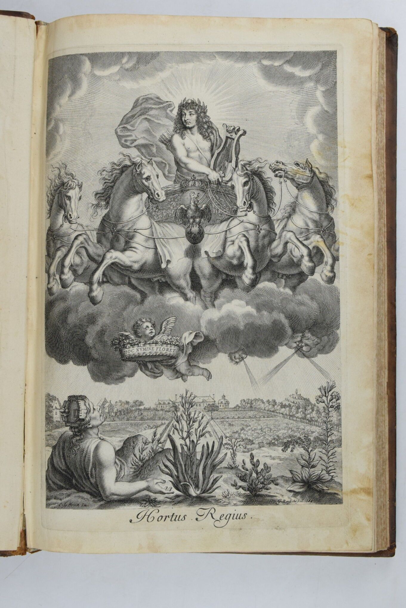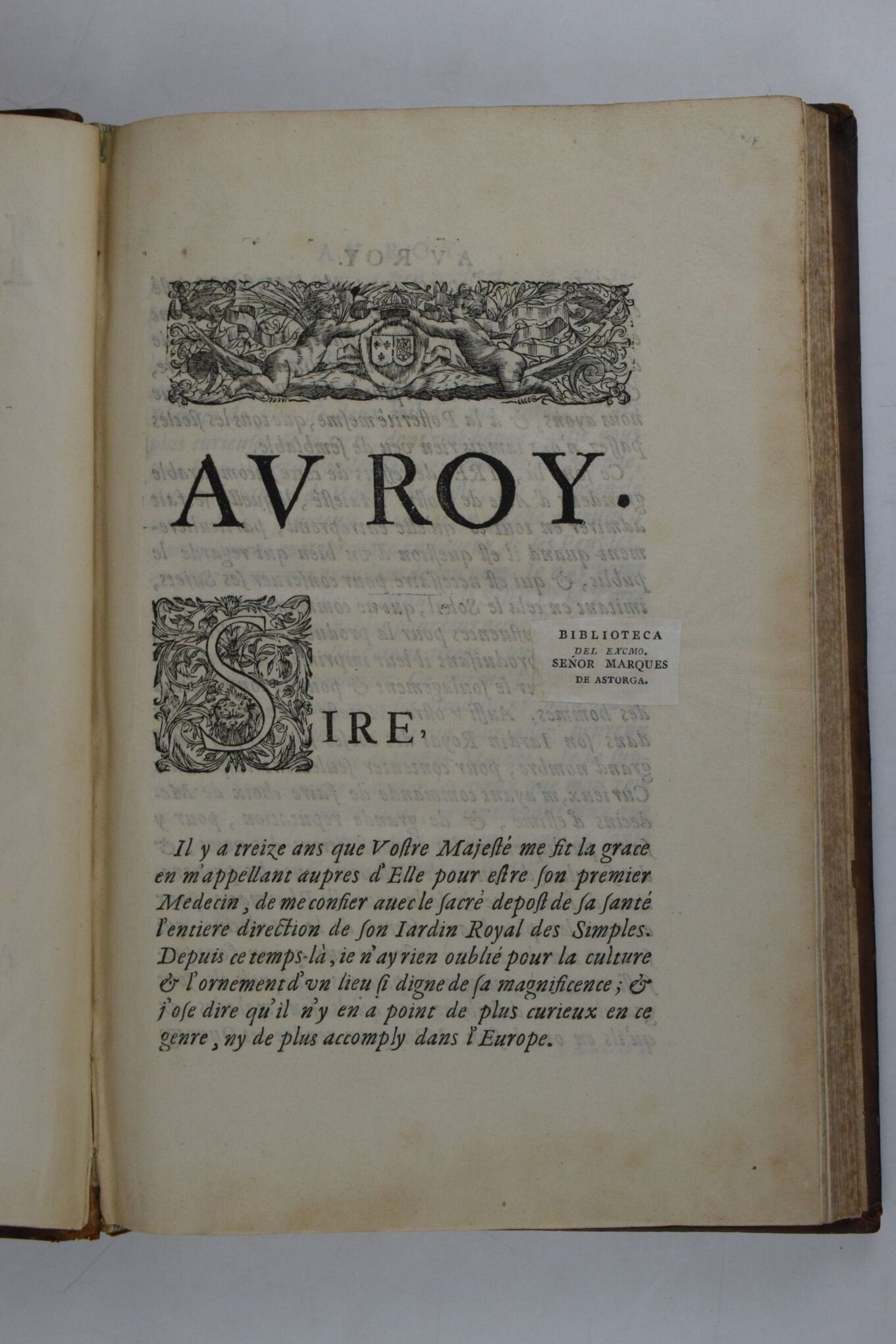 JONCQUET, Denis (1600-1671) - FAGON, Guy-Crescent (1638-1718) - GAVOIX. Hortus Regius. Paris, Dionysium Langlois, 1665. In-folio, (10) ff. including engraved frontispiece and title, 188-(4) pages. Bound in contemporary speckled calf, the restored spine fully lined, upper cover missing, corners open, old inscriptions on white endpaper, ex-libris label on first dedication leaf "Biblioteca del excmo. señor Marques de Astorga", 1 browned quire, internally in good condition with wide margins. Rare first edition.
