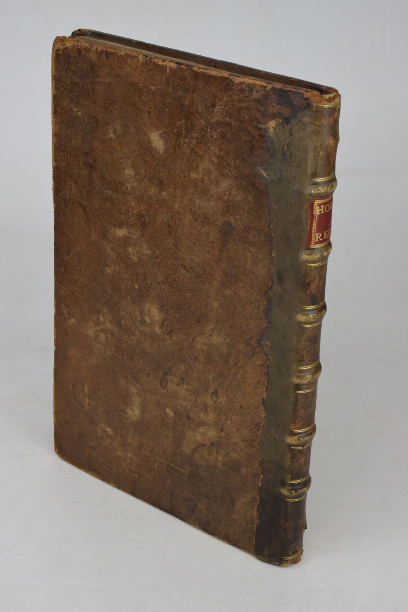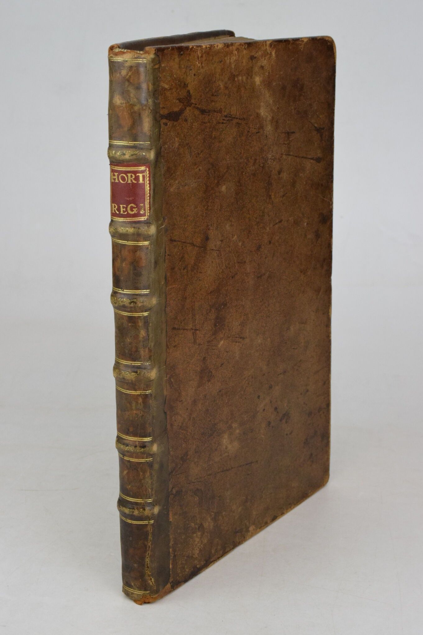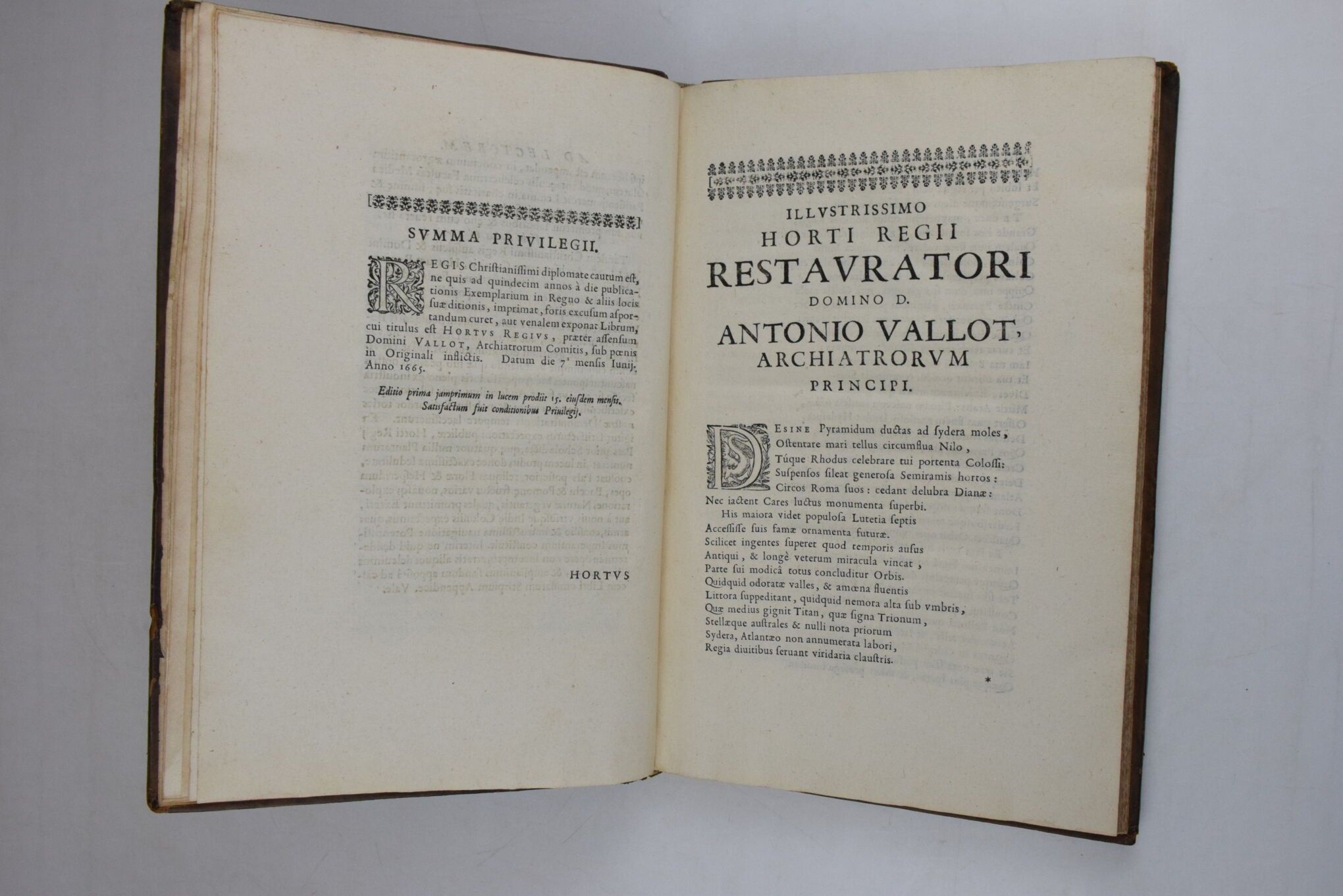 JONCQUET, Denis (1600-1671) - FAGON, Guy-Crescent (1638-1718) - GAVOIX. Hortus Regius. Paris, Dionysium Langlois, 1665. In-folio, (10) ff. including engraved frontispiece and title, 188-(4) pages. Bound in contemporary speckled calf, the restored spine fully lined, upper cover missing, corners open, old inscriptions on white endpaper, ex-libris label on first dedication leaf "Biblioteca del excmo. señor Marques de Astorga", 1 browned quire, internally in good condition with wide margins. Rare first edition.