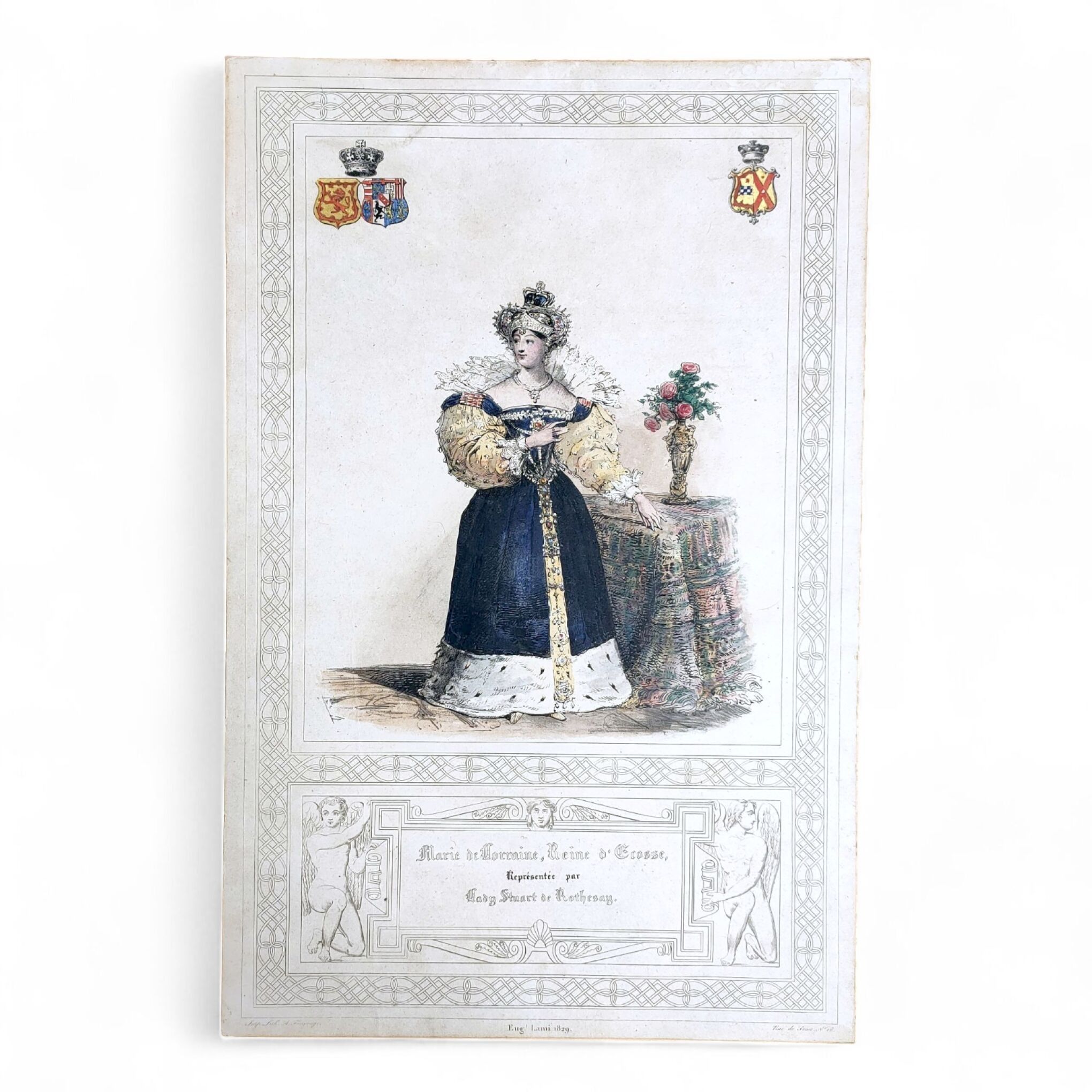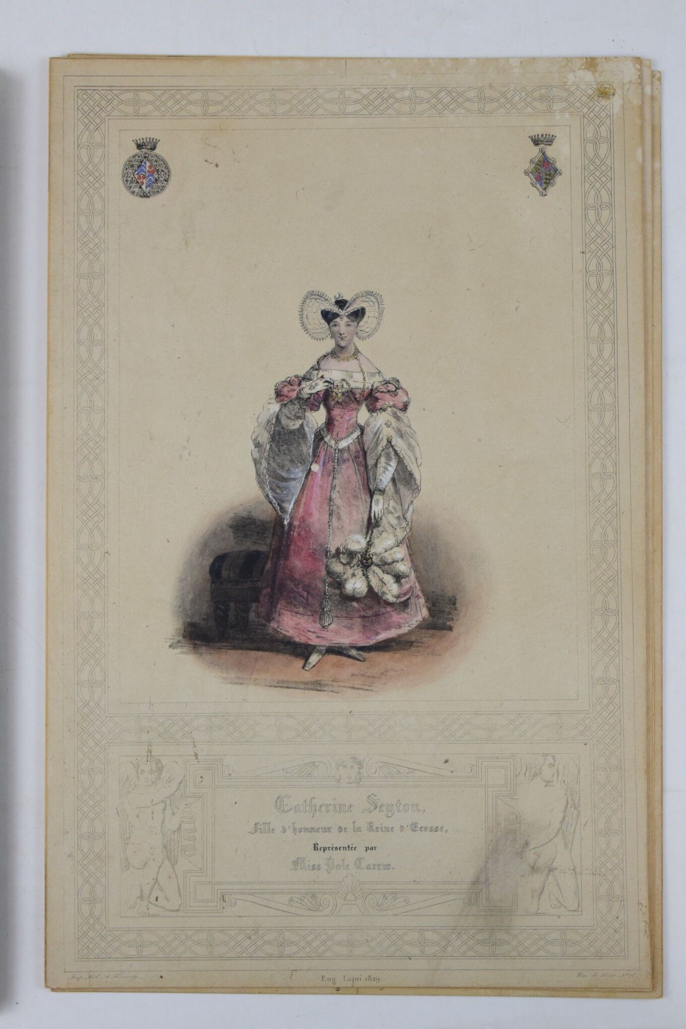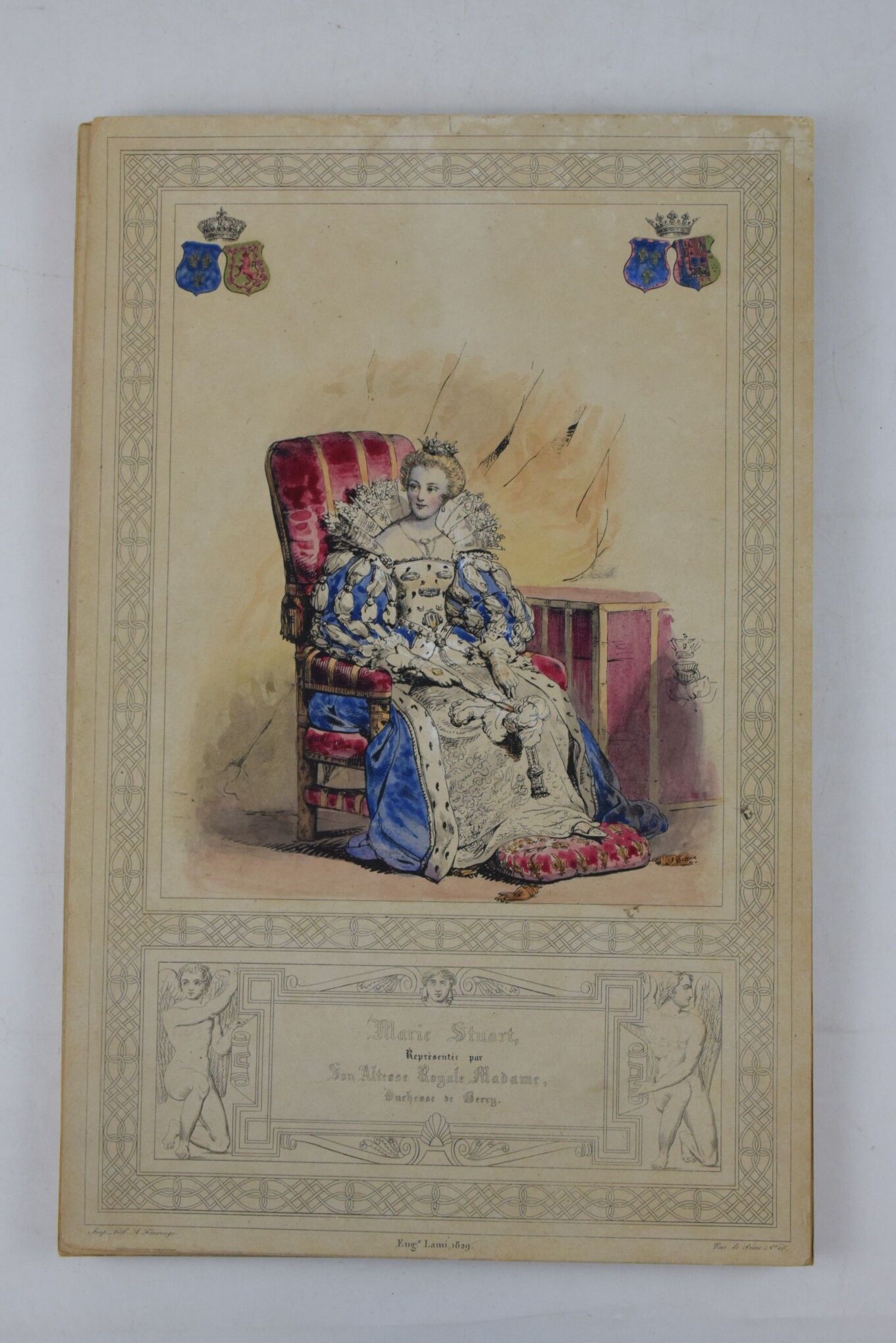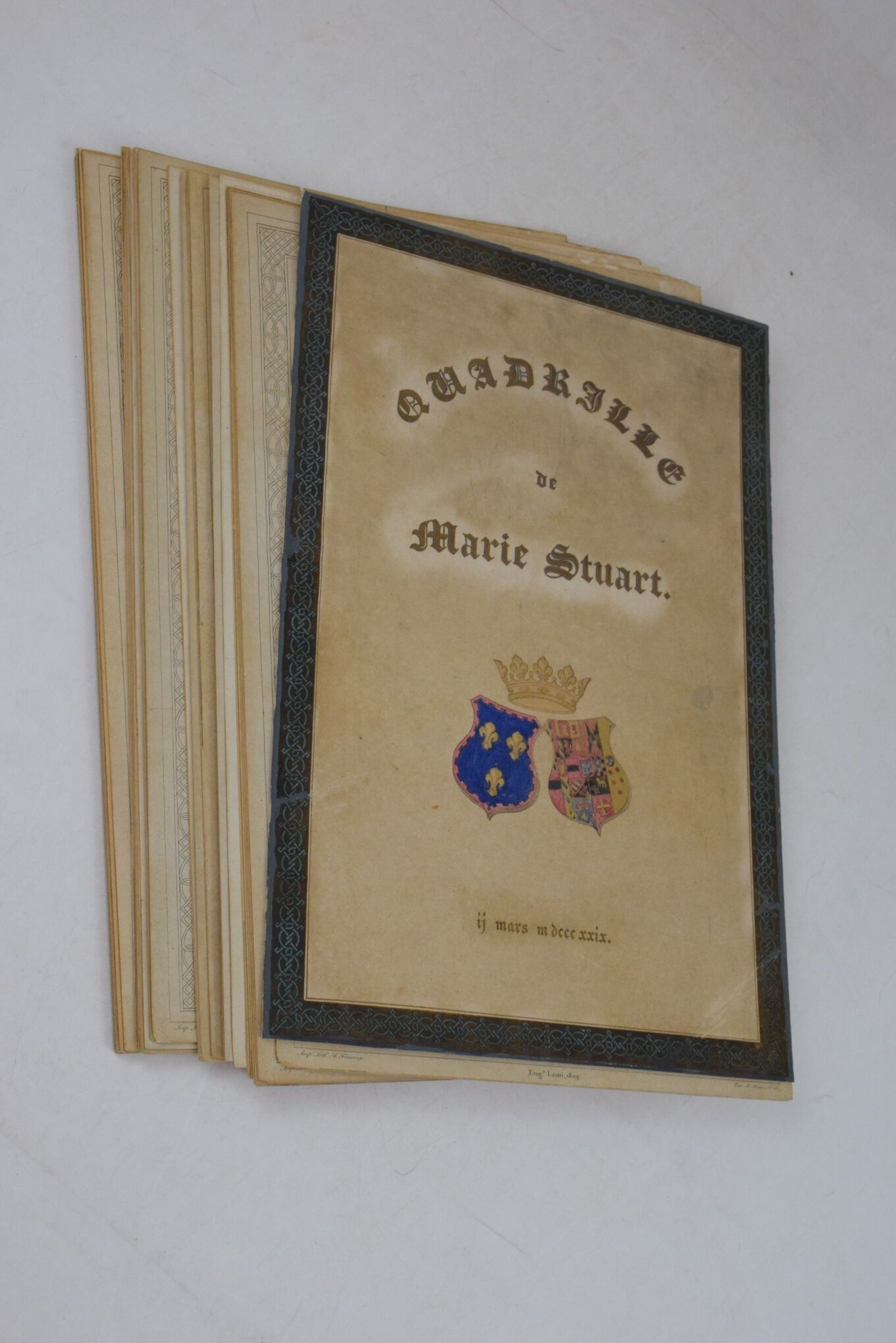 LAMI, Eugène. Quadrille de Marie Stuart. 1929 (Paris), 2 March 1829. In-folio (234 x 341 mm), 22 lithographed and watercoloured plates including a title and 21 portraits on Chine. On sheets. Based on the watercolours Eugène Lami did at the famous costume ball given by the Duchesse de Berry on the theme of the marriage of Mary Stuart and the Dauphin François II. Only a few copies of this suite, which was not sold, were printed for members of the quadrille. Missing 5 plates (the 4 scenes and 1 portrait), the large frame has been removed, the title leaf dusty, lined on cardboard and the frieze of the frame retouched, one plate torn and reattached, 2 plates with traces. (Colas, I-1747)
