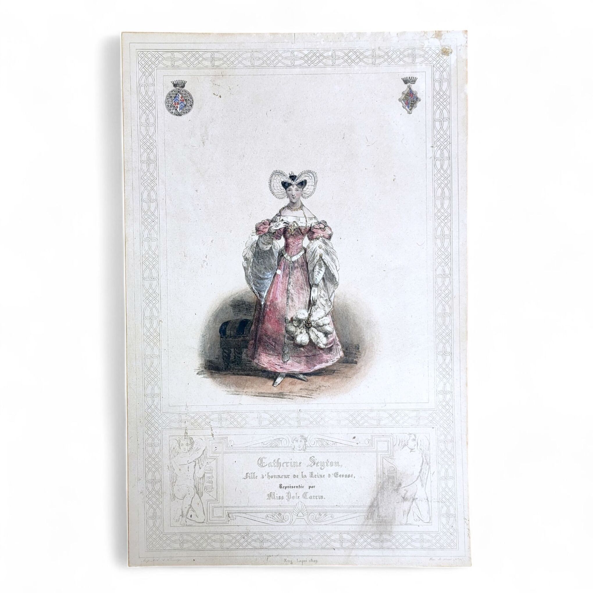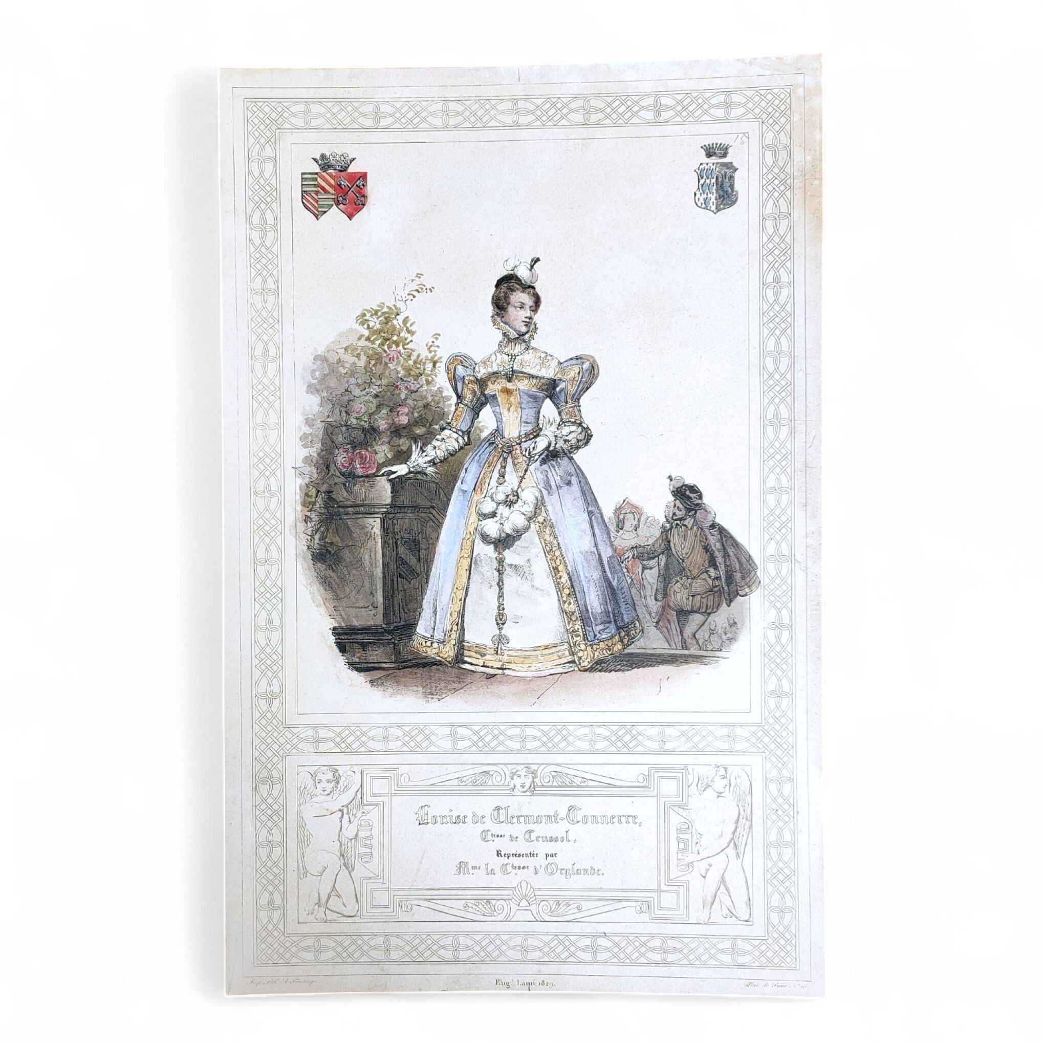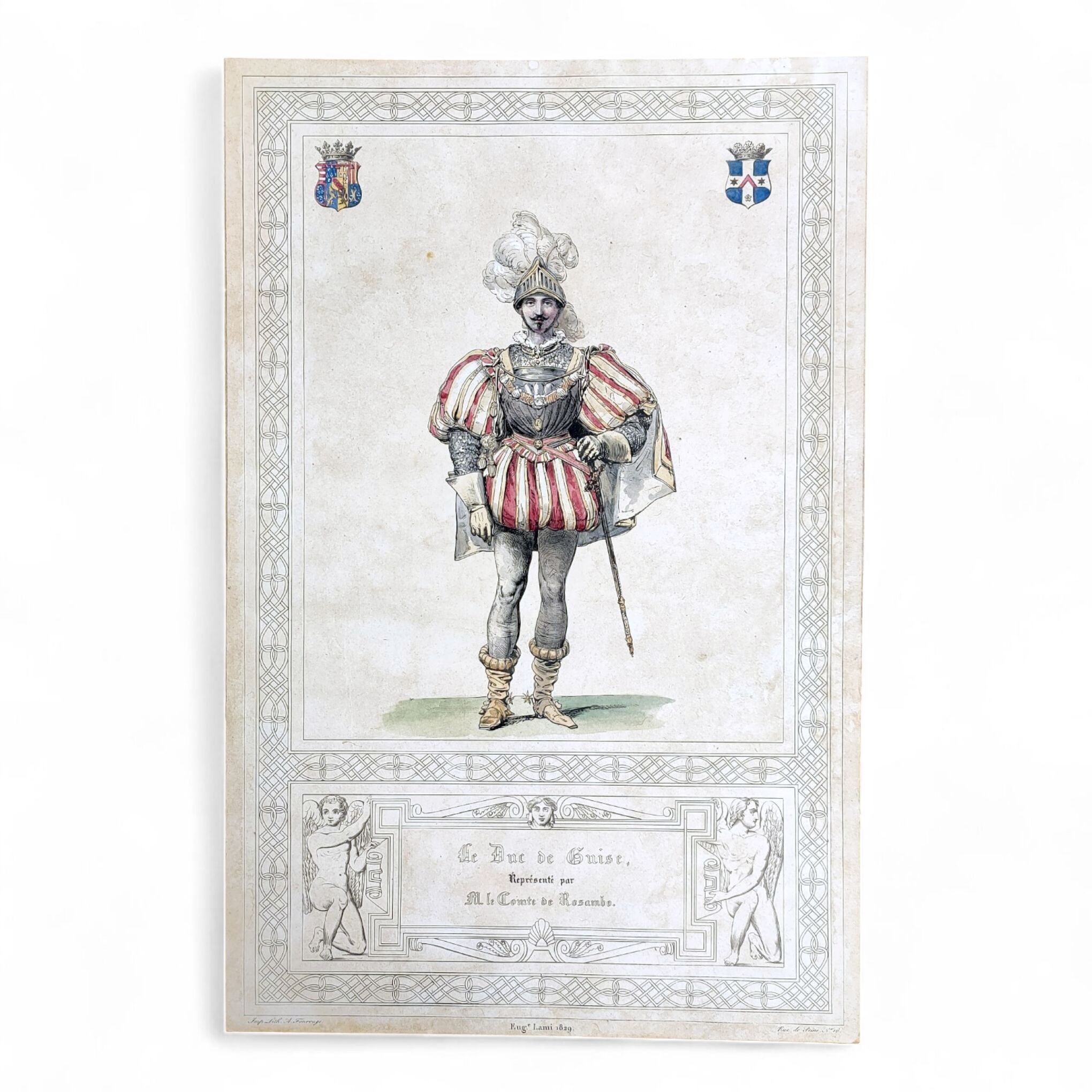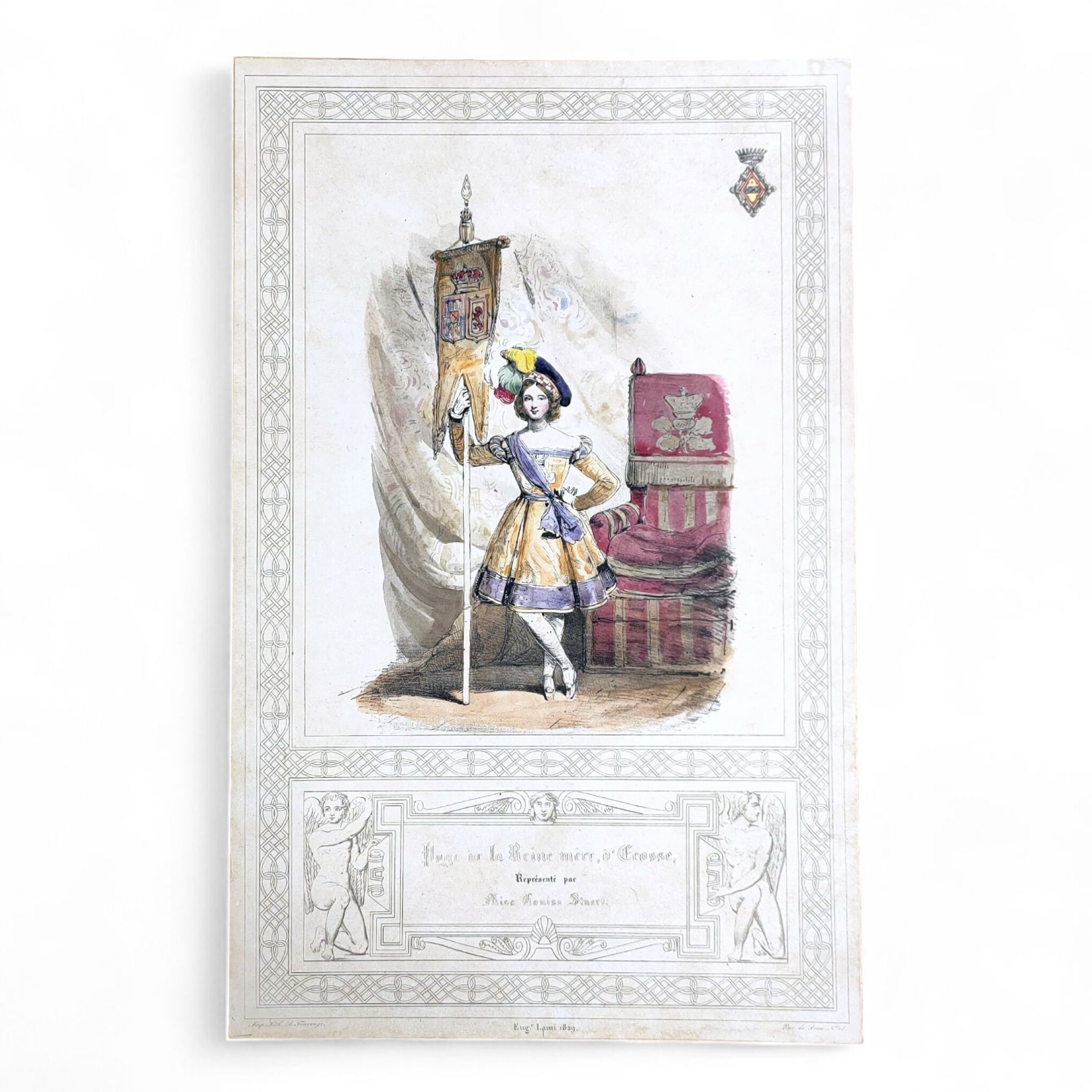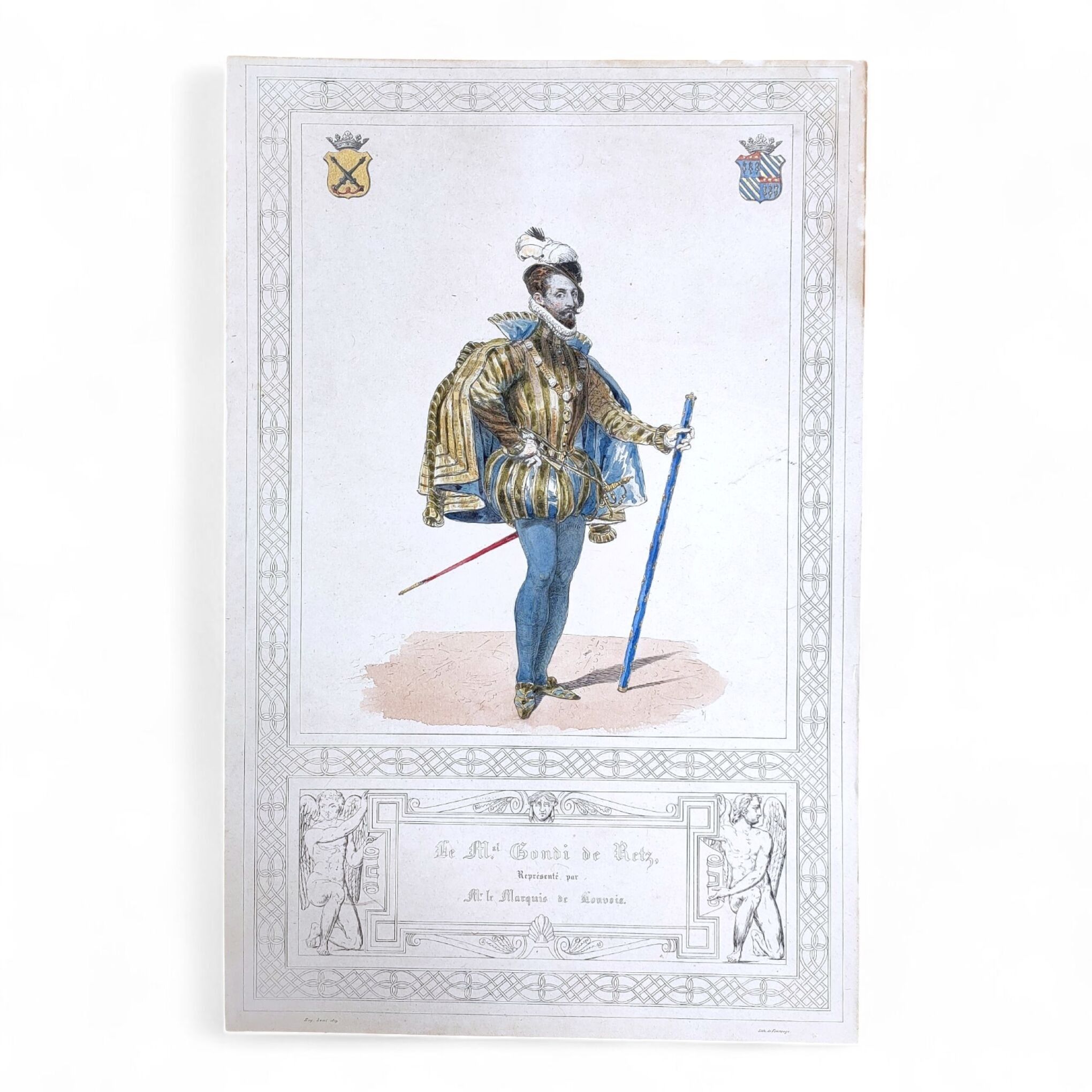 LAMI, Eugène. Quadrille de Marie Stuart. 1929 (Paris), 2 March 1829. In-folio (234 x 341 mm), 22 lithographed and watercoloured plates including a title and 21 portraits on Chine. On sheets. Based on the watercolours Eugène Lami did at the famous costume ball given by the Duchesse de Berry on the theme of the marriage of Mary Stuart and the Dauphin François II. Only a few copies of this suite, which was not sold, were printed for members of the quadrille. Missing 5 plates (the 4 scenes and 1 portrait), the large frame has been removed, the title leaf dusty, lined on cardboard and the frieze of the frame retouched, one plate torn and reattached, 2 plates with traces. (Colas, I-1747)