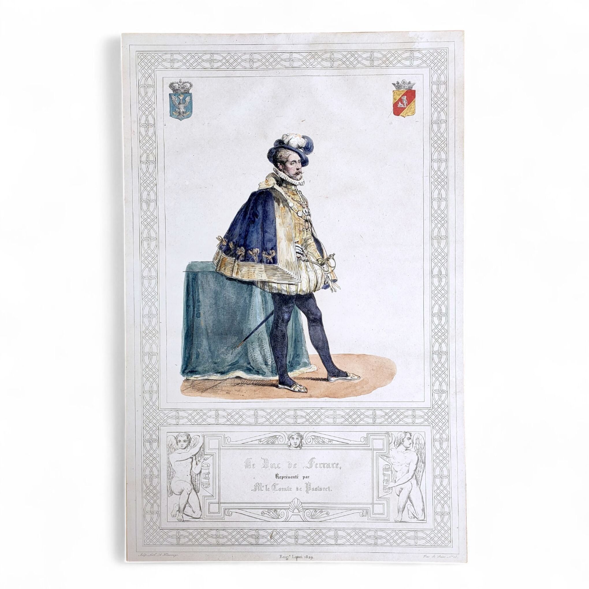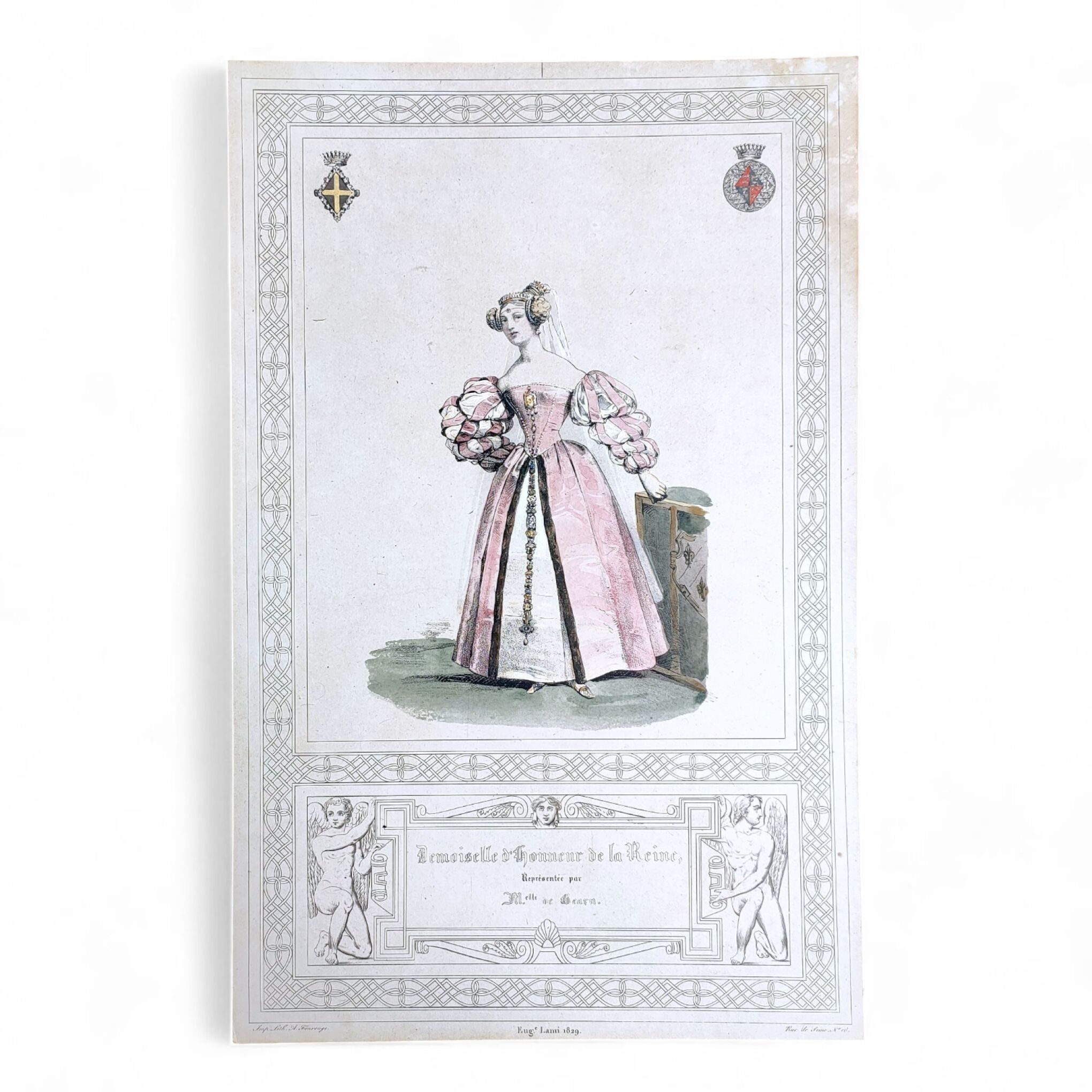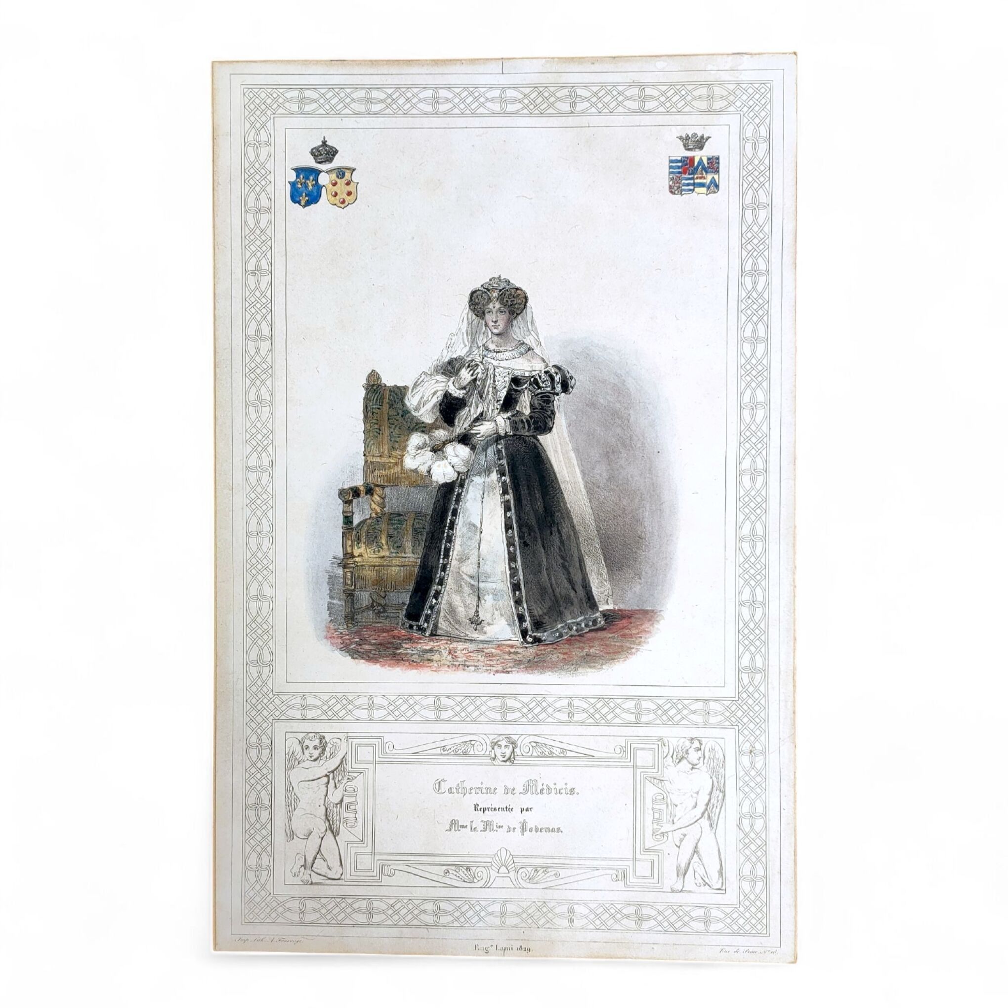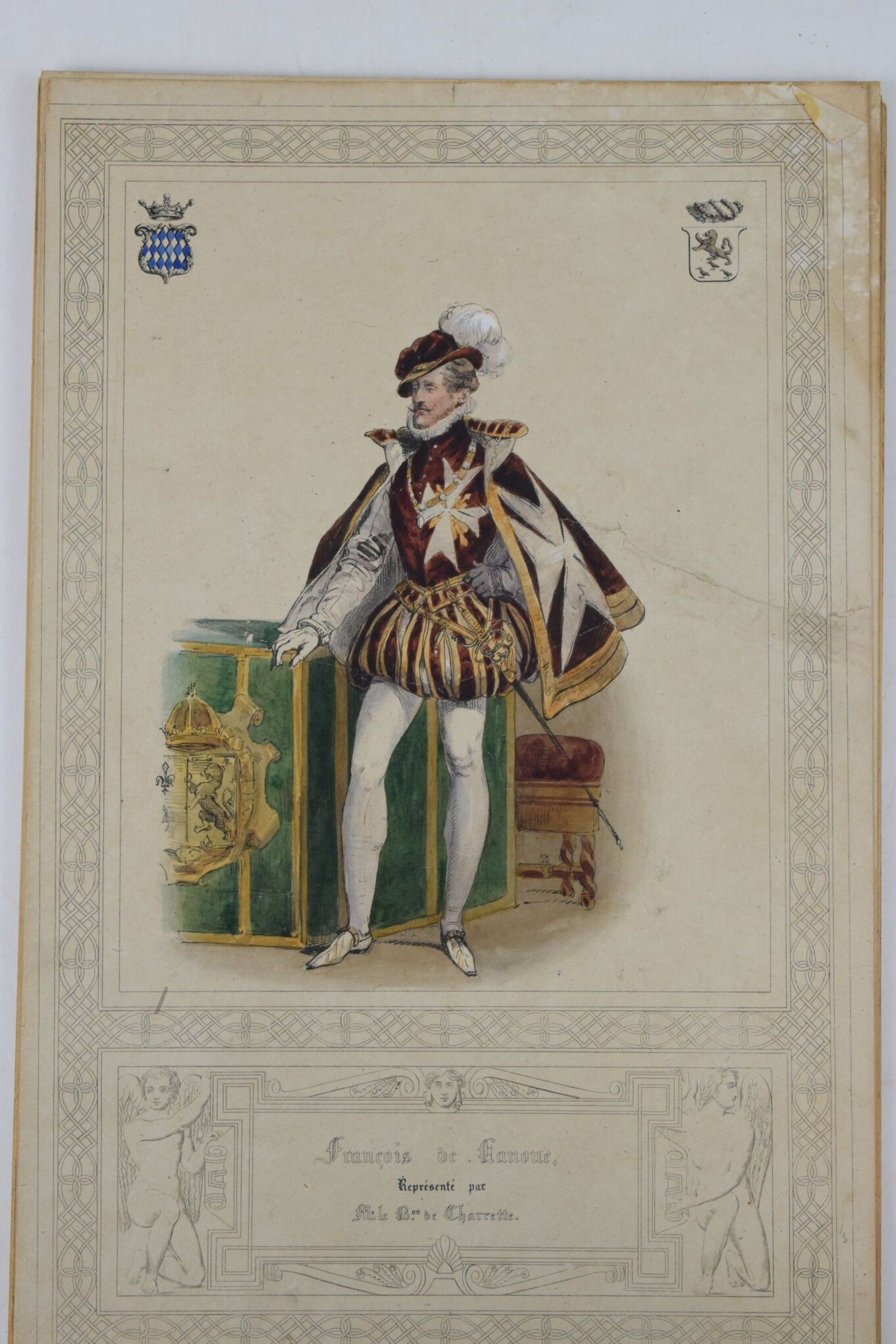 LAMI, Eugène. Quadrille de Marie Stuart. 1929 (Paris), 2 March 1829. In-folio (234 x 341 mm), 22 lithographed and watercoloured plates including a title and 21 portraits on Chine. On sheets. Based on the watercolours Eugène Lami did at the famous costume ball given by the Duchesse de Berry on the theme of the marriage of Mary Stuart and the Dauphin François II. Only a few copies of this suite, which was not sold, were printed for members of the quadrille. Missing 5 plates (the 4 scenes and 1 portrait), the large frame has been removed, the title leaf dusty, lined on cardboard and the frieze of the frame retouched, one plate torn and reattached, 2 plates with traces. (Colas, I-1747)