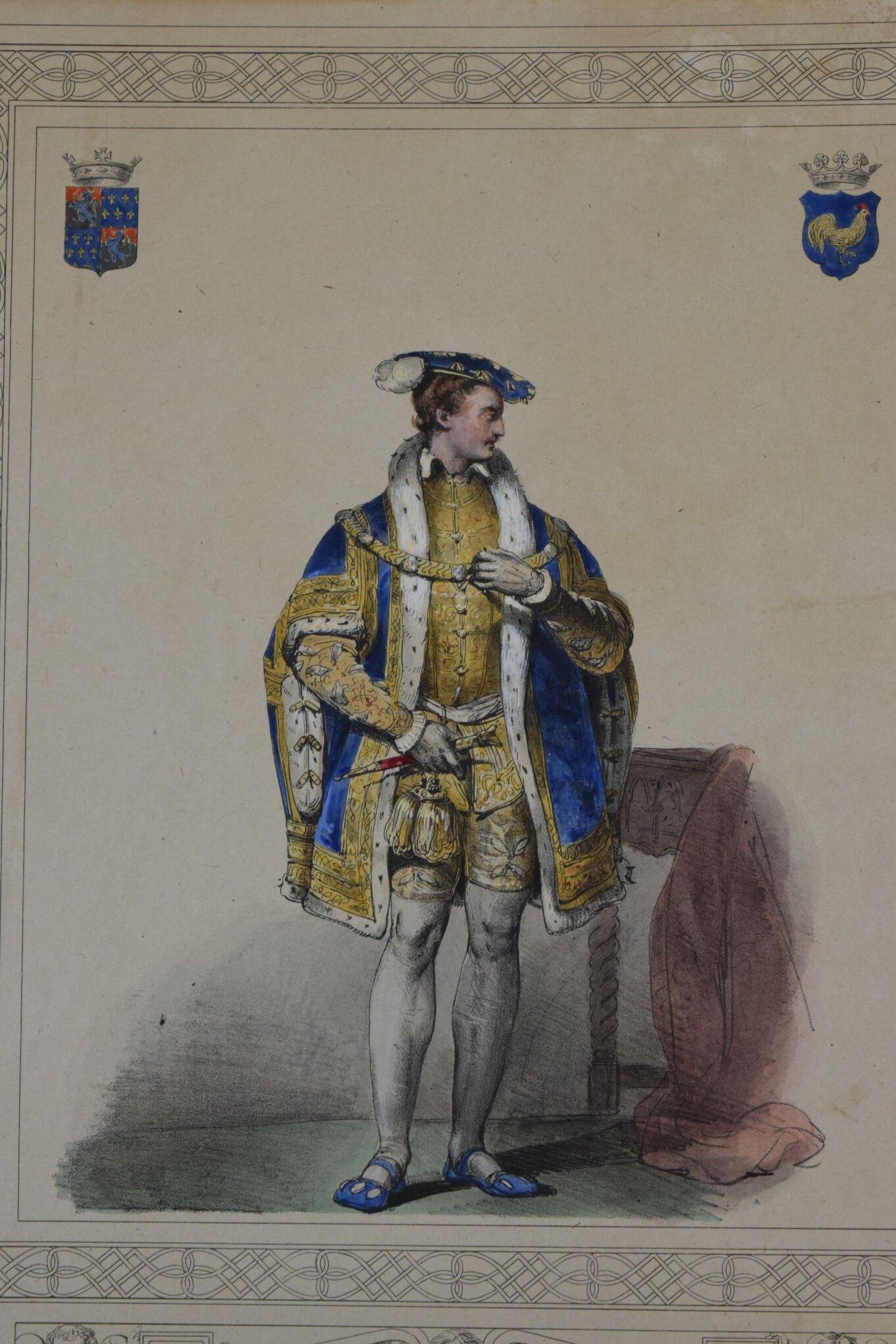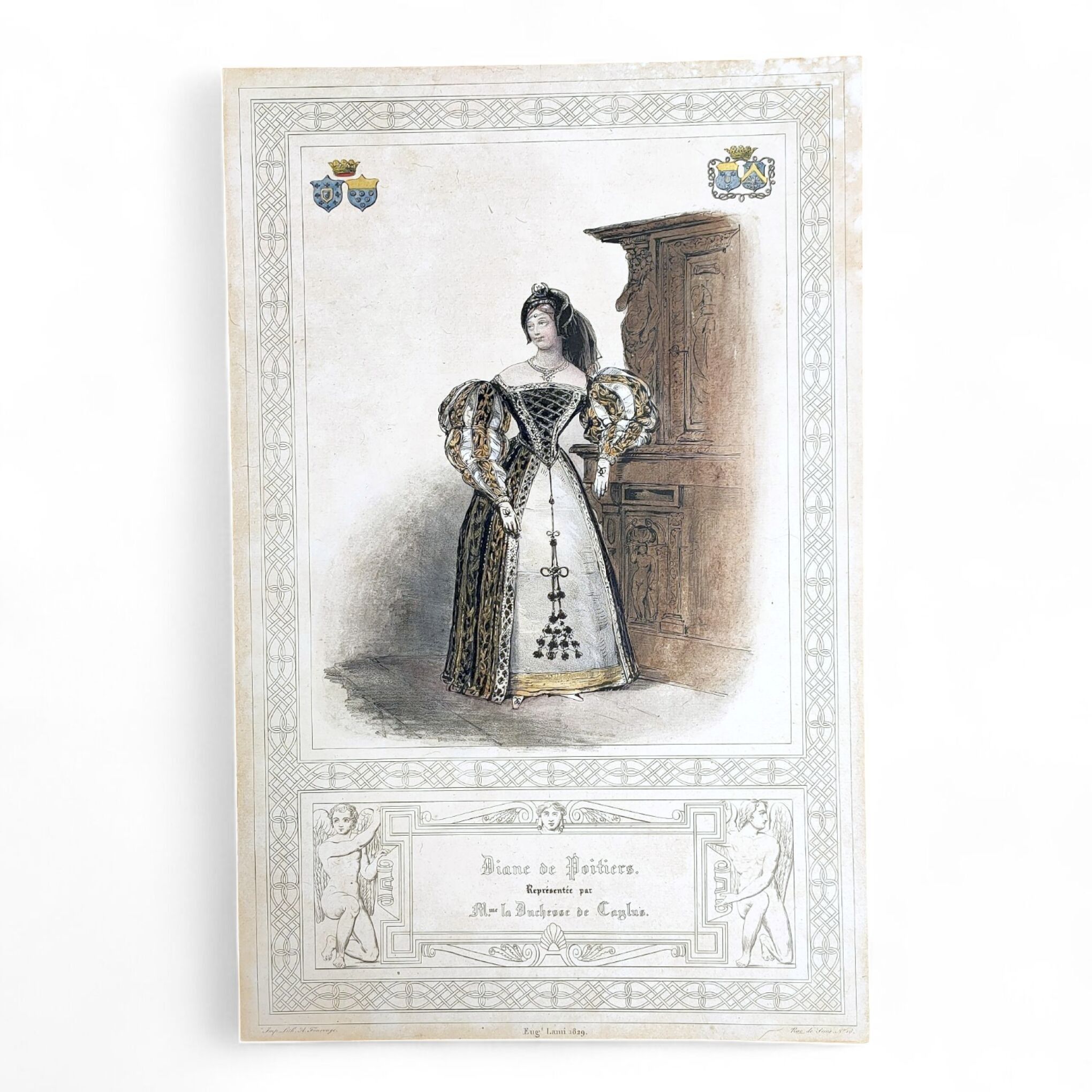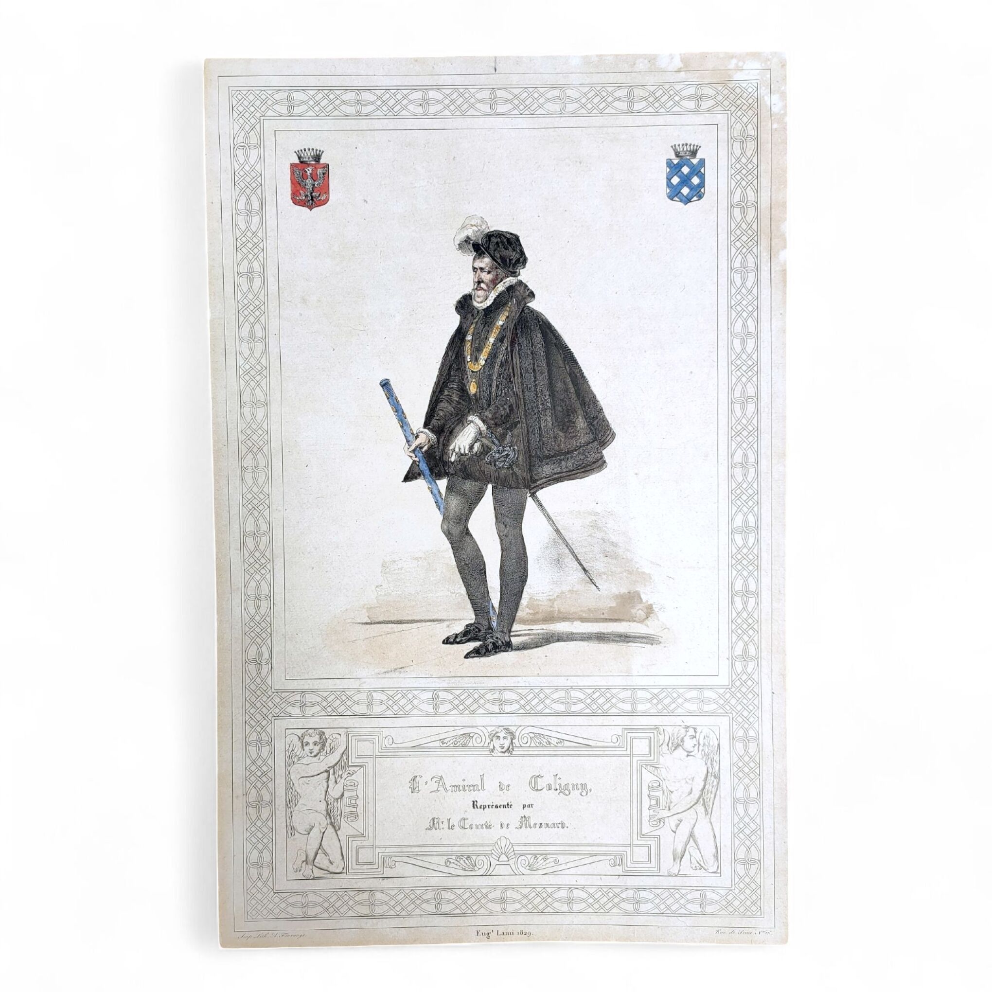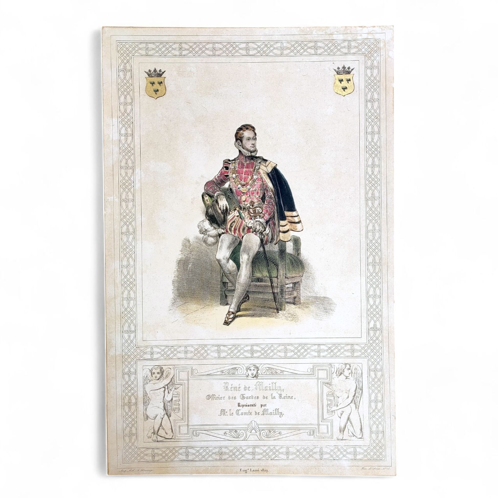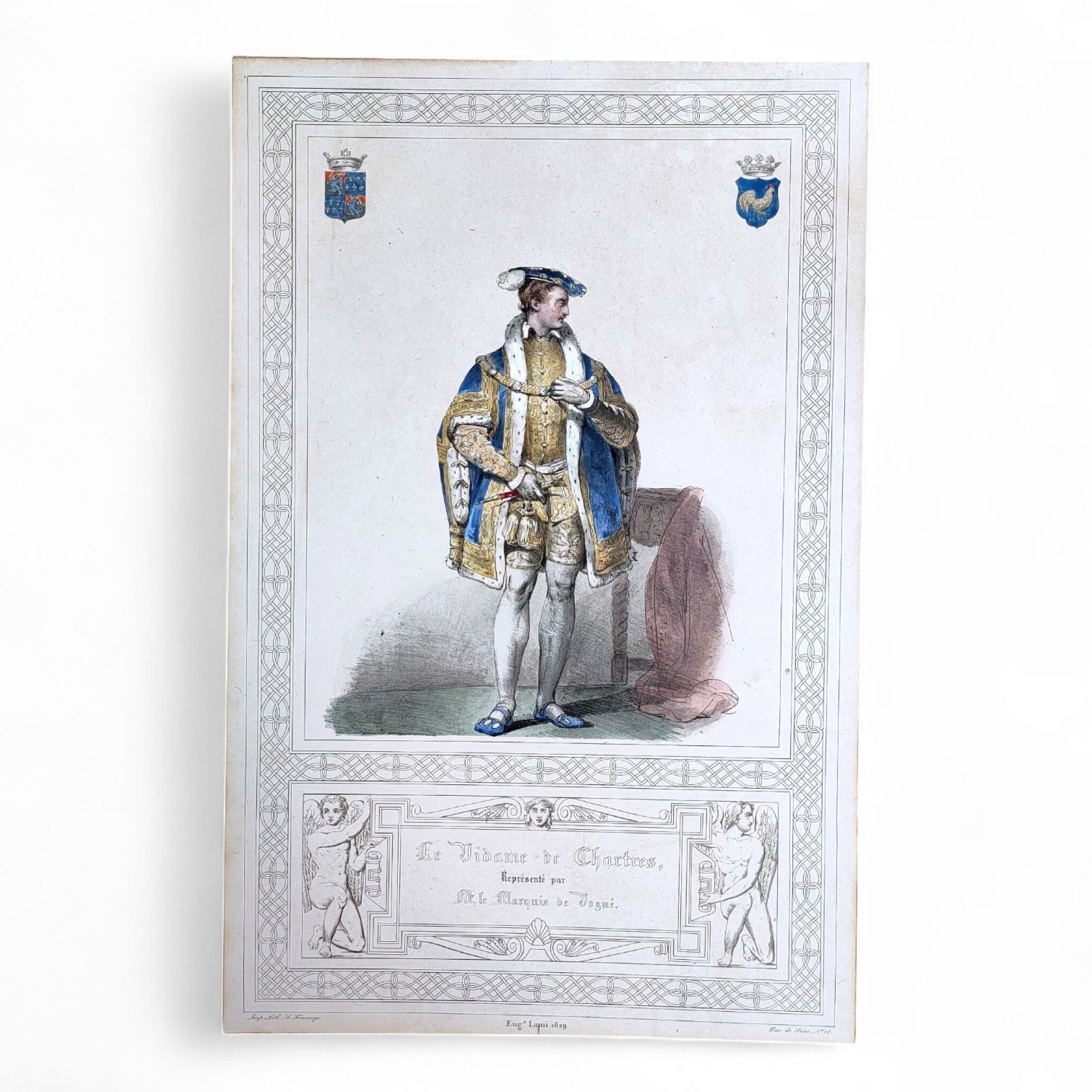 LAMI, Eugène. Quadrille de Marie Stuart. 1929 (Paris), 2 March 1829. In-folio (234 x 341 mm), 22 lithographed and watercoloured plates including a title and 21 portraits on Chine. On sheets. Based on the watercolours Eugène Lami did at the famous costume ball given by the Duchesse de Berry on the theme of the marriage of Mary Stuart and the Dauphin François II. Only a few copies of this suite, which was not sold, were printed for members of the quadrille. Missing 5 plates (the 4 scenes and 1 portrait), the large frame has been removed, the title leaf dusty, lined on cardboard and the frieze of the frame retouched, one plate torn and reattached, 2 plates with traces. (Colas, I-1747)