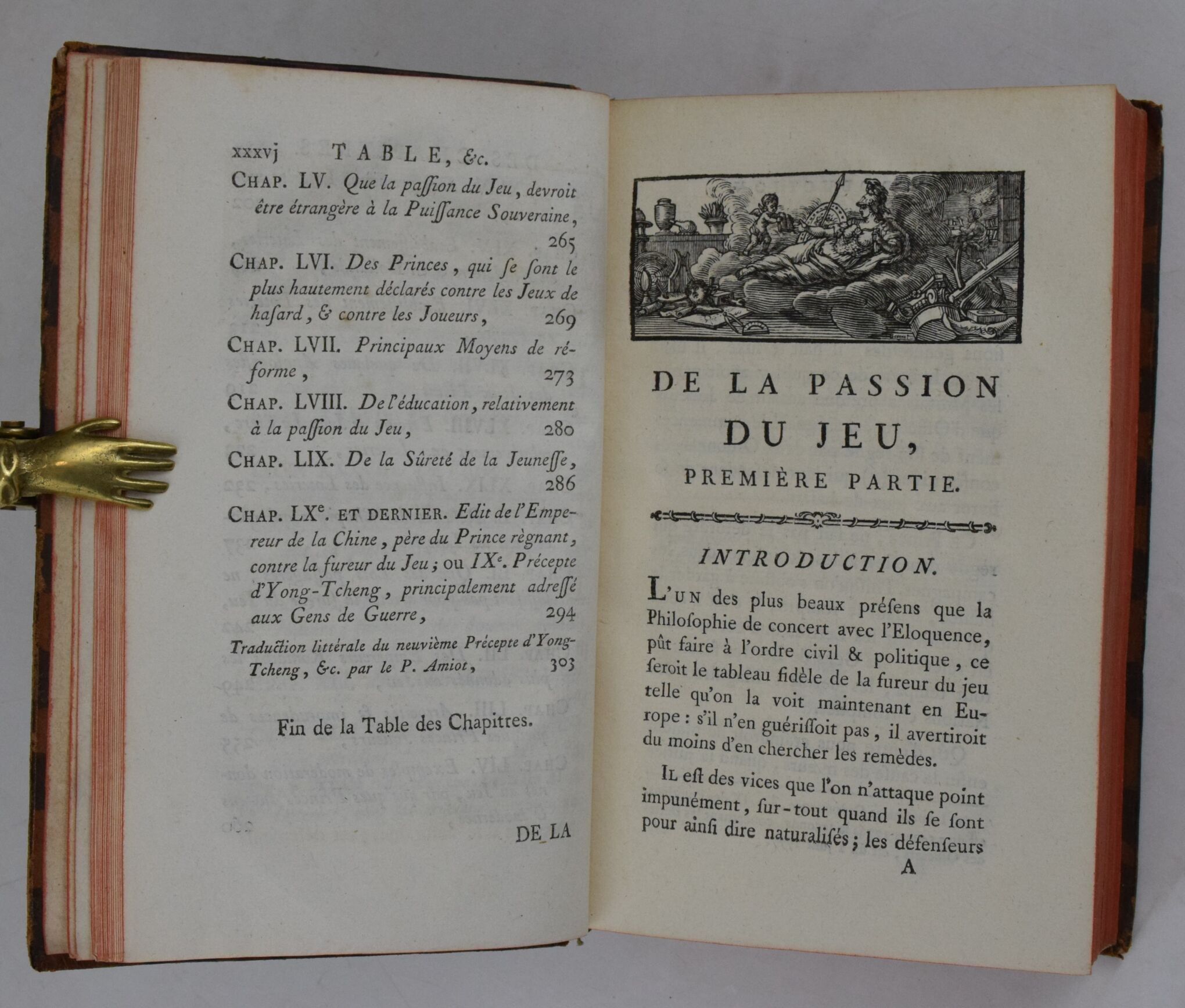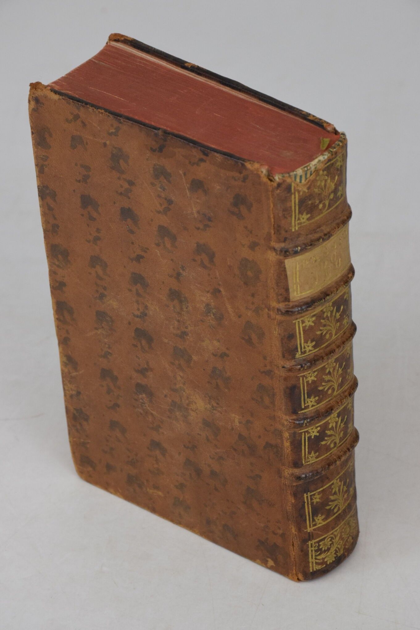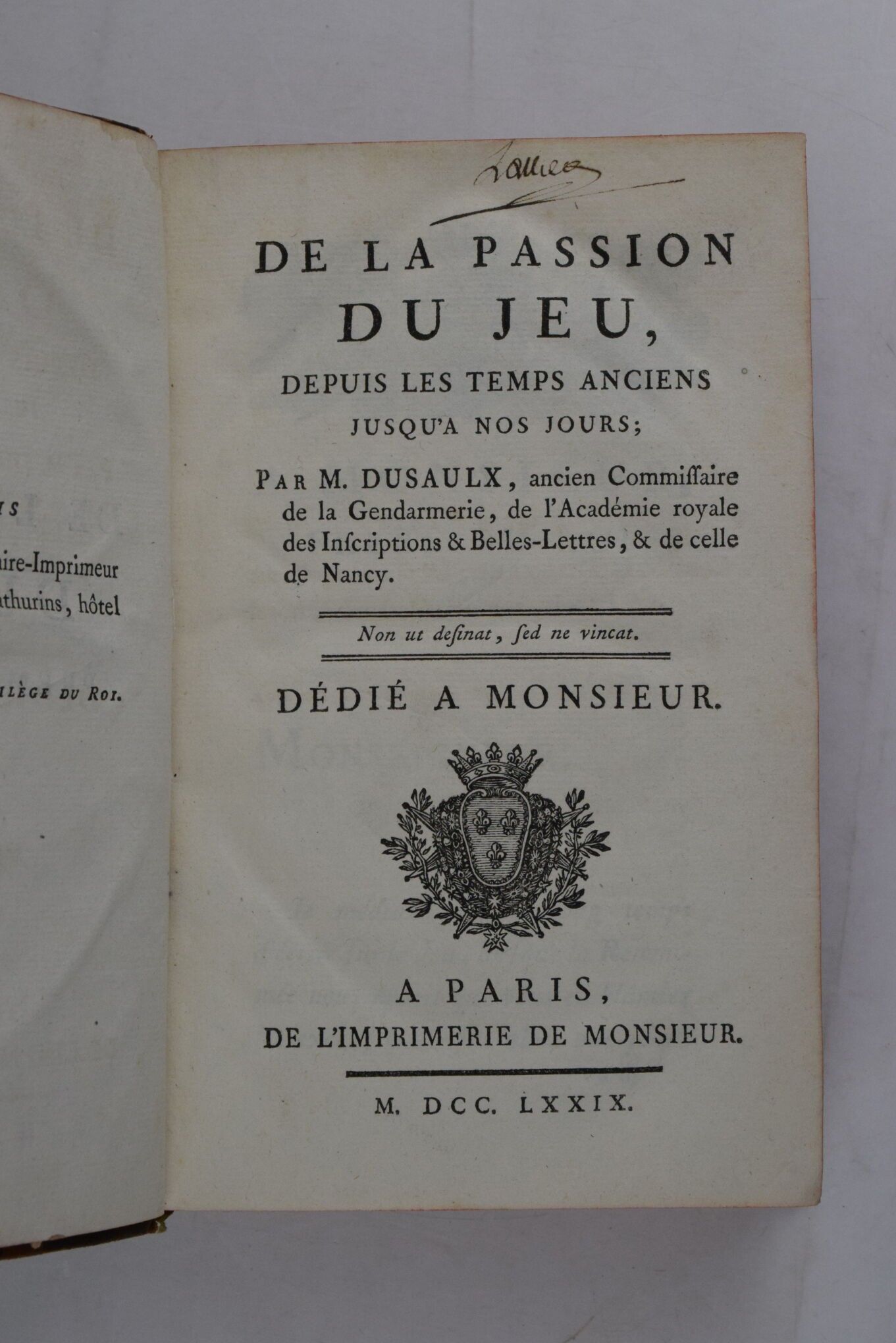 DUSAULX. De la passion du jeu, depuis les temps anciens jusqu'à nos jours. Paris, De l'Imprimerie de Monsieur, 1779. 2 parts in 1 volume in-8, XXXVI-267-(1 bl.) pp. and (4)-335-(1 bl.) pages. Contemporary binding in marbled basane, spine decorated with gilt caissons, red edges, old name in ink on title-page, upper head-cap missing, edges and boards rubbed, beginning of split at lower bindings.