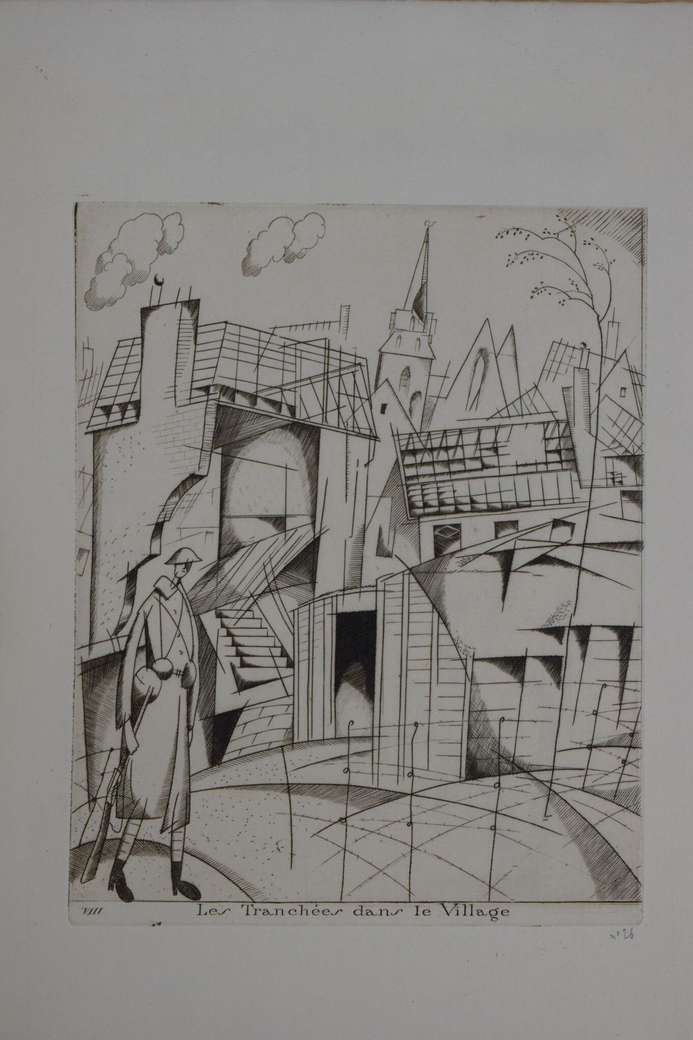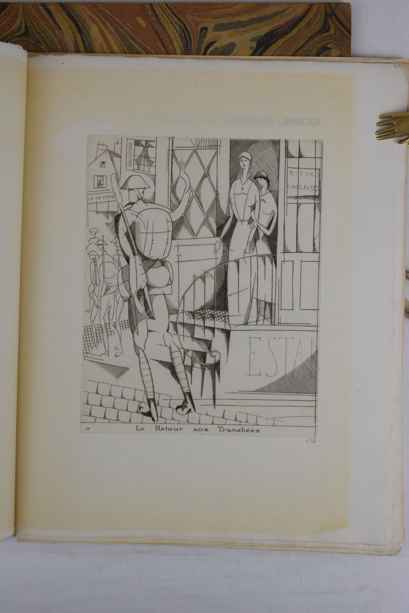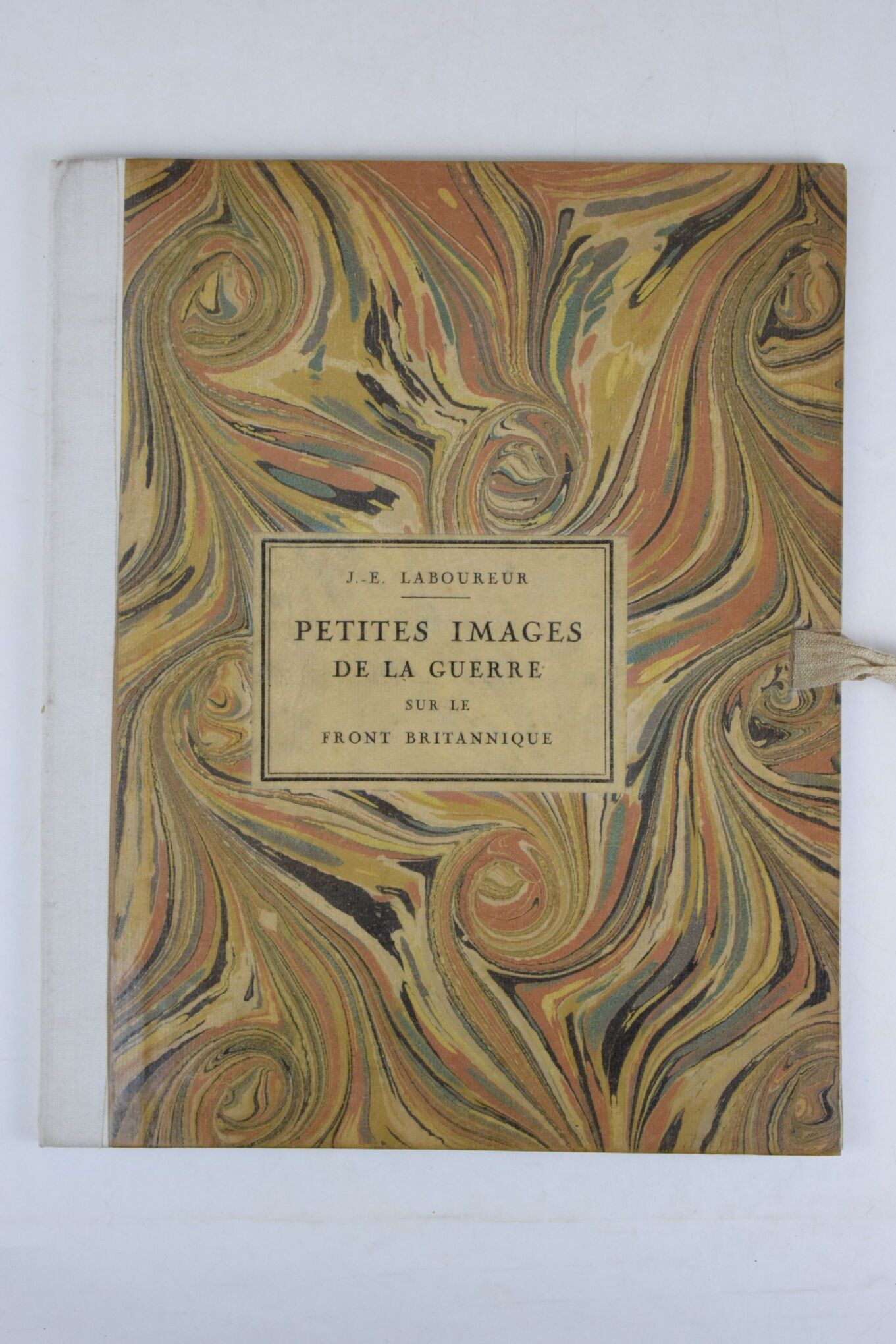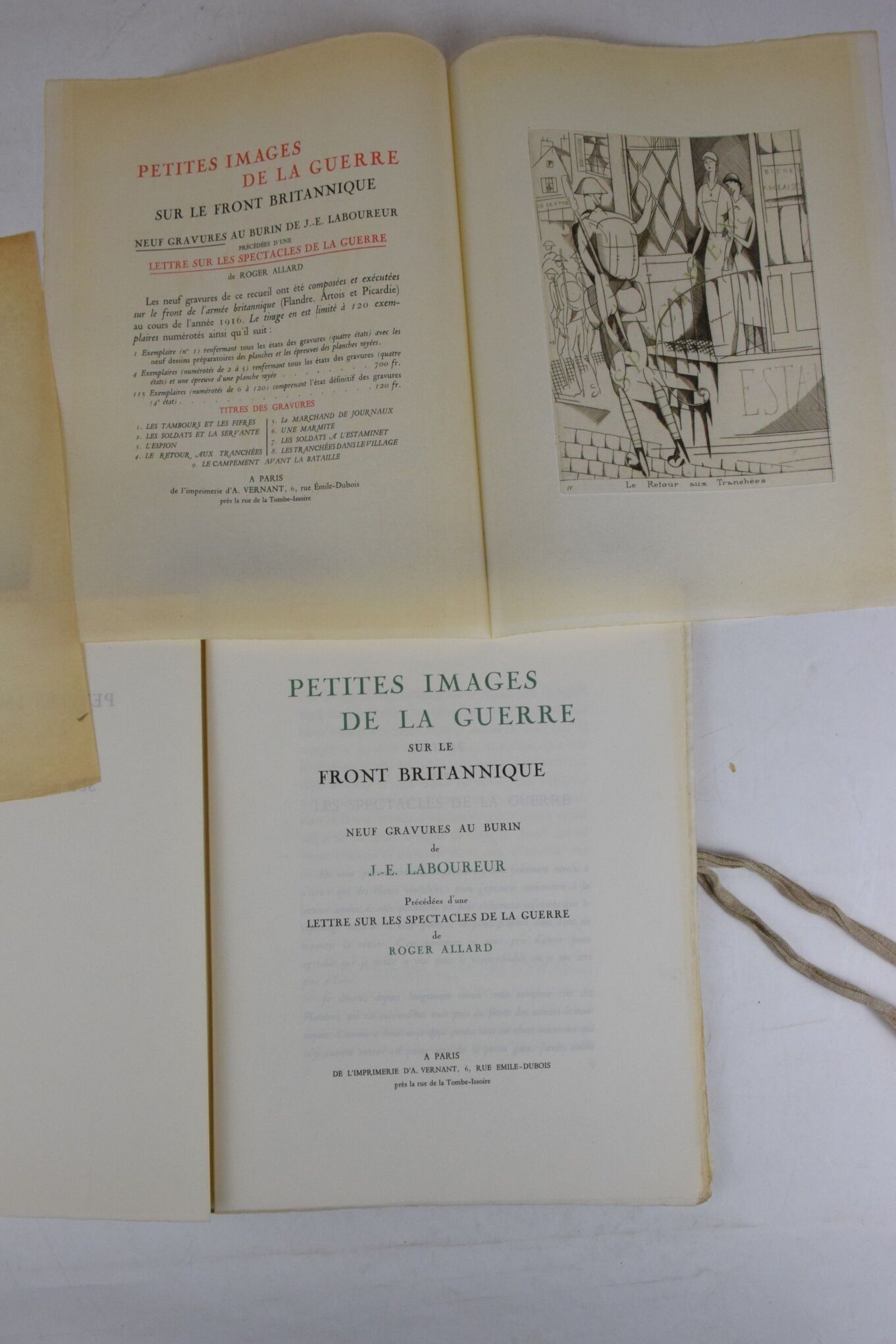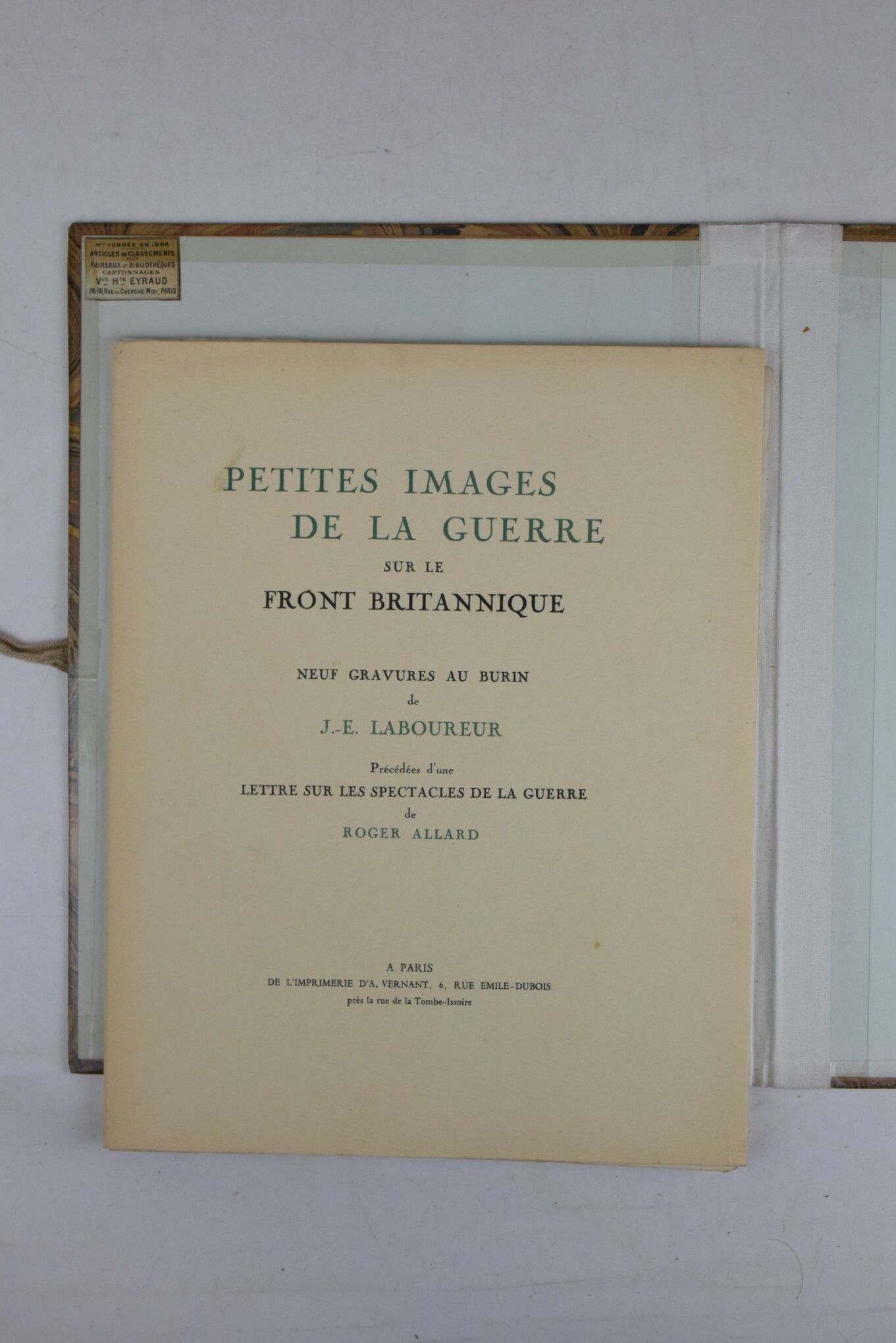 LABOUREUR, J.-E. Petites images de la guerre sur le front britannique. Nine burin engravings. Paris, De l'imprimerie d'A. Vernant, 1917. In-4, (4 bl.)- (2 faux-titre)- xi-(1 bl.) pp. 9 etchings printed on double page - (10 table, justificatif, bl.) pp. complete with double illustrated subscription leaf of pl. IV, printed cover, in publisher's laced hardback folder. Fourth state of the proofs printed at 135 copies numbered and signed by Laboureur. Copy as described in the Catalogue complet de l'oeuvre de Jean-Émile Laboureur, t. 1, pp. 170-181. Restored dust jacket, the spine has been lined with cloth, the backing paper renewed, the boards laminated, otherwise very good condition.