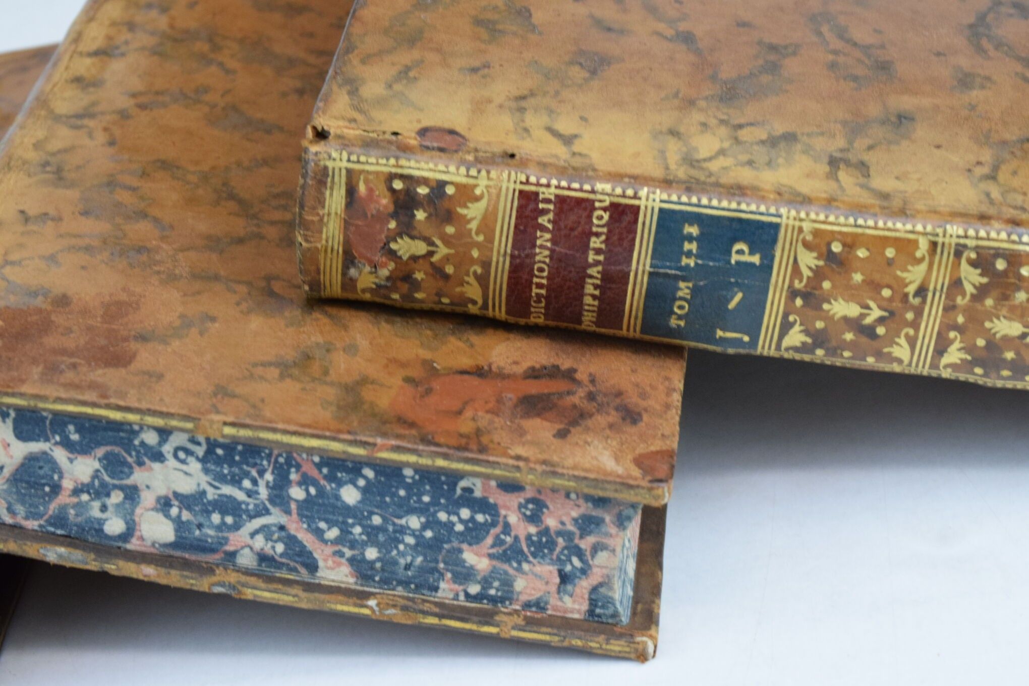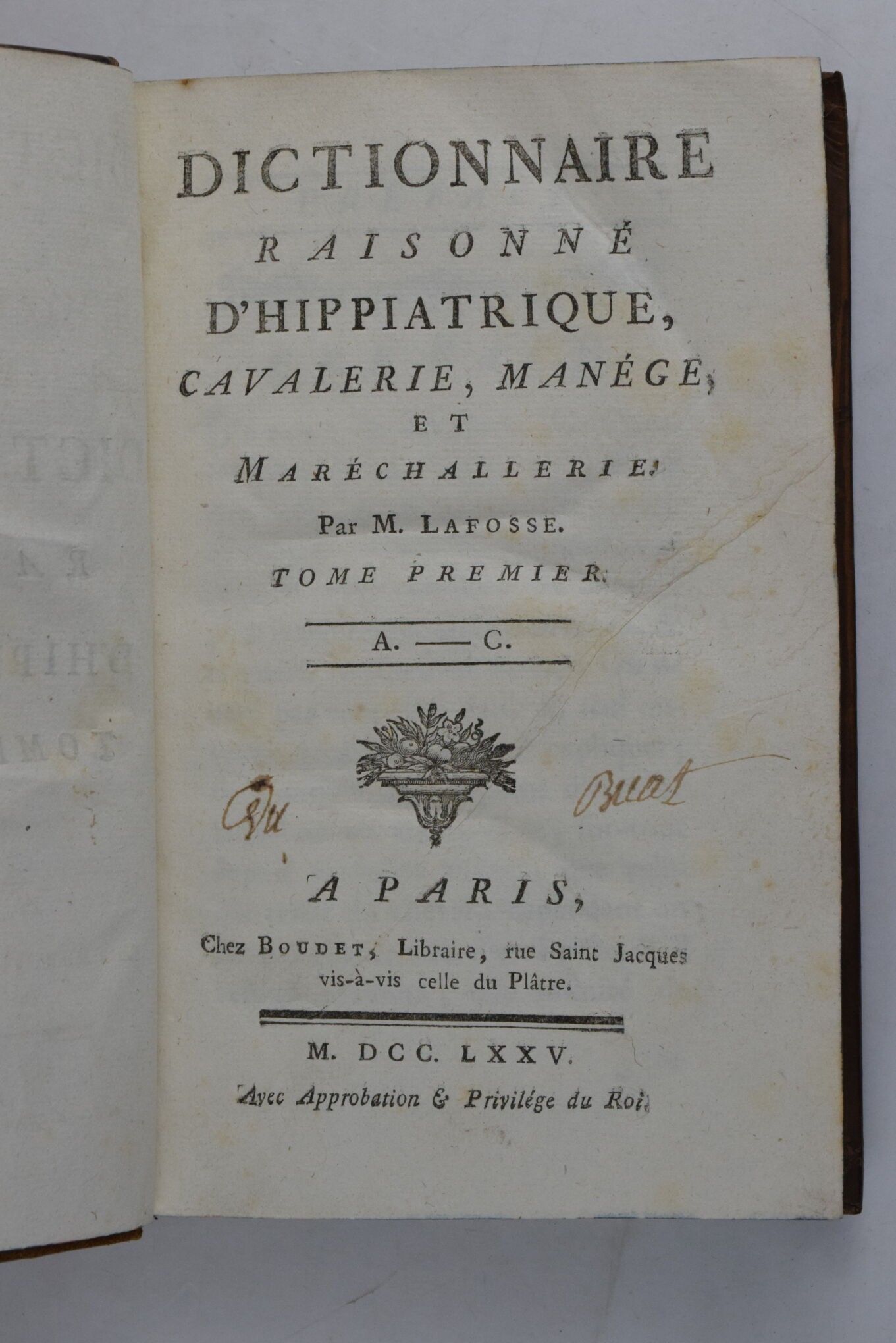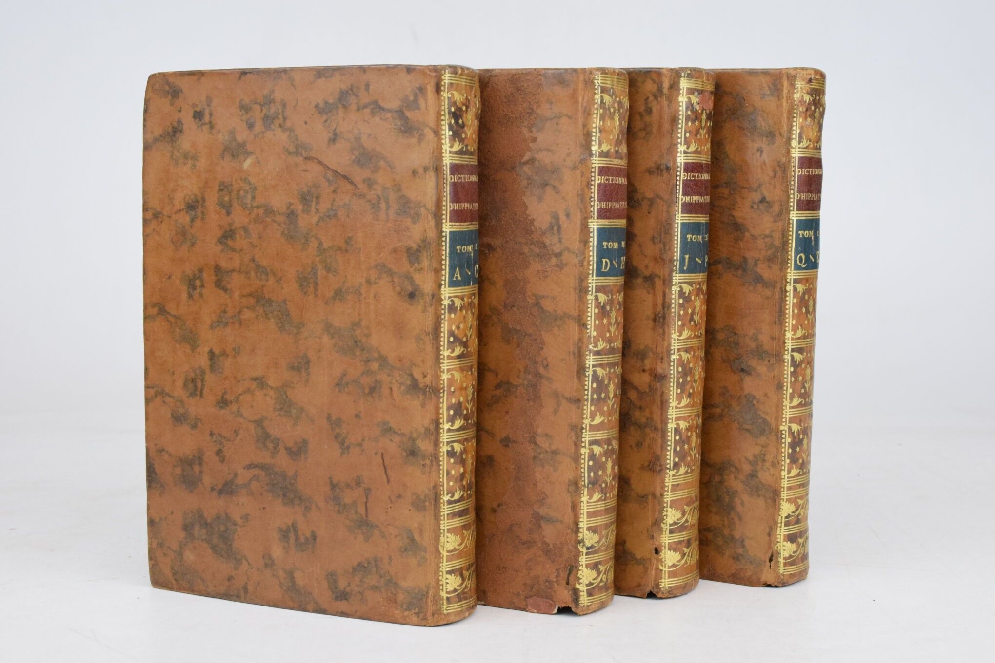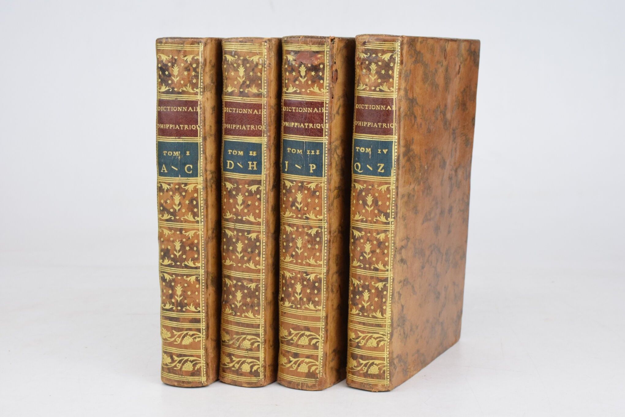 [Equitation] LAFOSSE, (Philippe-Étienne). Dictionnaire raisonné d'hippiatrique, cavalerie, manège et maréchalerie. Paris, Boudet, 1775. 4 volumes in-8, xix-(1)-463 pp. + (4)-445 pp. + (4)-518 pp. + (4)-407 pp. Bound in contemporary marbled calf, smooth spine decorated with gilt caissons, marbled edges, spotting, worm damage to the spines of volumes II, III and IV, handwritten ex-libris on the titles, 1 leaf torn without missing in volume III (p. 87), very good condition inside, handsome set. First edition. (Mennessier de la Lance, II-21).
