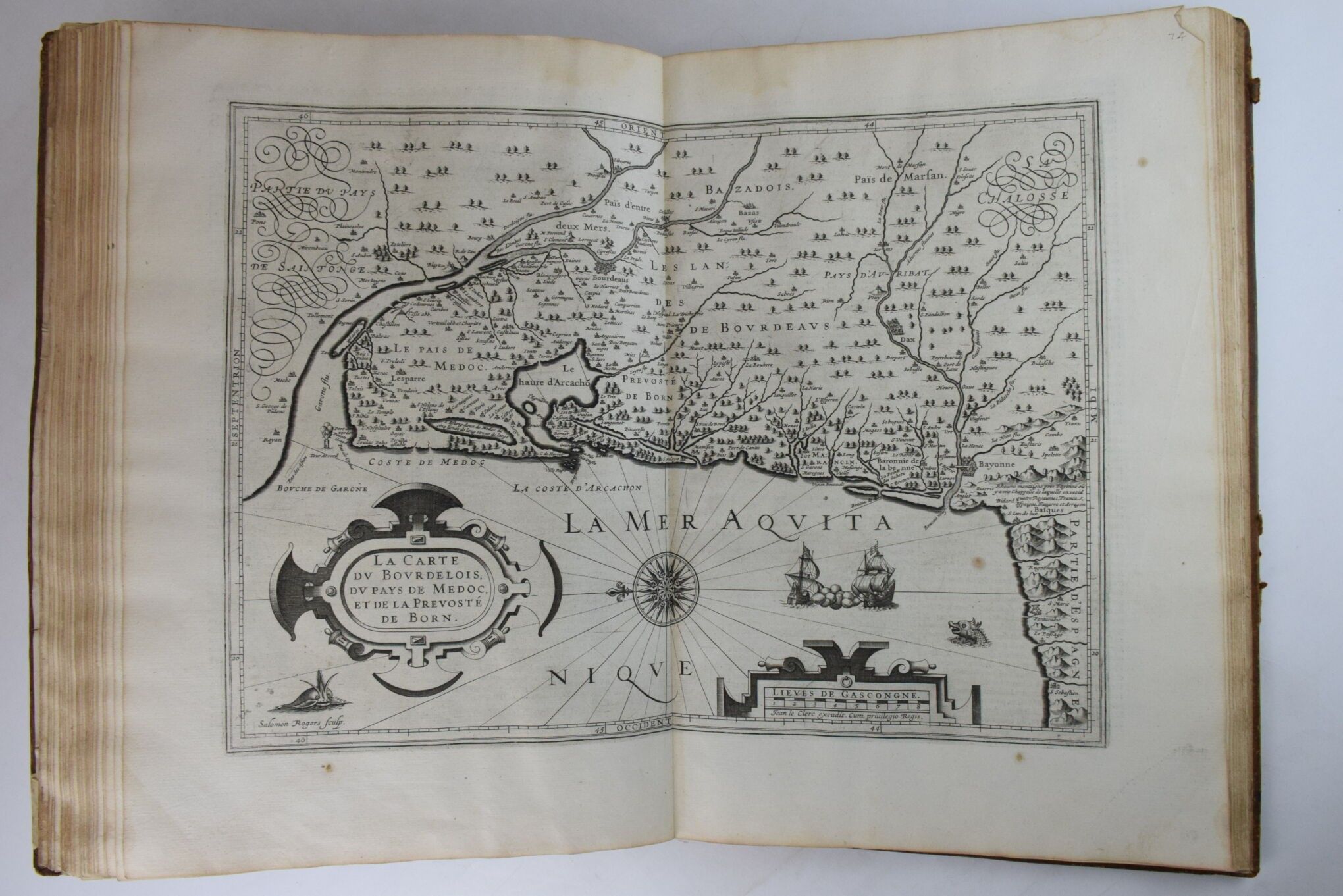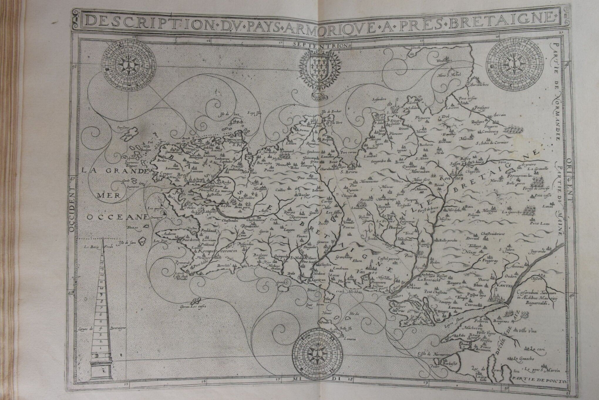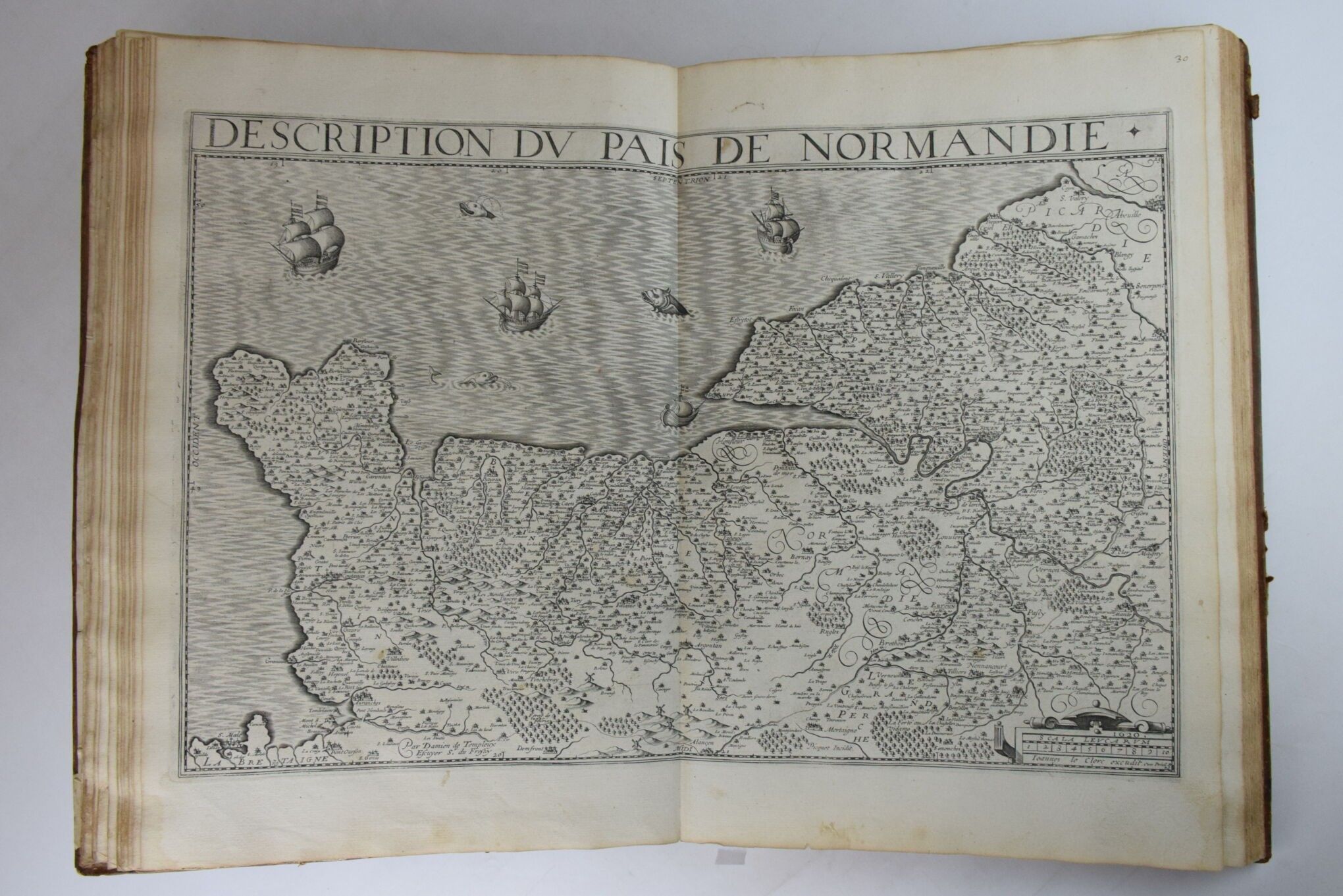[ATLAS] (LECLERC, Jean) Theatre geographique du royaume de France. Contenant les Cartes & Descriptions particulières des Provinces d'iceluy. Paris, Chez la Veuve Jean le Clerc, 1632. In-folio, (11) ff (/13) including 1 engraved frontispiece title by L. Gaultier, 1 printed title, 2 equestrian portraits of kings Henri IV and Louis XIII by Le Clerc and Lasne, 3 in-text engravings illustrating the entry of king Henri IV into Paris in 1594, and 52 maps in 50 sheets (one world map, one map of France and 50 maps of the French provinces on 48 sheets). Bound in contemporary calf, boards framed with a double gilt fillet, the work is entirely mounted on tabs (several of which are split at the foot), binding faded, spine entirely rebound, boards rubbed and stained, leather missing from the corners, traces of moisture on the lower corner. of the first 20 leaves and at the head of about twenty maps, 4 cm tear at the central fold of the map of France and 3 cm tear at the map of Anjou, old annotations in the margin of the text of the map of Provence, table of maps handwritten on the second flyleaf, 2 leaves of text missing: F.[6]: "Sommaire discours de la vie héroïque du roy Henry le Grand" and F.[7]: Table des cartes et privilège. (Ref: M. Pastoureau, Les atlas français XVIe - XVIIe siècles, p. 299).