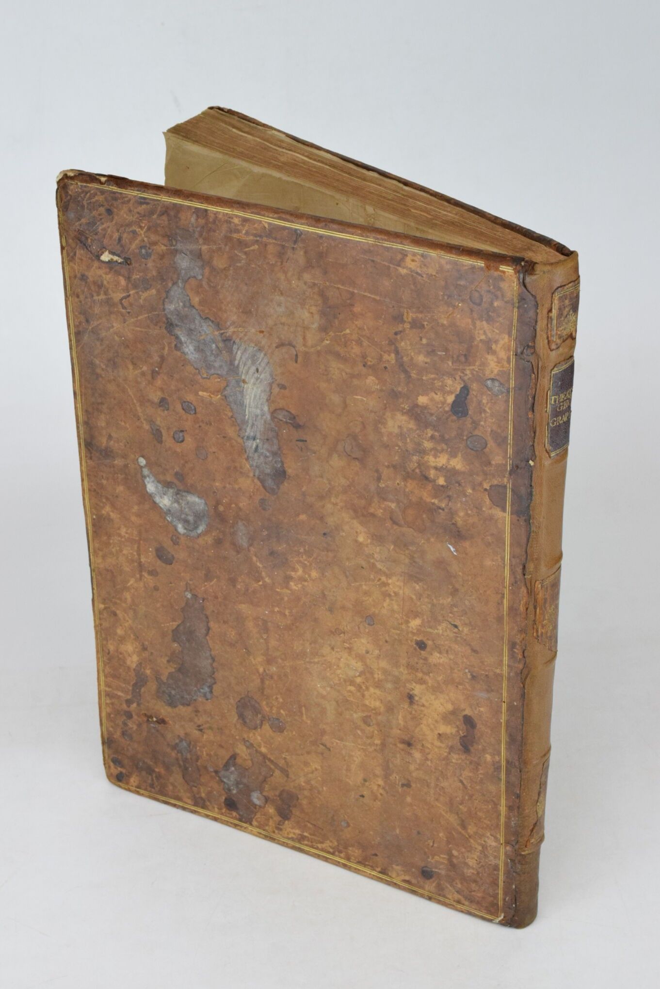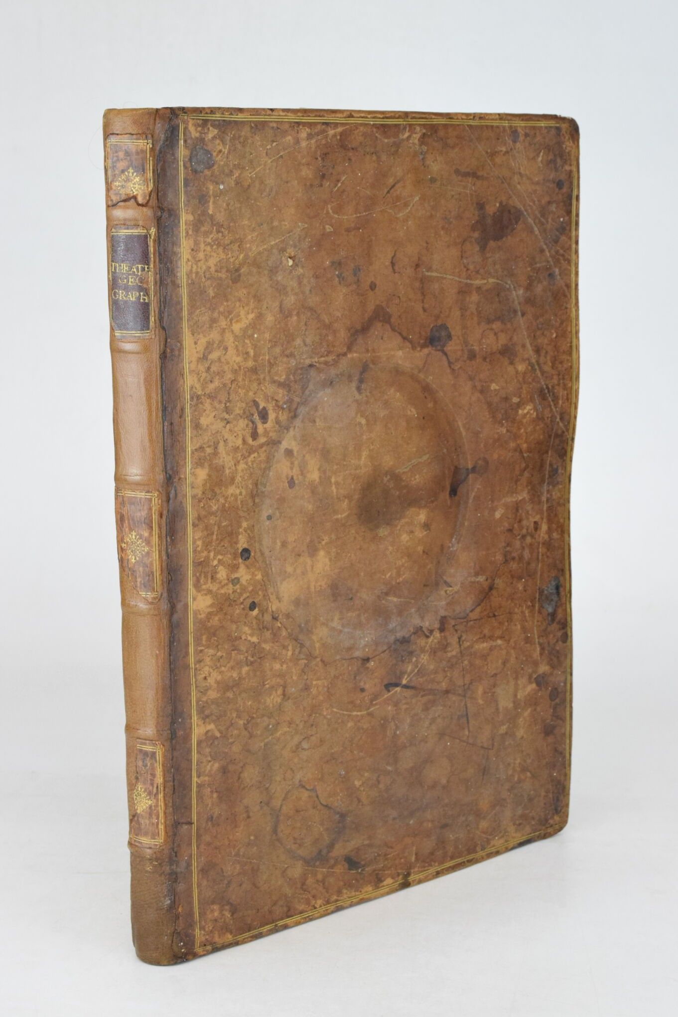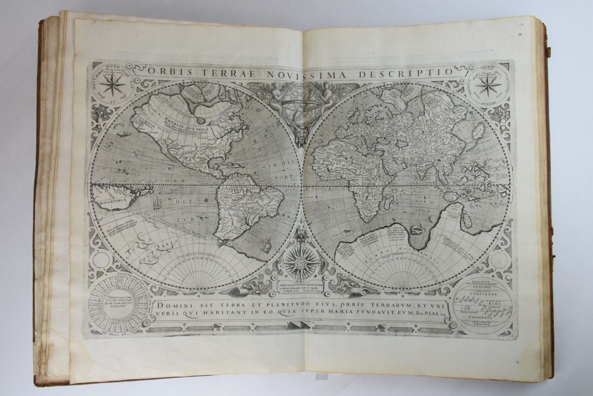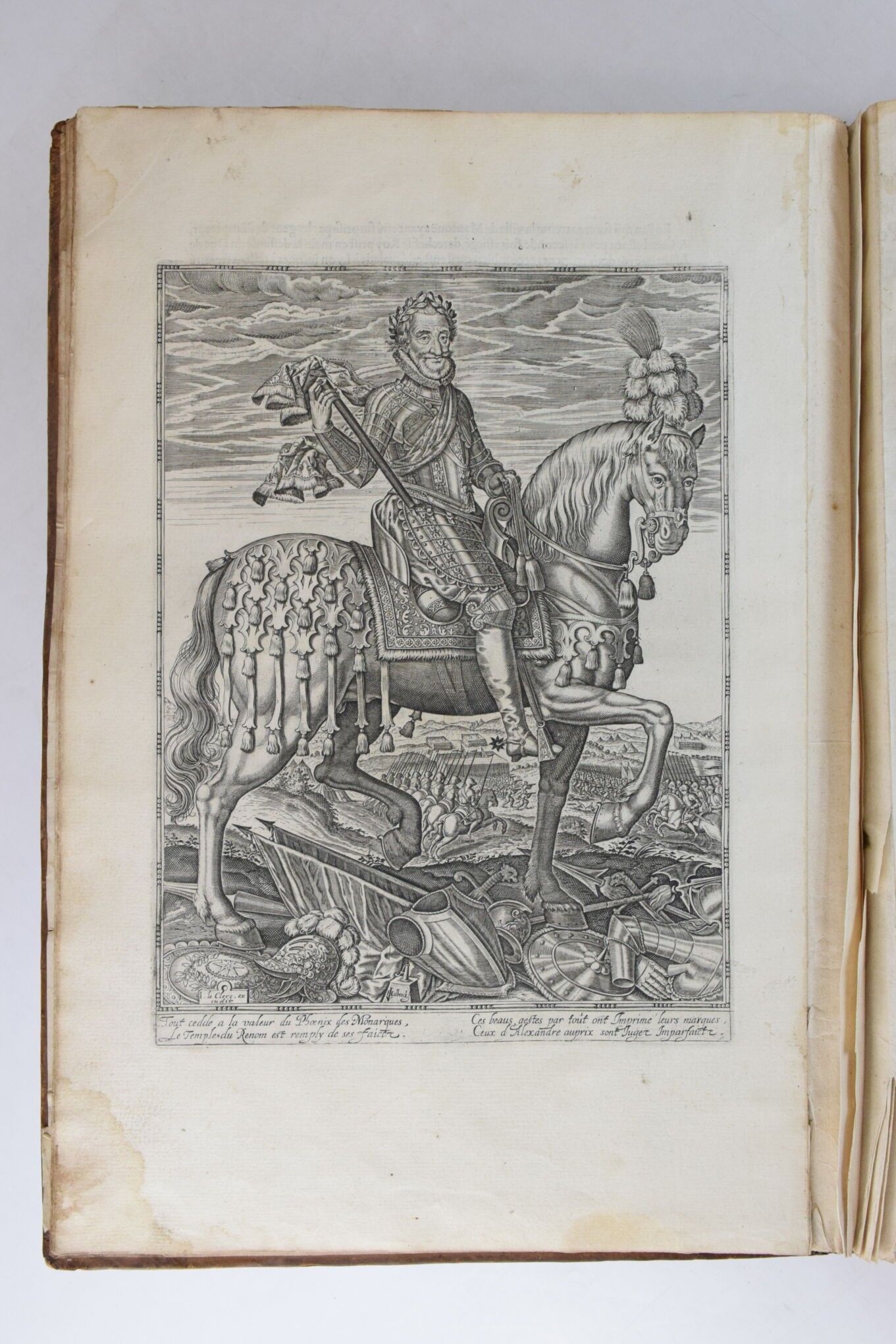 [ATLAS] (LECLERC, Jean) Theatre geographique du royaume de France. Contenant les Cartes & Descriptions particulières des Provinces d'iceluy. Paris, Chez la Veuve Jean le Clerc, 1632. In-folio, (11) ff (/13) including 1 engraved frontispiece title by L. Gaultier, 1 printed title, 2 equestrian portraits of kings Henri IV and Louis XIII by Le Clerc and Lasne, 3 in-text engravings illustrating the entry of king Henri IV into Paris in 1594, and 52 maps in 50 sheets (one world map, one map of France and 50 maps of the French provinces on 48 sheets). Bound in contemporary calf, boards framed with a double gilt fillet, the work is entirely mounted on tabs (several of which are split at the foot), binding faded, spine entirely rebound, boards rubbed and stained, leather missing from the corners, traces of moisture on the lower corner. of the first 20 leaves and at the head of about twenty maps, 4 cm tear at the central fold of the map of France and 3 cm tear at the map of Anjou, old annotations in the margin of the text of the map of Provence, table of maps handwritten on the second flyleaf, 2 leaves of text missing: F.[6]: "Sommaire discours de la vie héroïque du roy Henry le Grand" and F.[7]: Table des cartes et privilège. (Ref: M. Pastoureau, Les atlas français XVIe - XVIIe siècles, p. 299).