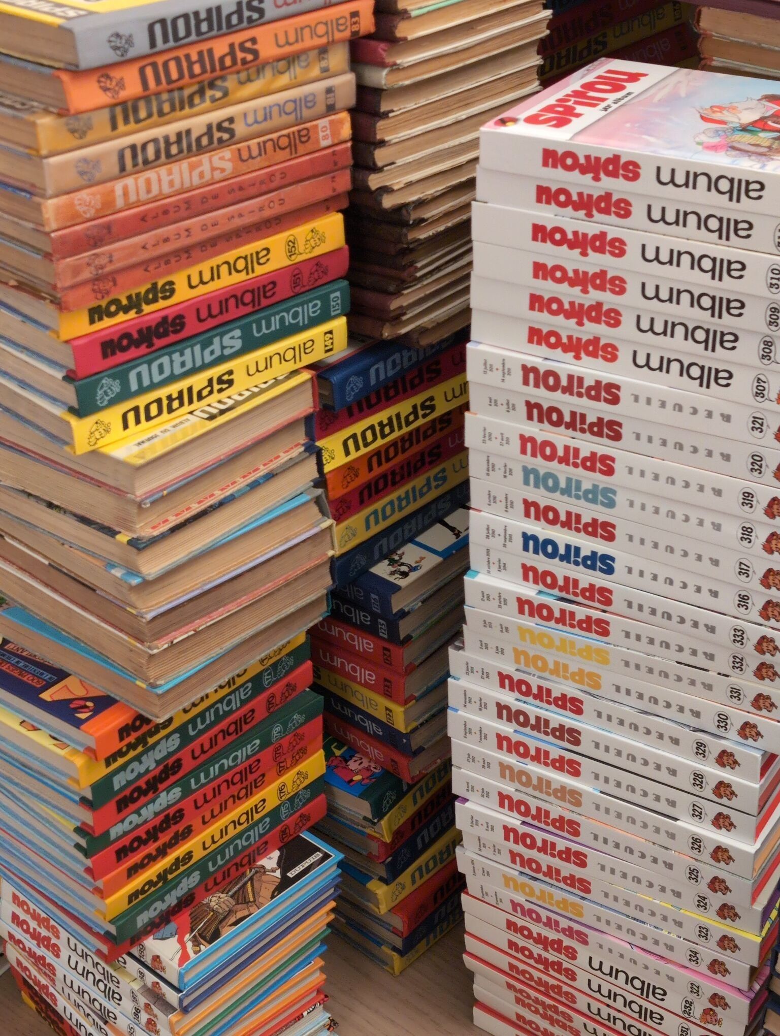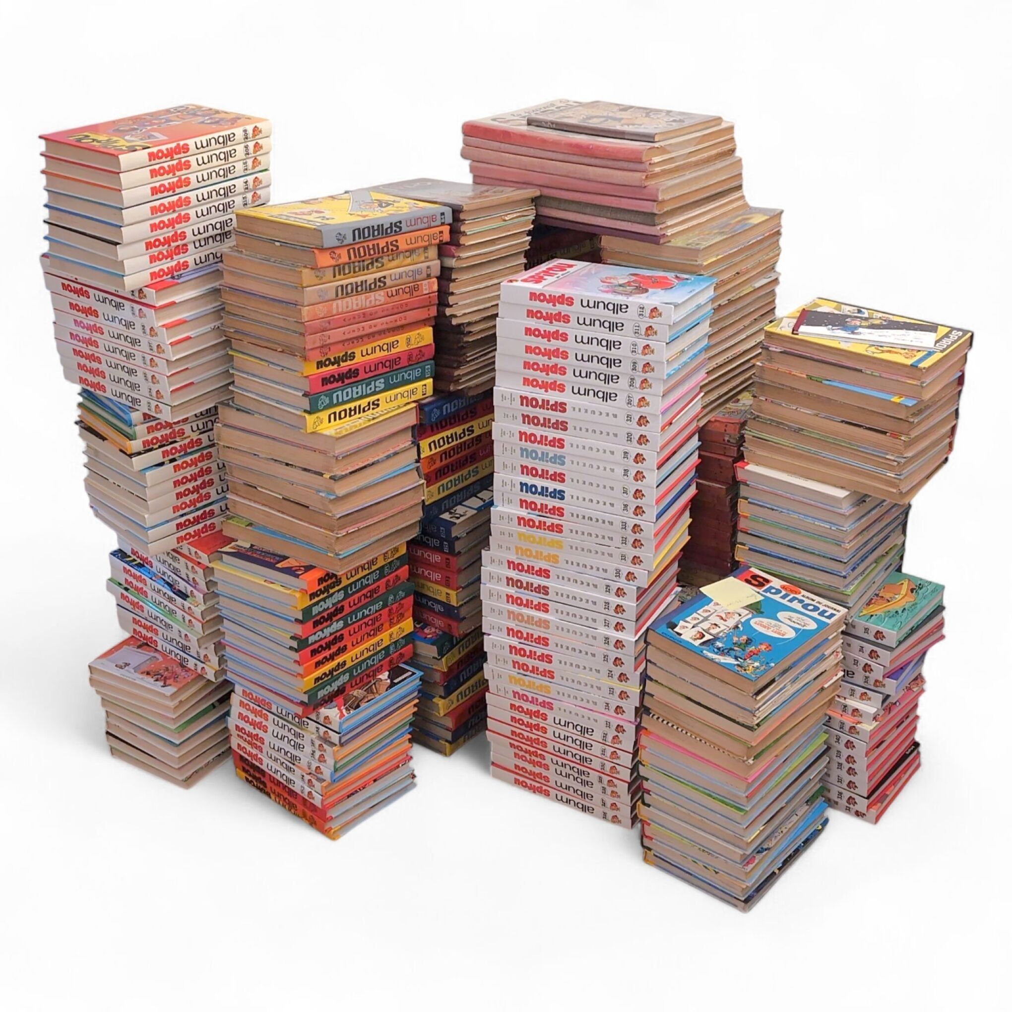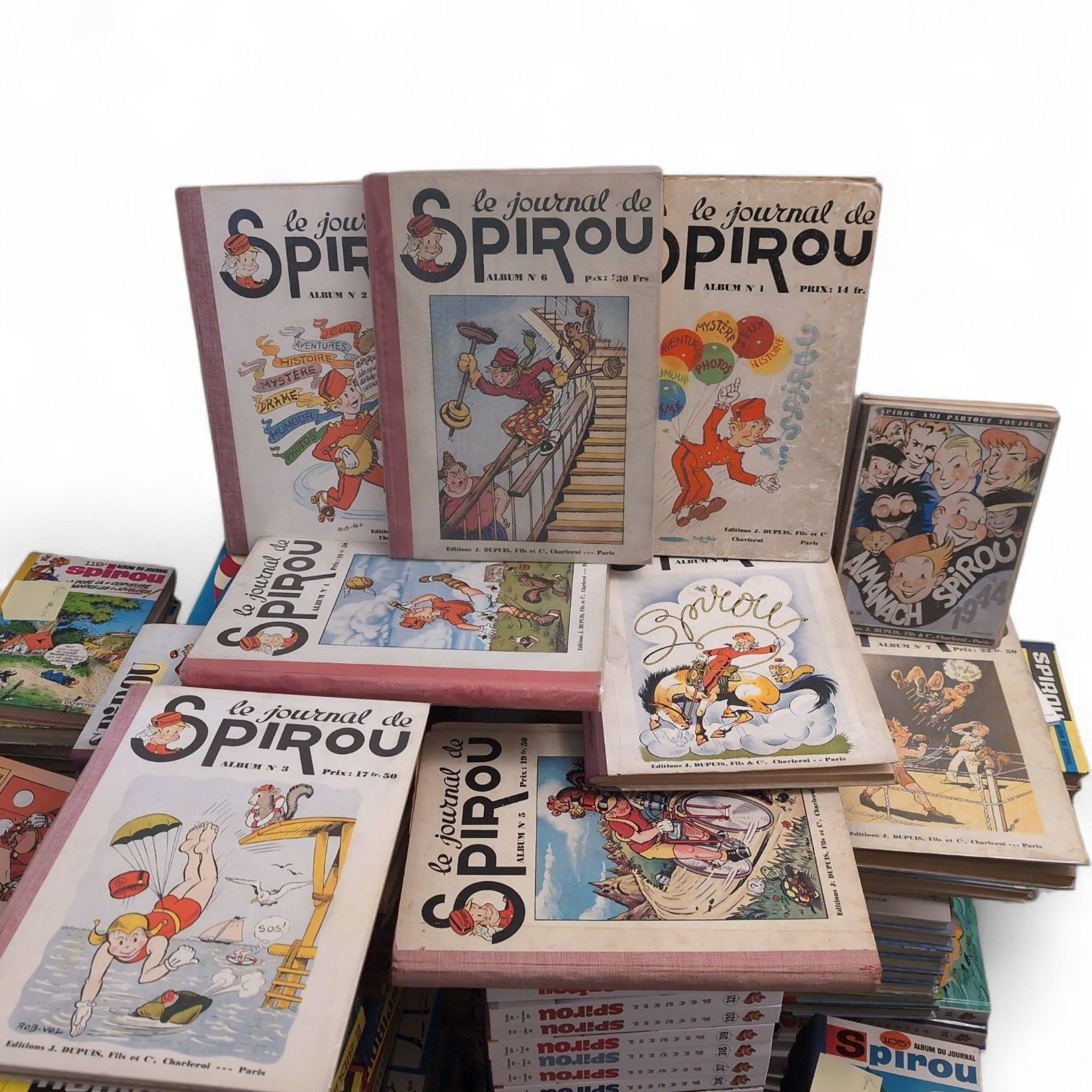 LE JOURNAL DE SPIROU. Important collection of Journal de Spirou albums. From issue no. 1 (1938) to issue no. 340 (2015), enclosed: Almanach Spirou 1944 and 1947. Cover of No. 1 soiled, hinges loose among the first albums, a few damaged spines among albums No. 30 to 70. Most of the albums are in very good condition.