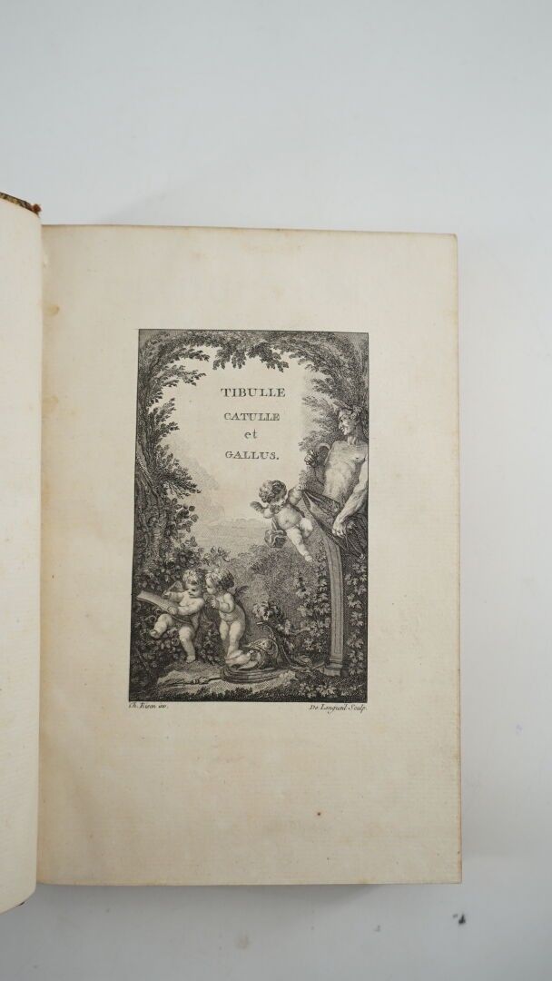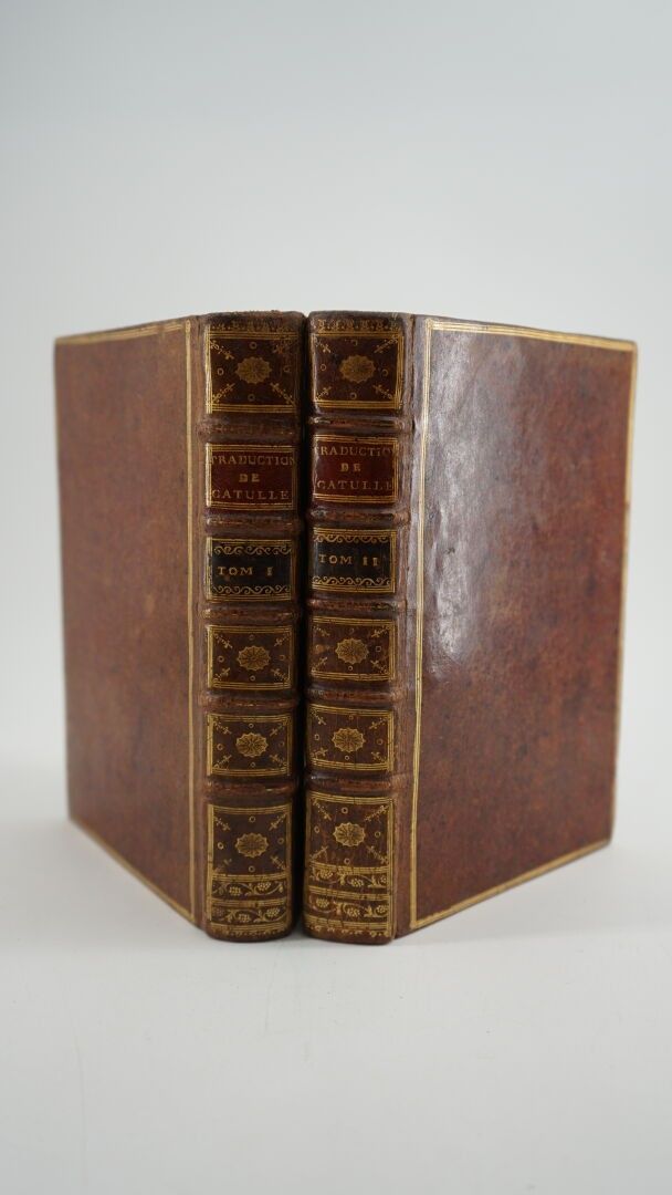 CATULLE - TIBULLE - GALLUS - Traduction en prose des Catulle, Tibulle et Gallus par l'auteur des Soirées Helvétiennes, & des tableaux - Amsterdam ; Delalain, 1771 - 2 volumes In-8° - Title-frontispice engraved by de Longueil after Eisen in the 2 volumes - Contemporary binding in spotted havana calf - Triple fillet and small angular fleurons on the boards - Ornate ribbed spine - Maroon morocco title-pieces, black calf end-pieces - Gilt edges - A very good copy of the first edition of the translation by Masson de Pezay.