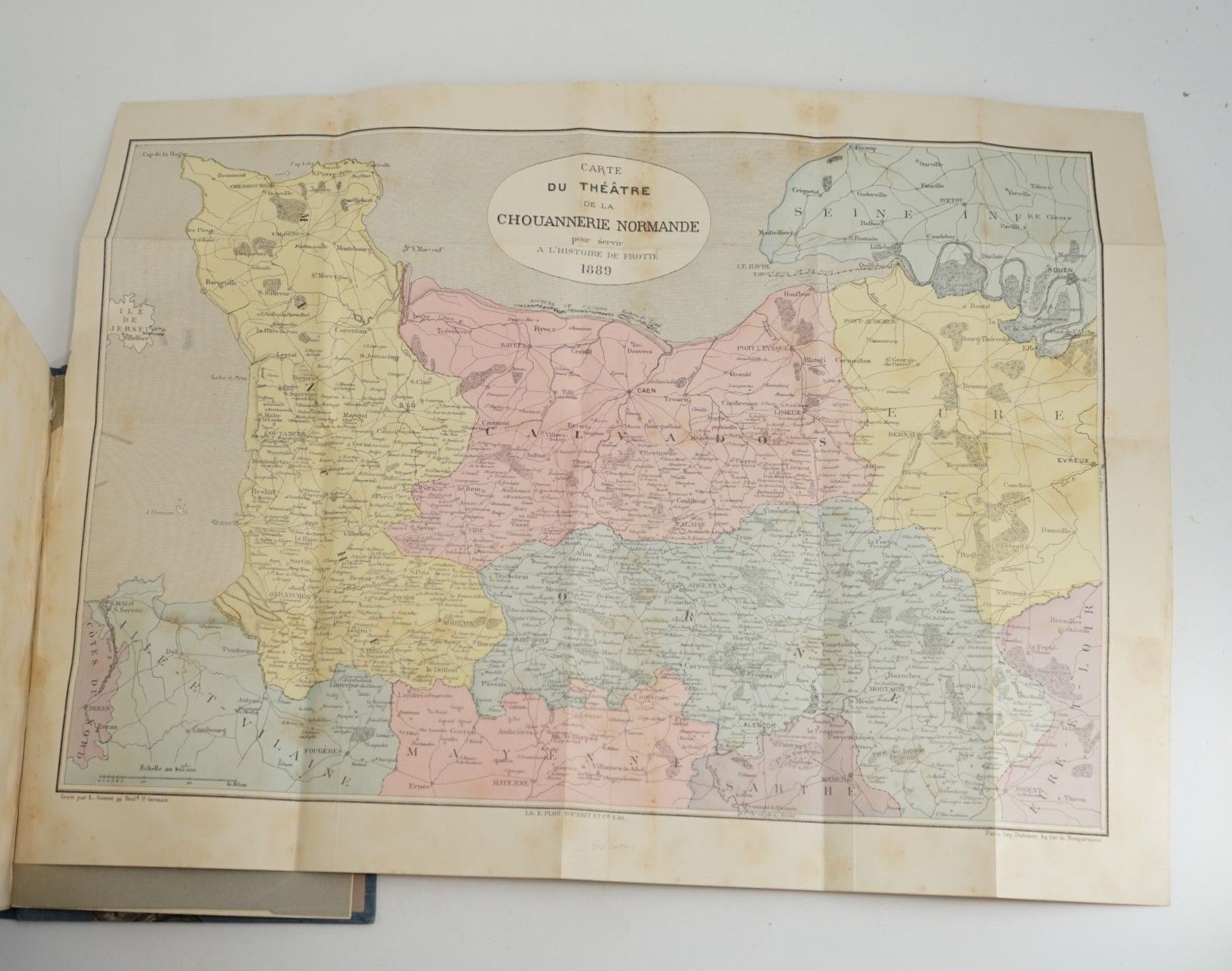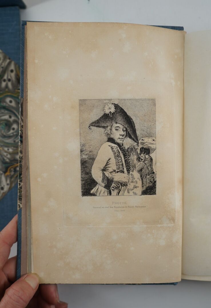 LA SICOTIÈRE (L. de) - Louis de Frotté et les insurrections normandes 1793-1832 - Paris ; E. Plon, Nourrit et Cie, 1889 - 3 volumes In-8° - Some scattered foxing - 2 etched frontispiece portraits (the 1st foxed), 1 folding facsimile and 1 folding map in colour - Bound in period blue half cloth with corners à la Bradel - Spines decorated - Title-pieces in burgundy morocco - Heads speckled with blue - A good first edition copy, complete with the last volume of the table which is often missing.