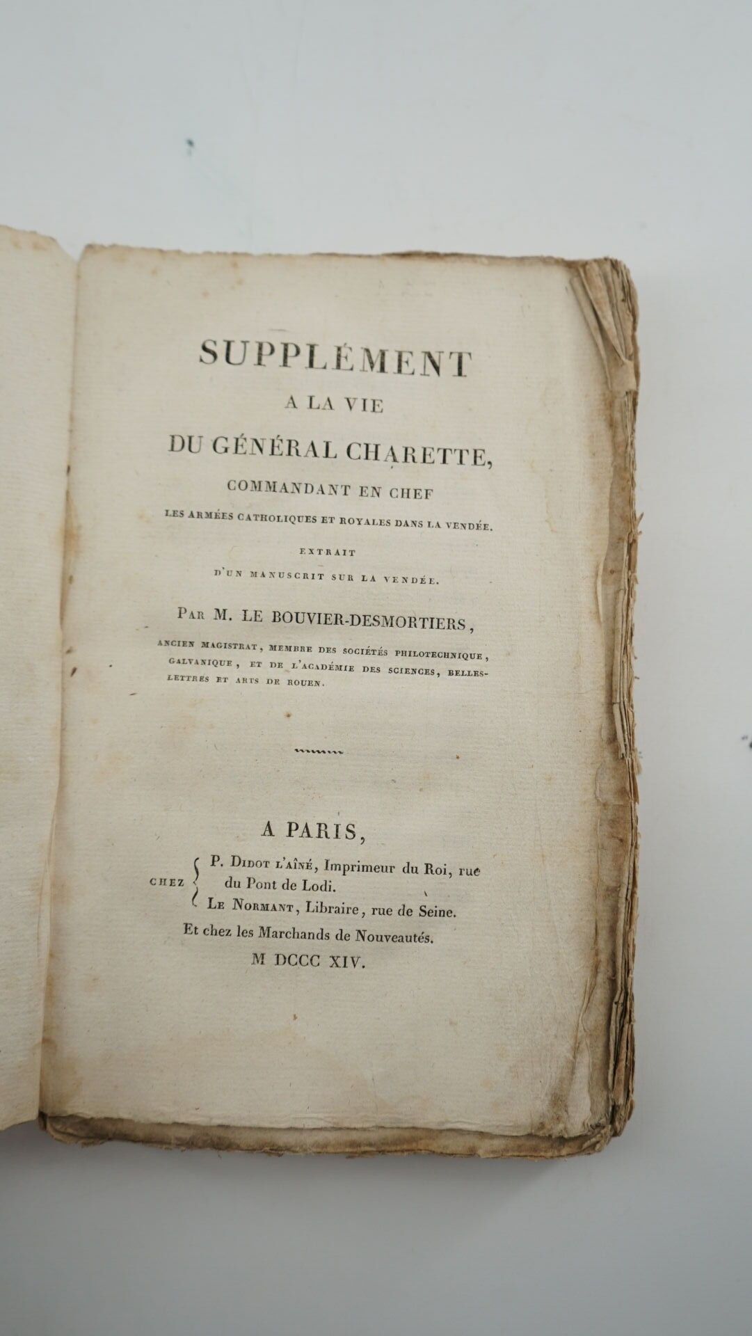 LE BOUVIER-DESMORTIERS - Supplément à la vie du général Charette, commandant en chef les armées catholiques royales sans la Vendée. Extrait d'un manuscrit sur la Vendée - Paris ; P. Didot l'aîné, Le Normant, 1814 - 1 volume In-8° - paperback in a soiled pink paperback cover with small losses at the margins and at the spine - 1 stain on 1 leaf, some pages faded, 1st endpaper and title almost detached - Rare first edition of the supplement published 5 years after Le Vie du Général Charette.