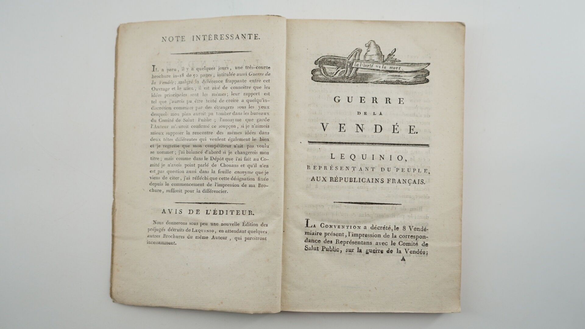 [LEQUINIO [DE KERBLAY (J.-M.)] - Guerre de la Vendée et des Chouans. Ouvrage dans lequel on donne une connoissance complètete de la guerre de la Vendée, [...] - Paris ; Pougin, Petit, Debrai, Maret, premier Brumaire de l'an 3 [1794] - 1 volume In-8° paperback in modern blue paperback - [2] leaves, 250 pages - Some light scattered freckling - A good copy of this rare first edition.
