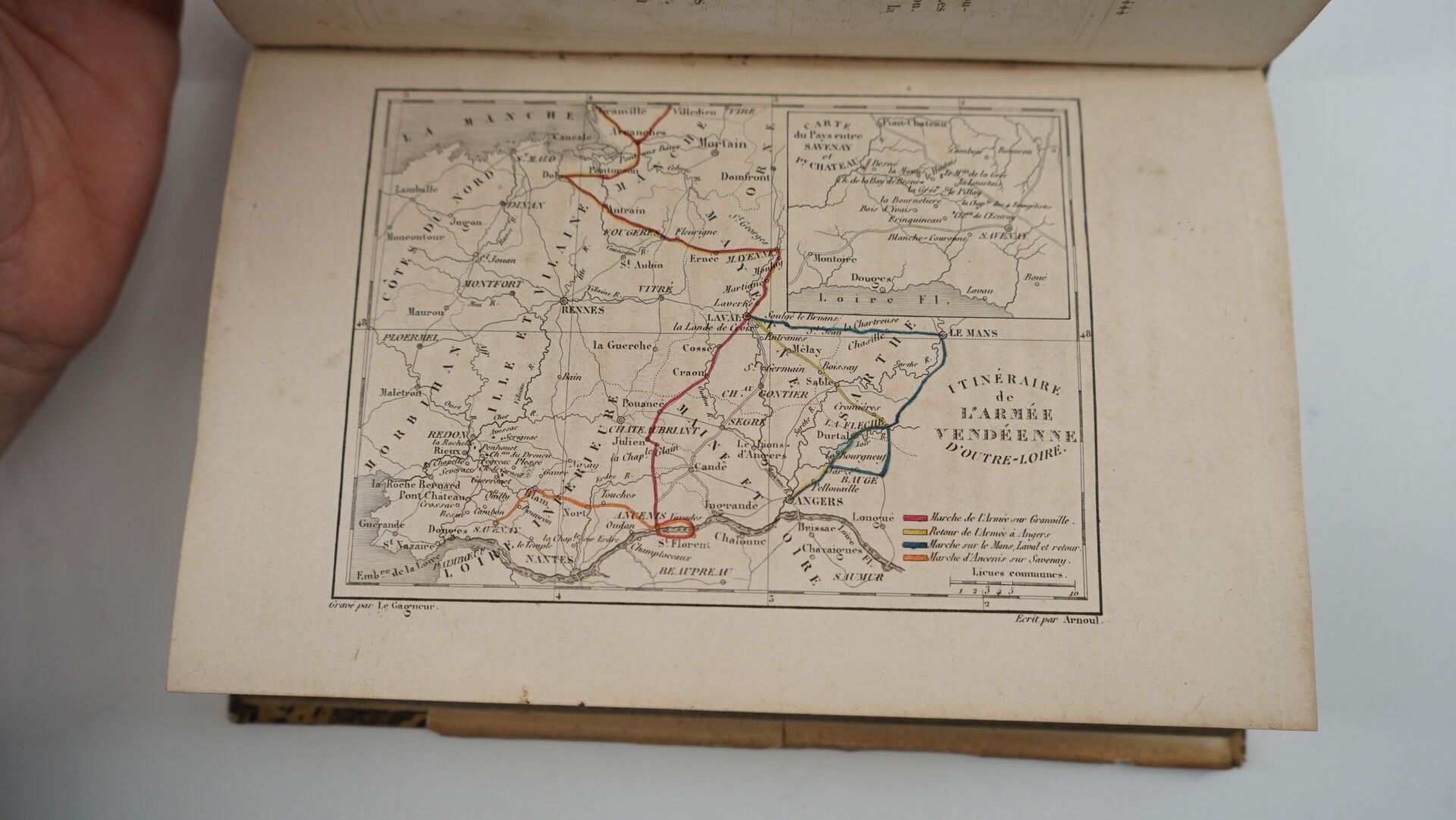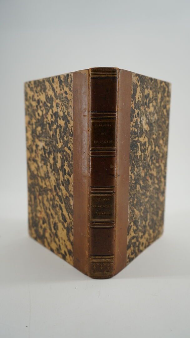 MORTONVAL [pseudonym of Alexandre Furcy Guesdon] - Histoire des guerres de la Vendée depuis 1792 jusqu'en 1796 - Paris ; Ambroise Dupont et Cie, 1828 - 1 volume In-8° - A few pale scattered freckles - Engraved portrait of Hoche on the frontispiece and 3 engraved maps including 1 folding in fine: campagne d'Outre-Loire with coloured outlines, Baie de Quiberon and large map of the military Vendée by A.-M. Perrot - Bound in contemporary havana half calf - Smooth spine decorated - Olive green morocco title-pieces - Blue edges - A good copy with the 1st title Histoire militaire des Français, par Campagne (Dupont et Cie, 1828) bound before the false title.