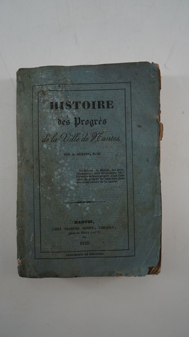 GUÉPIN (A.) - Histoire des progrès de la ville de Nantes - Nantes ; Prosper Sebire, 1832 - In-12° paperback (cover somewhat faded, 1st spine rubbed) - Slightly pink partial aureole on 1st few leaves - Ex-libris label on 1st back cover: Franck Villard.