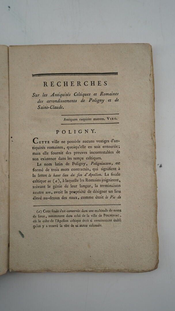 [JURA] - [SAINT-GEORGES (David de)] - Recherches sur les antiquités celtiques et romaines des arrondissements de Poligny et de Saint-Claude - Sans lieu ; Sans nom, 1804 - 1 pamphlet In-8° paperback in blue paperback cover (small marginal tears and spine consolidated with adhesive paper).