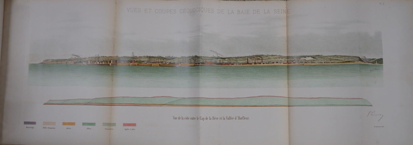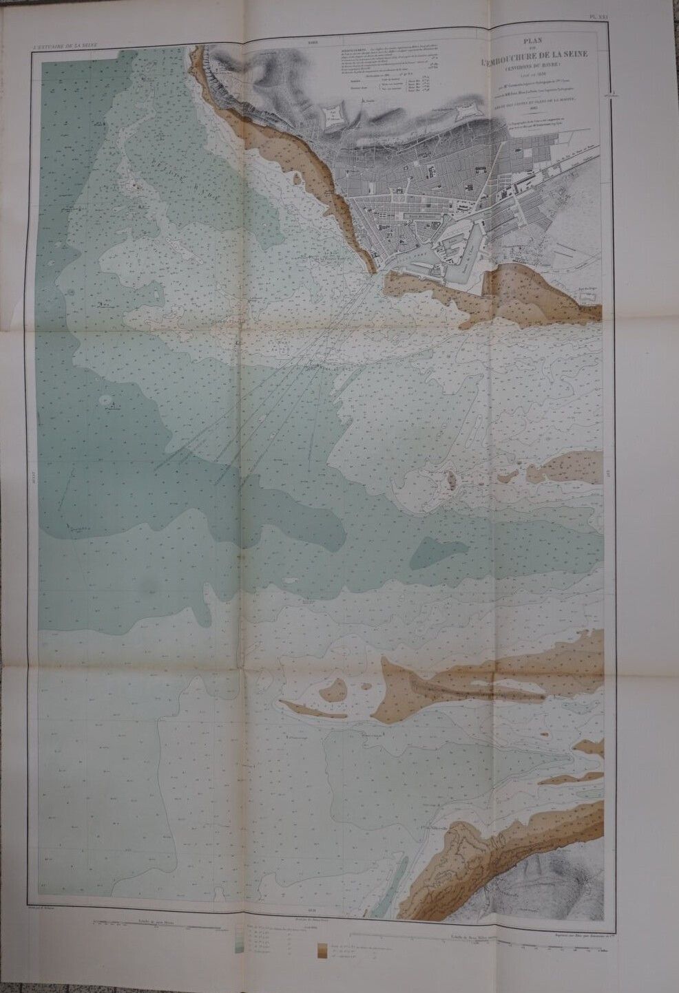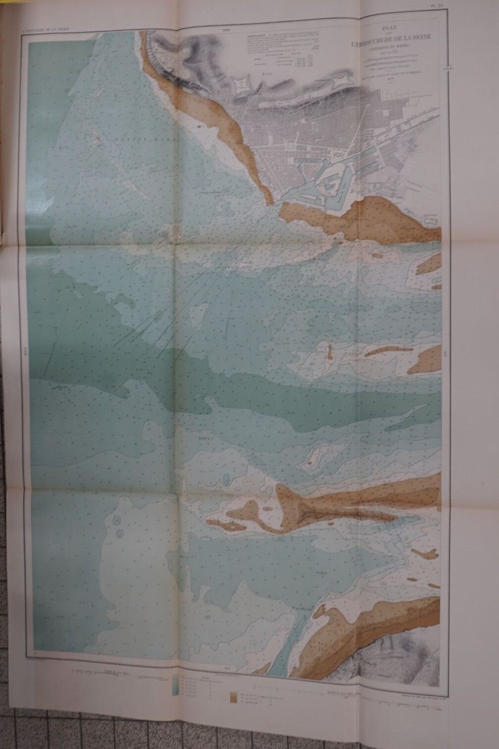 LENNIER (G.) - The Seine estuary. Mémoires ; notes et documents pour servir à l'étude de " L'estuaire de la Seine " Atlas - [Le] Havre ; Imprimerie du Journal Le Havre, 1885 - 1 volume In-folio - 6 large fold-out plates and 2 single plates in chromolithography, 8 lithographed plates in black (pale halos in outer margin of the latter), 2 fold-out lithographed maps in black (1 detached), 1 black map, 2 very large plans (1 with small tear consolidated on verso by adhesive paper), i.e. 22 plates (out of 32) - Bound in black half cloth (boards soiled, parts of spine and corners worn) - Fairly good copy - Rare.