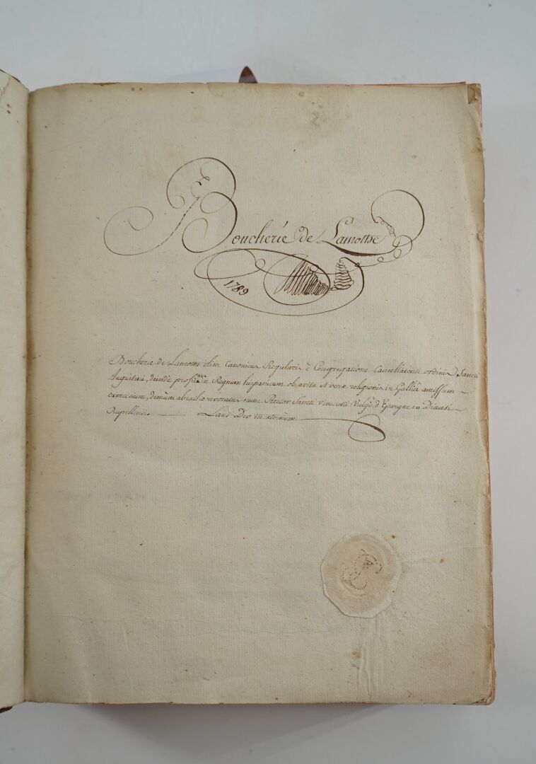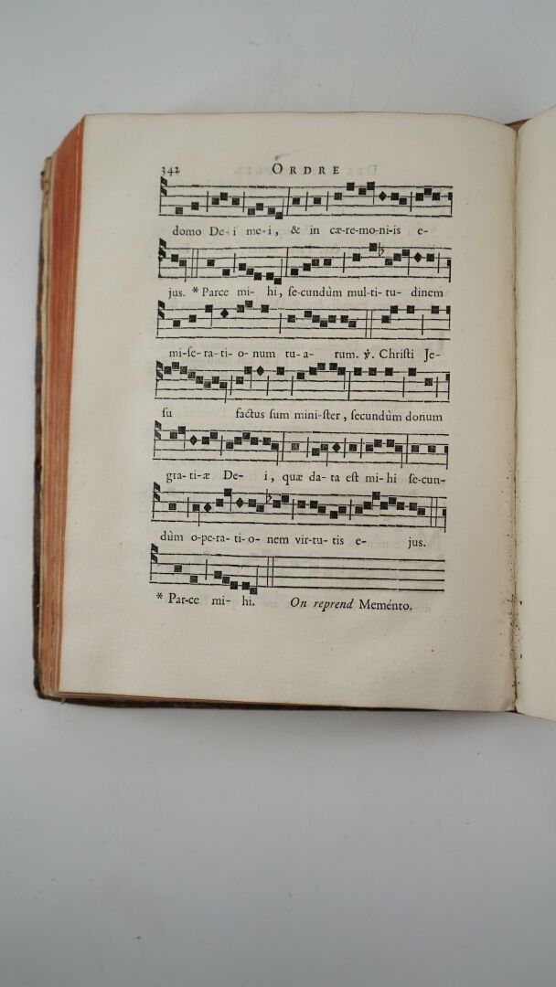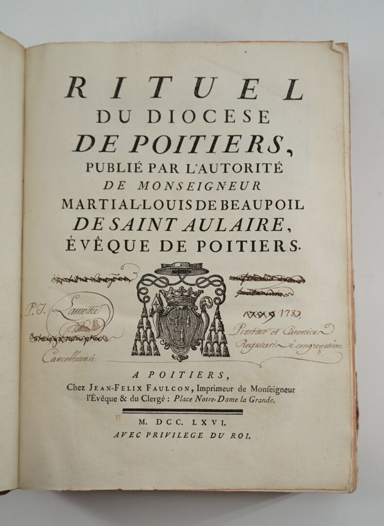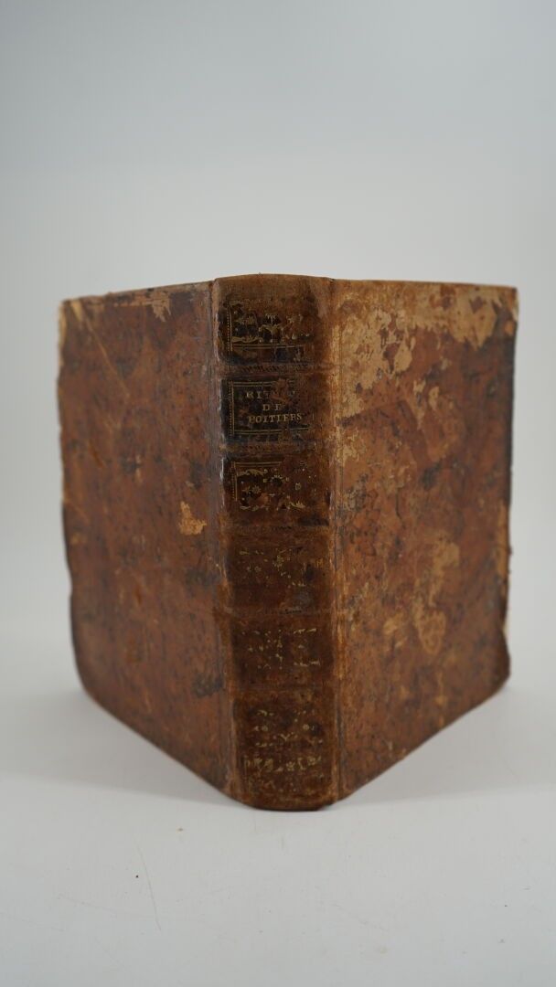 [RELIGIOSA] - Rituel du diocèse de Poitiers - Poitiers ; Jean-Félix Faulcon, 1766 - 1 volume In-4° - Notated music - Bound in contemporary marbled havana calf (spotting and loss of leather on covers and edges) - Spine ribbed and titled in gold (heavy spotting) - Red edges - Handwritten bookplate on the 2nd white endpaper and on the title where older ones are crossed out: Boucherie de Lamothe - Good condition inside.