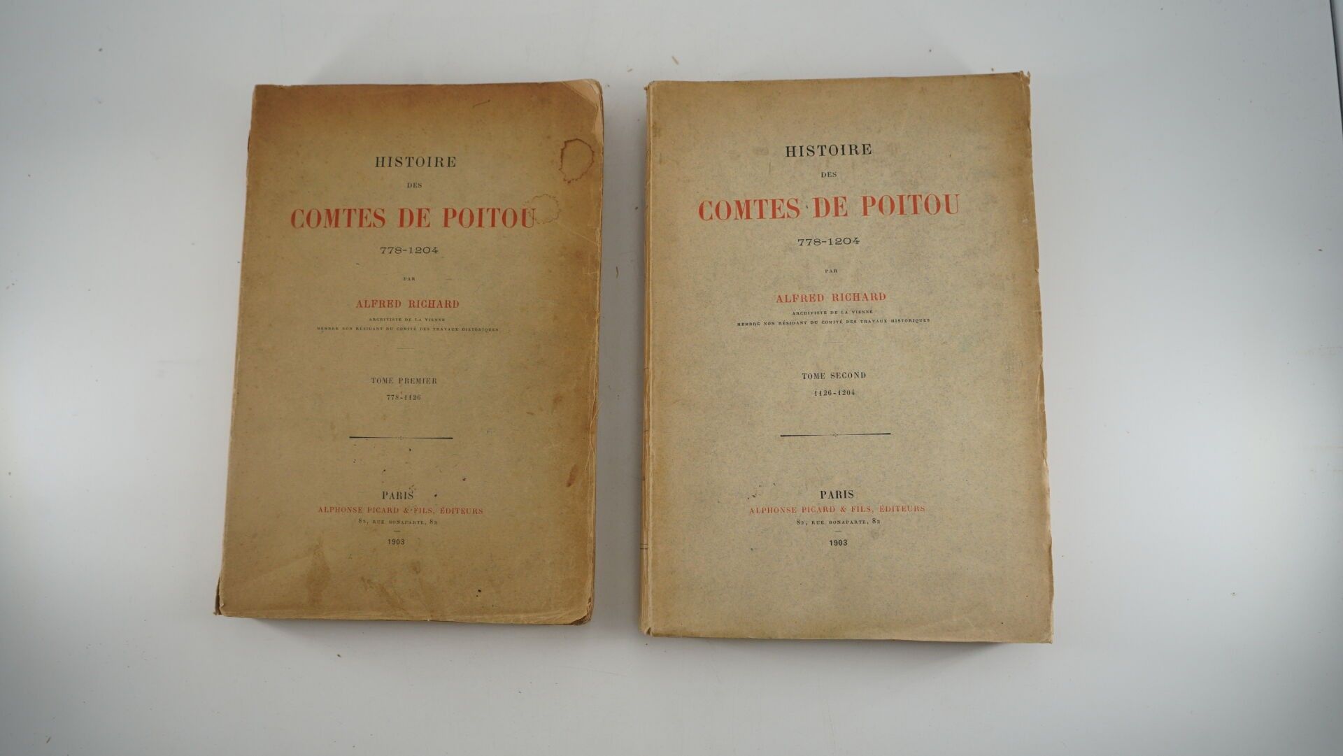 RICHARD (Alfred) - Histoire des Comtes du Poitou 778-1204 - Paris ; Alphonse Picard & Fils, 1903 - 2 volumes large In-8° paperback (covers slightly soiled, small loss to spine of volume I) - A good copy of this rare and sought-after first edition.