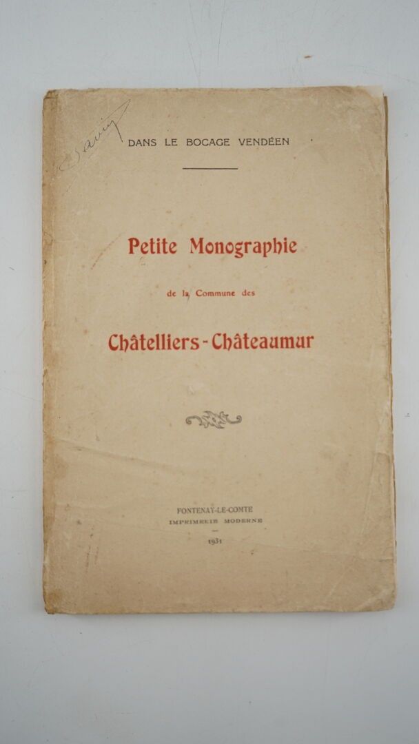 VALLOIS (X. de) - Dans le bocage vendéen. Petite monographie de la commune de Châtelliers-Châteaumur - Fontenay-le-Comte ; Imprimerie Moderne, 1931 - 1 volume In-8° paperback with printed cover (faded) - Annotations in pen on 1 page, Vignettes, photos and coat of arms in text - Fairly good copy.