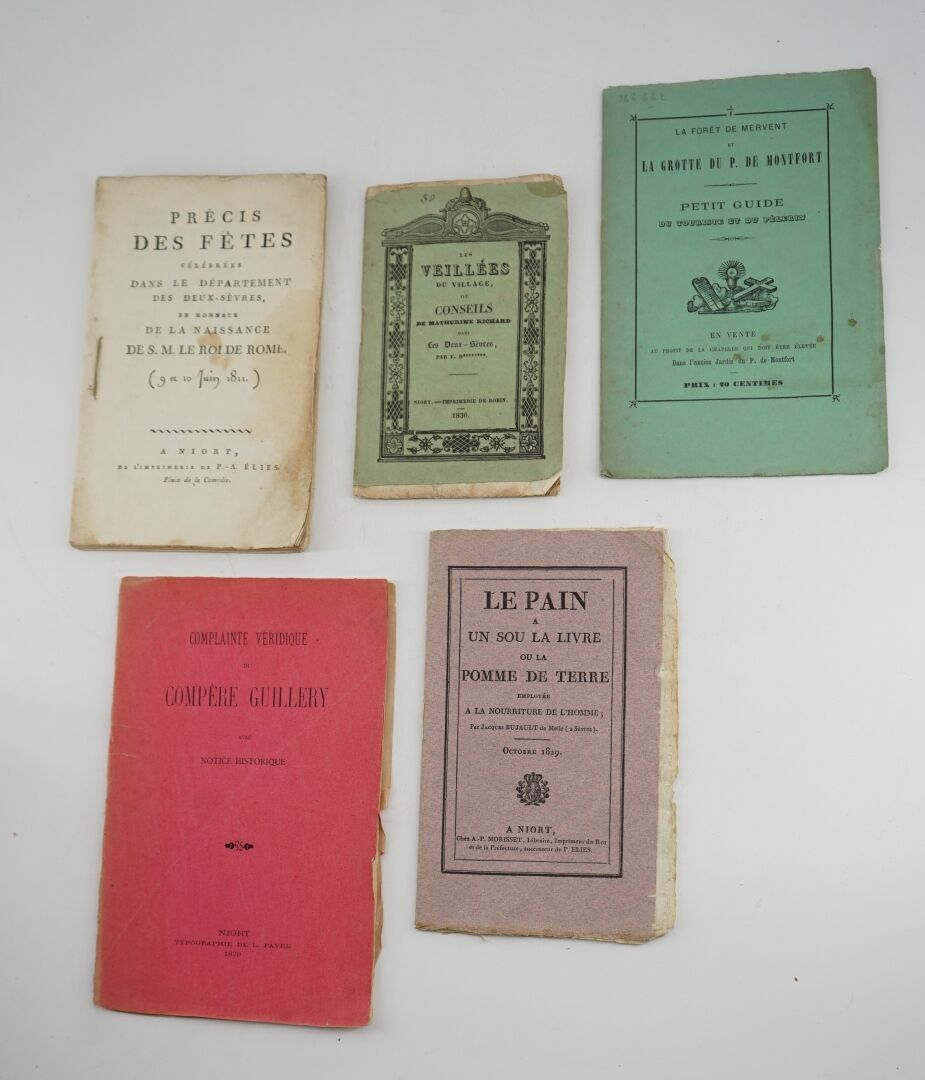 [VENDÉE] - Set of 5 paperback booklets - Précis des fêtes célébrées dans le département des Deux-Sèvres en honneur de la naissance de S. M. le Roi de Rome - Niort ; Imprimerie de P.-A. Élies, [1811] - In-12° - Paperback following: Hymn, ode, couplets et ronde poitevine, sur la naissance du Roi de Rome ; Imprimés par ordre de M le Baron Préfet des Deux-Sèvres - Niort ; Imprimerie de la Préfecture, [vers 1811] - F. D********** - Les veillées du village, ou conseils de Mathurin Richard dans les Deux-Sèvres - Niort ; Imprimerie de Robin, 1836 - In-18° - BUJAULT (Jacques) - Le pain à sou la livre ou la pomme de terre employée pour la nourriture de l'homme - Niort ; A.-P. Morisset, October 1829 - In-12° - La forêt de Mervent et la grotte du P. de Montfort. Petit guide du touriste et du pèlerin - En vente au profit de la chapelle qui doit être erecte dans l'ancien jardin du P. de Montfort, 1888 - In-12° - Complainte véridique du compère Guillery avec notice historique - Niort ; Typographie de L. Favre, 1879 - In-12° - Good set.