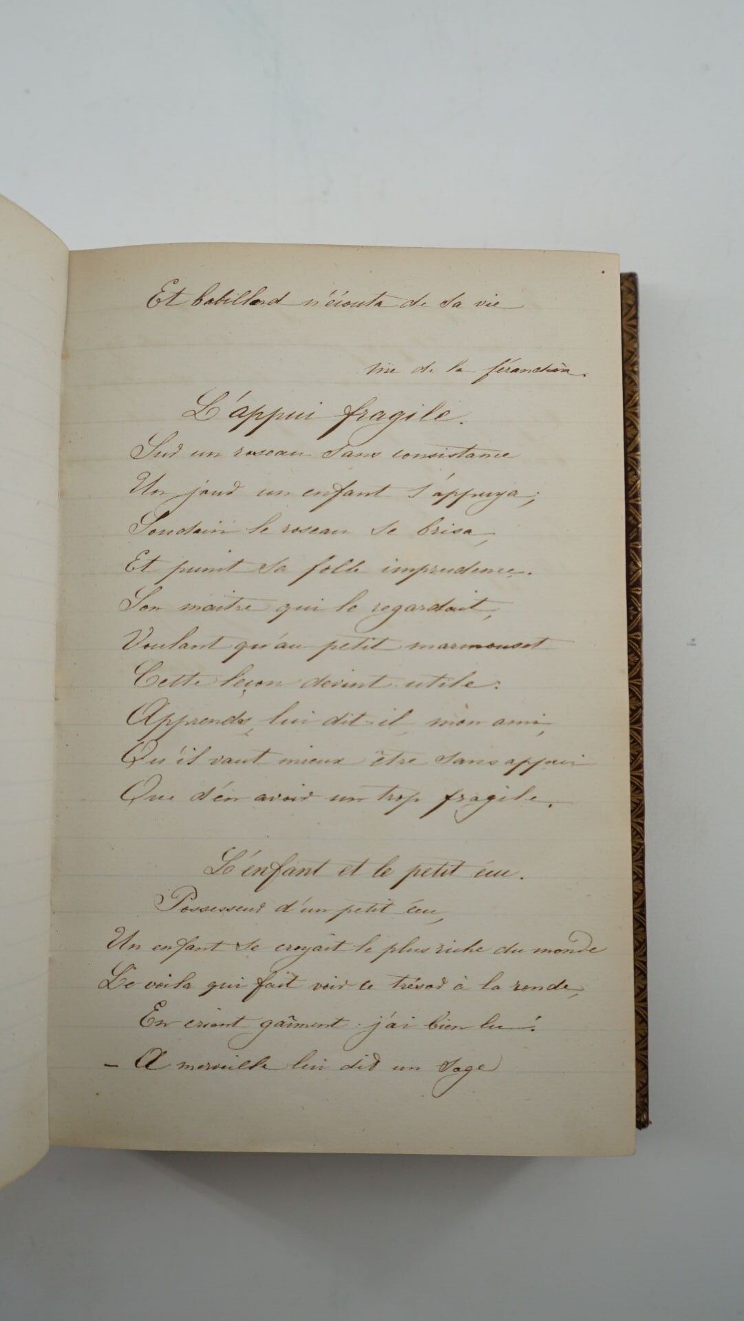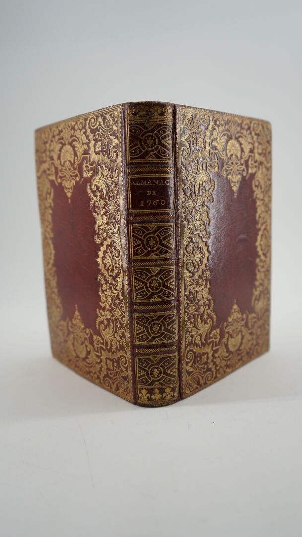 [MANUSCRIT] - In-8° almost blank notebook rebound in the 19th century containing 2 handwritten pages of recopied verses by Abbé Jean-Louis Aubert - Beautiful 18th century binding in burgundy morocco (paper of the boards and endpapers redone, hinges consolidated) - Boards framed with 1 double fillet and decorated with 1 large gilt plaque - Spine with false nerves decorated and titled Almanach de 1760 - Speckled edges - Good condition.