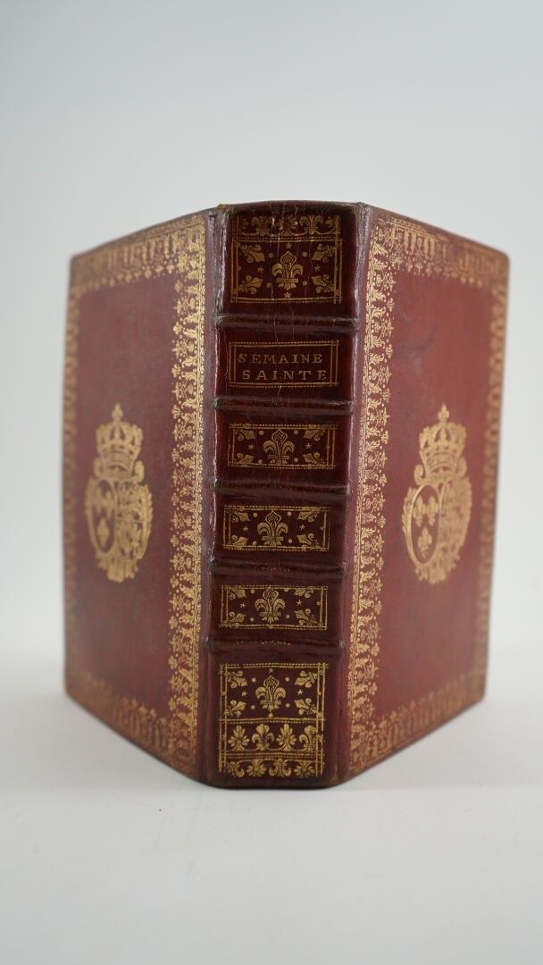 [RELIURE AUX ARMES ROYALES] - L'office de la Semaine Sainte, en latin et en françois - Paris ; Jean-Baptiste Garnier, 1752 - 1 volume In-8° - 1 engraved plate out of text - Beautiful contemporary red morocco binding (corners nicely restored) - Large framing lace and arms of Queen Marie Leszczynska, wife of Louis XV, in the centre of the boards - Spine ribbed with gold fleur-de-lys and titled (headpieces nicely restored) - Gilt edges - A very good copy.