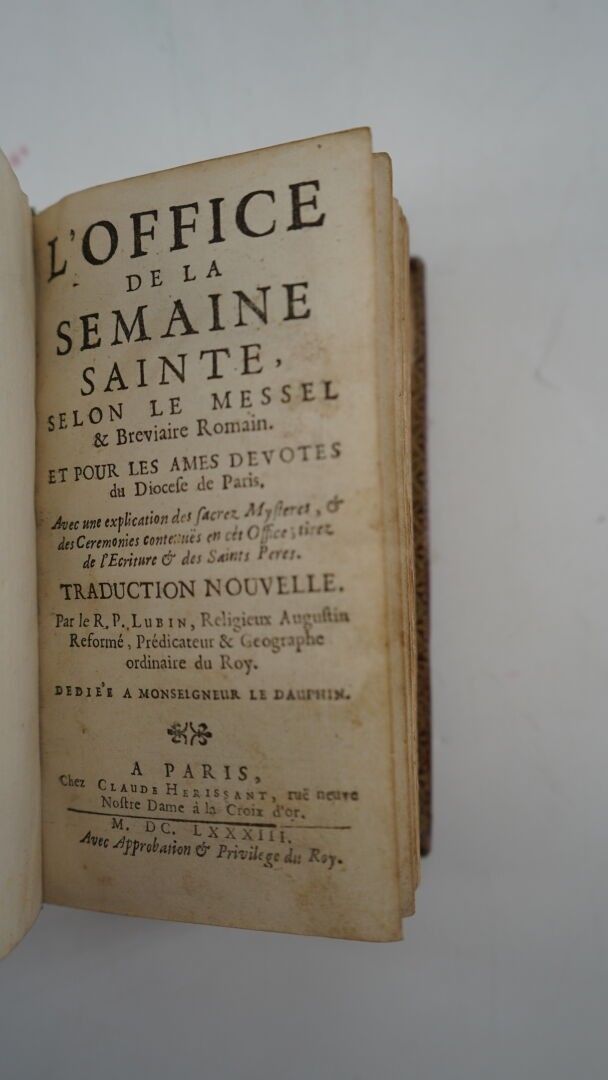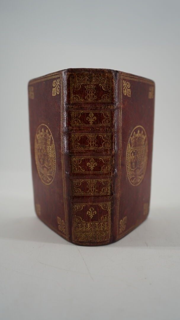 [BOOKBINDING] - L'office de la Semaine Sainte, selon le Messel & Bréviaire Romain [...] - Paris ; Claude Hérissant, 1683 - 1 large volume In-12° - Beautiful contemporary binding in garnet morocco (corners nicely restored, some sections out of order) - Triple fillet, angular fleur-de-lys and arms of the Dauphin Louis de France, in the centre of the boards - Spine ribbed with fleur-de-lys and crowned figures - Gilt edges - Handwritten bookplate on the 2nd white endpaper: Melle de Cerquieux - A good copy