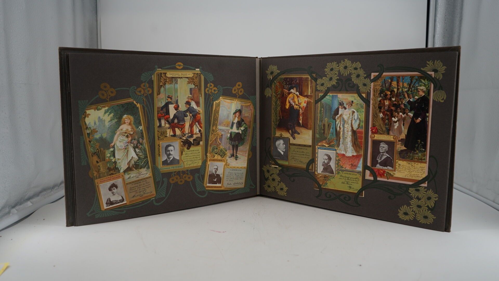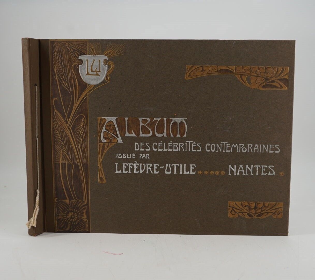 [ALBUM LEFÈVRE-UTILE] - Album des célébrités contemporaines - Nantes ; Lefèvre-Utile, [circa 1900] - 1 large oblong In-4° volume containing 48 beautiful chromolithographed and embossed cards presenting various celebrities of the period such as Harpignies, Galipaux, Benjamin Rabier, Jane Hading, Lise Landouzy, Grun, Théodore Botrel, Jeanne Raunay, Georges Feydeau, Albert Guillaume, François Coppée, J. Massenet, Jean Richepin, Alphonse Allais, ... with photographic portraits and autograph facsimiles. Massenet, Jean Richepin, Alphonse Allais, ... with photographic portraits and facsimiles of autographs - The album is missing 8 cards in fine - Attractive publisher's half tan cloth binding decorated and titled in silver and gold on the boards - A good copy.