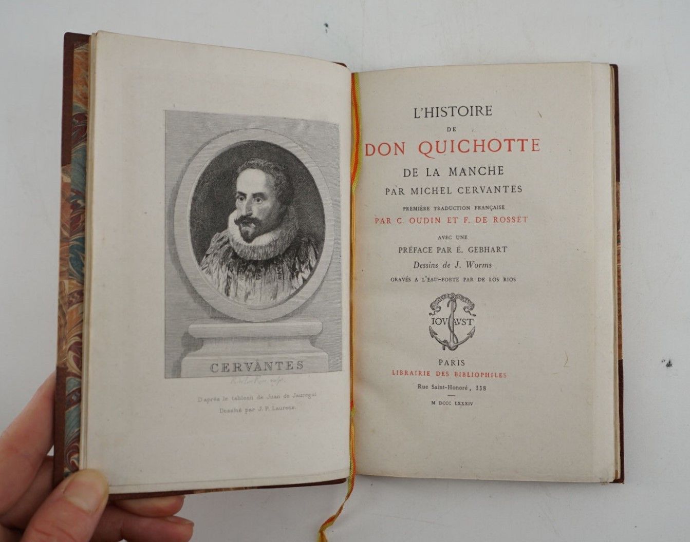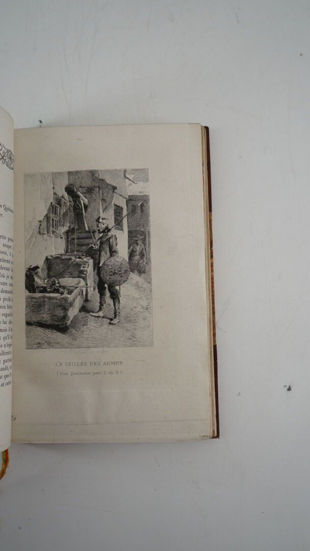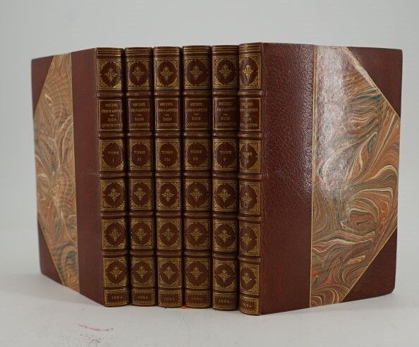 CERVANTÈS (Saavedra Miguel de) - L'histoire de Don Quichotte de la Manche - Paris ; Librairie des Bibliophiles, 1884 - 6 volumes In-12° - Portrait frontispiece after the painting by Juan de Jauregui drawn by J. P. Laurens and 17 out-of-text compositions in black by J. Worms engraved in etching by de Los Rios - Beautiful contemporary binding in half havana morocco with corners by Victor Champs - Covers and spines preserved - Spines nicely decorated, titled, tomé and dated in gold - Heads gilt - A very fine copy of this attractive edition of the 1st French translation by C. Oudin and F. de Rosset including 1 editor's note and 1 long preface by Émile Gebhart. numbered on Chine (n°22 of 20, total numbered edition: 220) with 2nd state of the engravings.