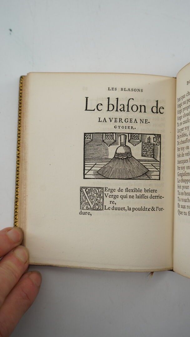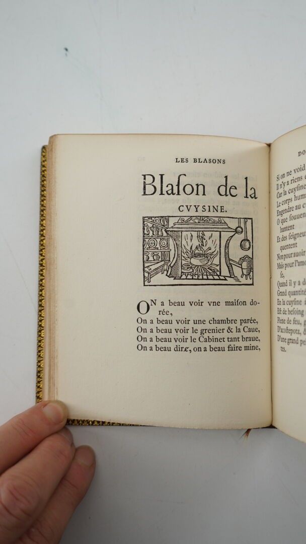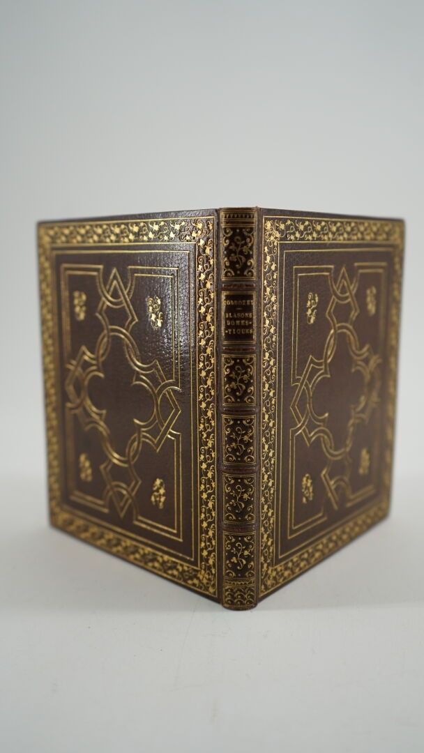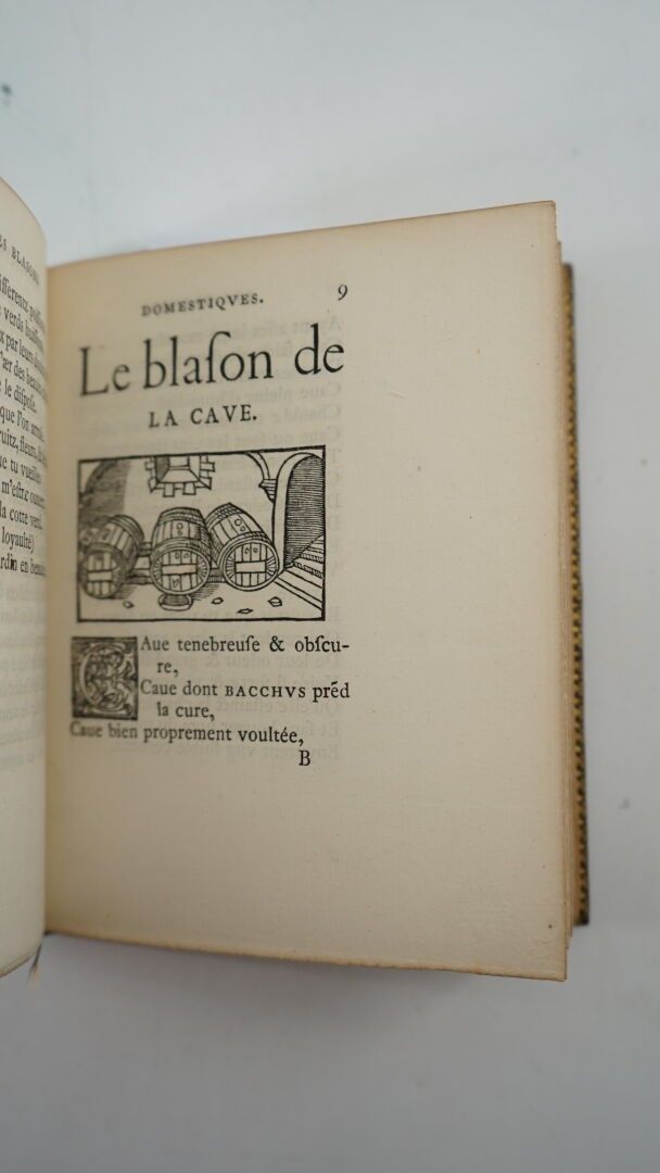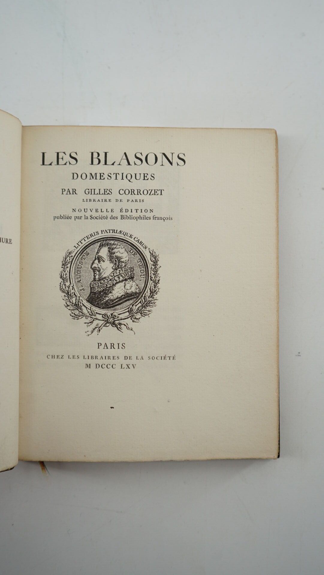 CORROZET (Gilles) - Les blasons domestiques - Paris; Les Librairies de la Société, 1865 - 1 volume In-18° - Portrait in medallion on the title, entablature, lettering and 26 woodcut vignettes in text from the 1539 Edition - Very fine period binding in brown morocco - Boards framed with fillets and 1 floral frieze, Very fine copy of this new edition printed in a small number, published by the Société des Bibliophiles françois, in which the house, the garden, the cellar, the kitchen, the attic, the bed, the broom, the mirror, the study, ... are celebrated in verse. Headed by a list of members of the Société des Bibliophiles françois in 1875.